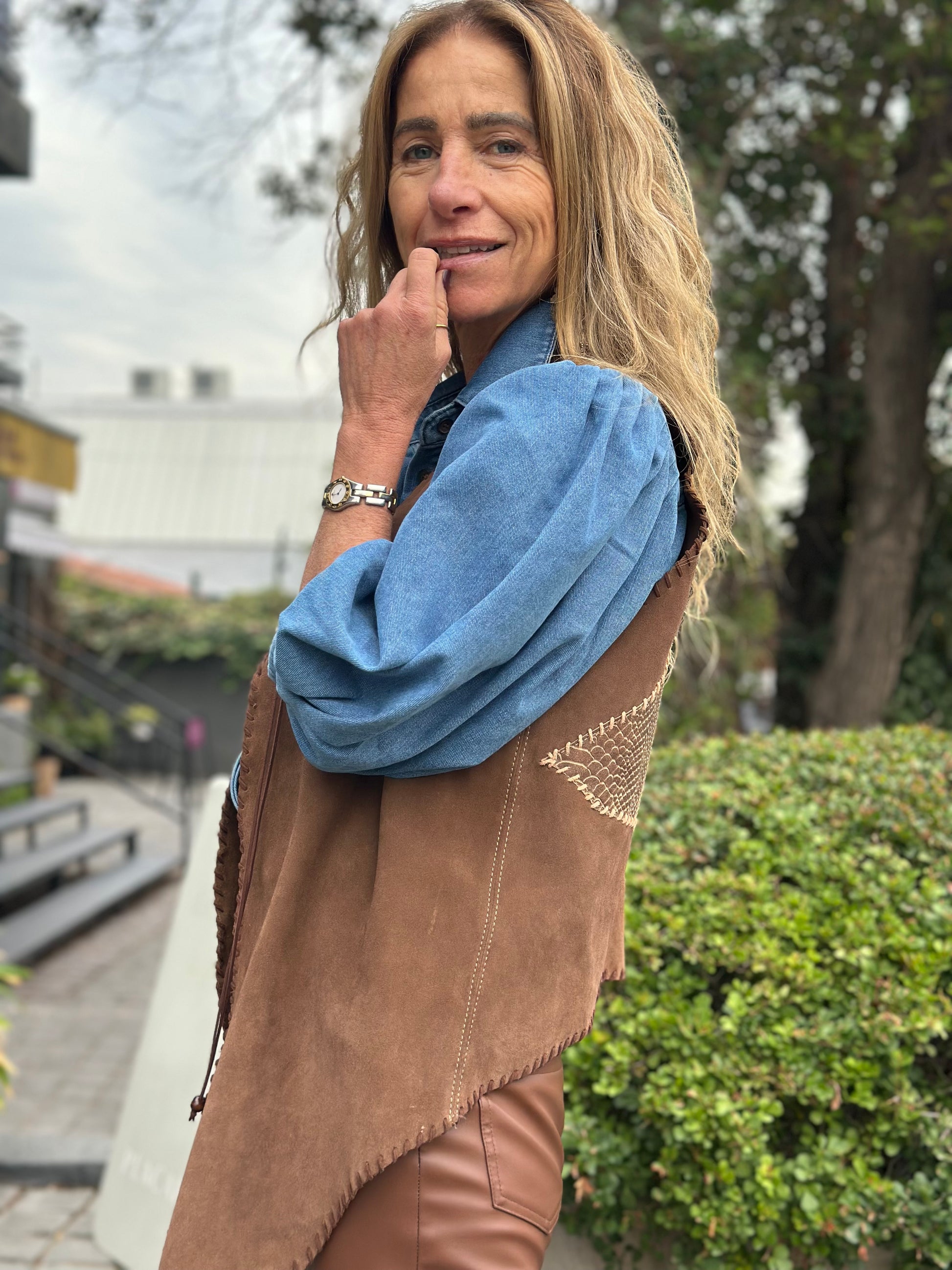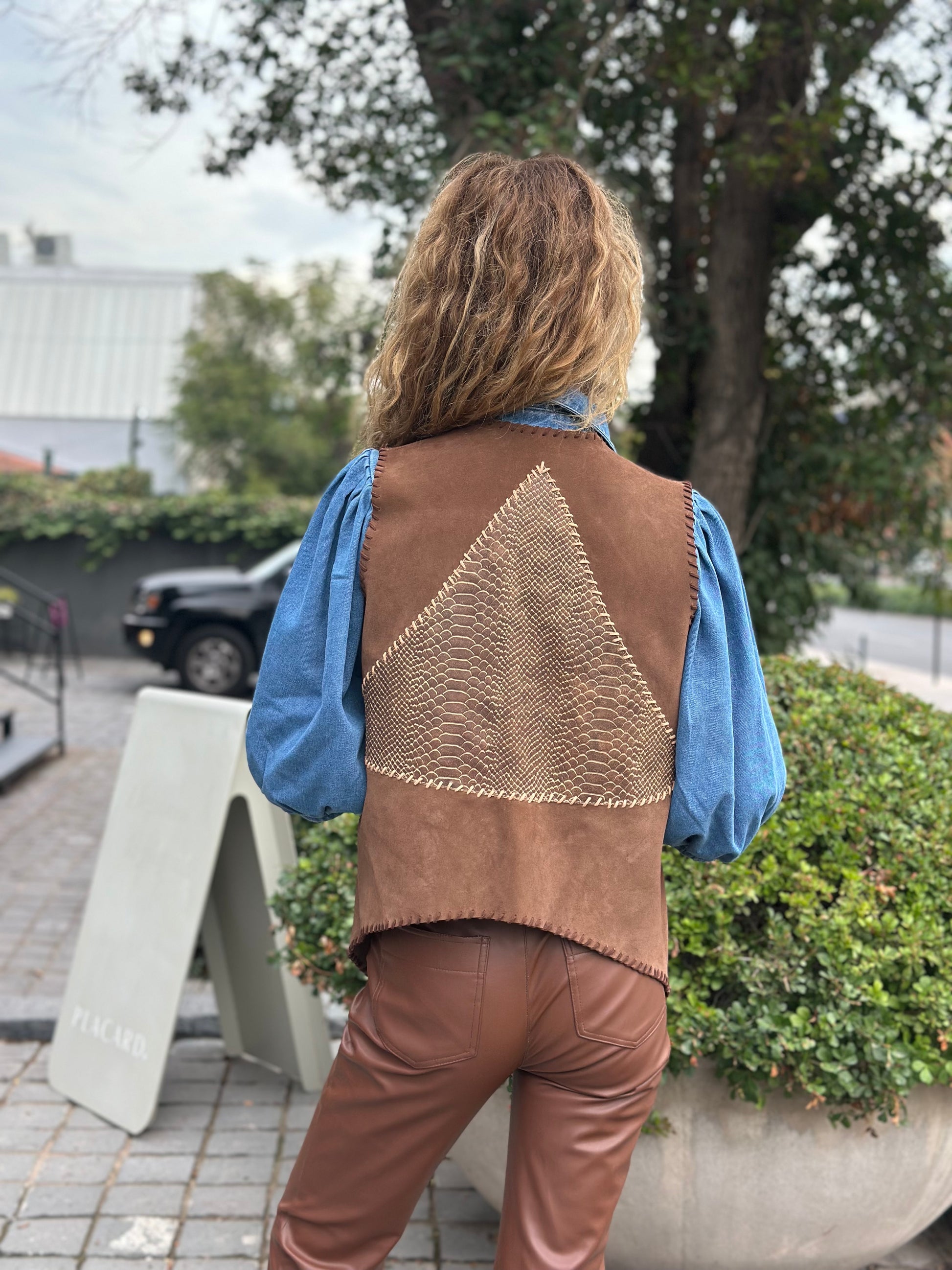 Este camper Berni combina gamuza tabaco con una aplicación en la espalda en cuero croco café. Su diseño distintivo presenta un ribeteado en la parte delantera en gamuza café, creando un contraste increíble que realza la estética de esta chaqueta. Confeccionada con materiales seleccionados para ofrecer un estilo excepcional.