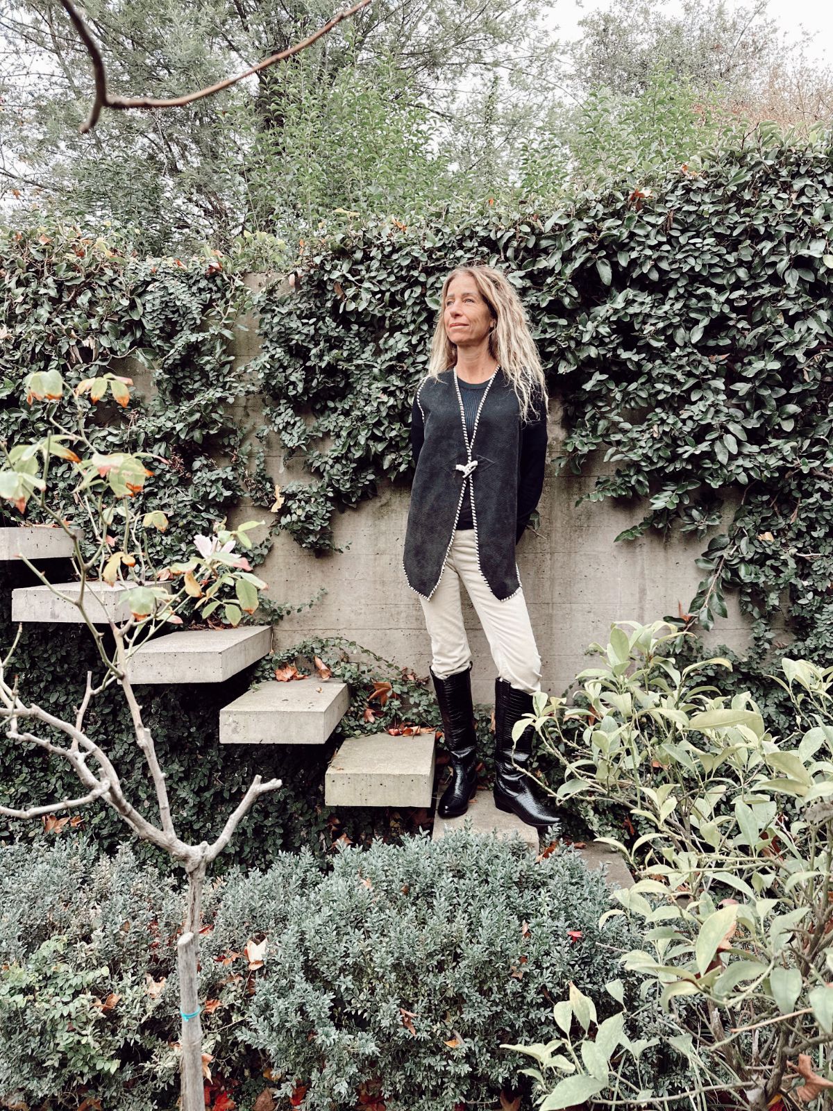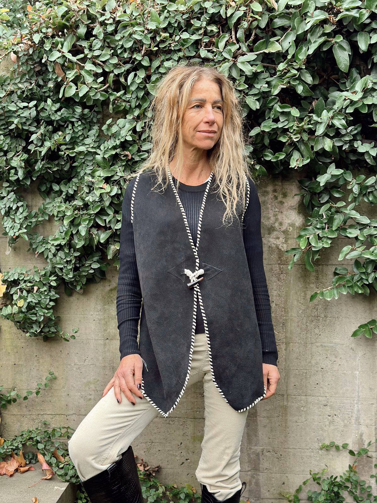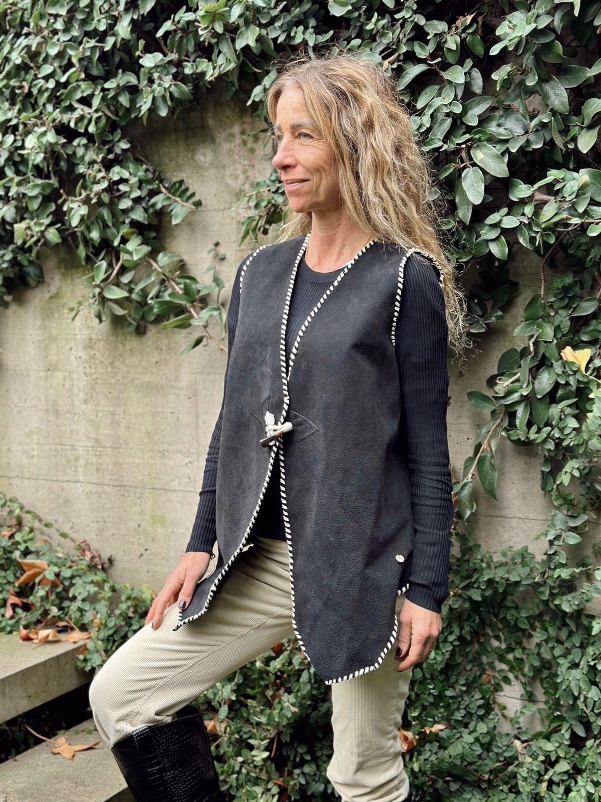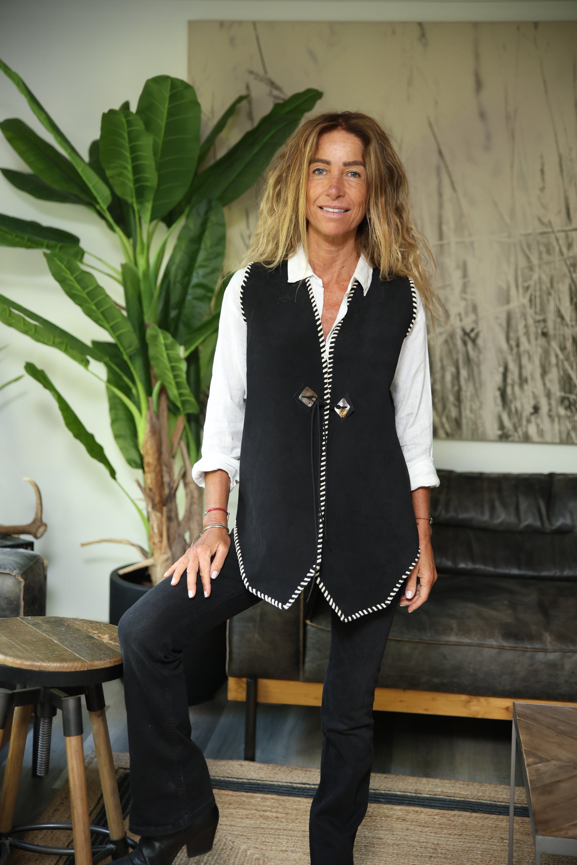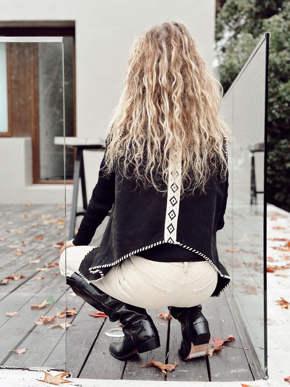 El Camper Berni en negro tiene un diseño único. La parte frontal tiene una aplicación para usarla abierta o cerrada y en la espalda un bordado maravilloso en rombo. Junto con esto, todo su borde va con un embarrilado en gamuza color crudo.