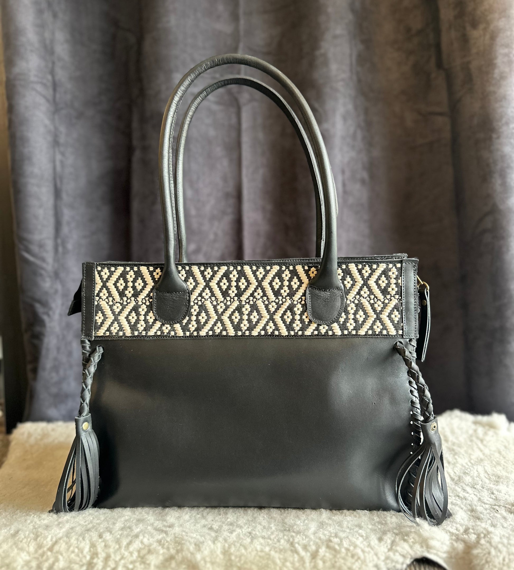 Esta cartera Aurora está confeccionada en cuero liso color negro, tiene un detalle que cruza el frente con la parte de atrás que va en cuero trenzado y con flecos además tiene un bolsillo delantero y una aplicación de tejido textil que le da una onda absolutamente rural.