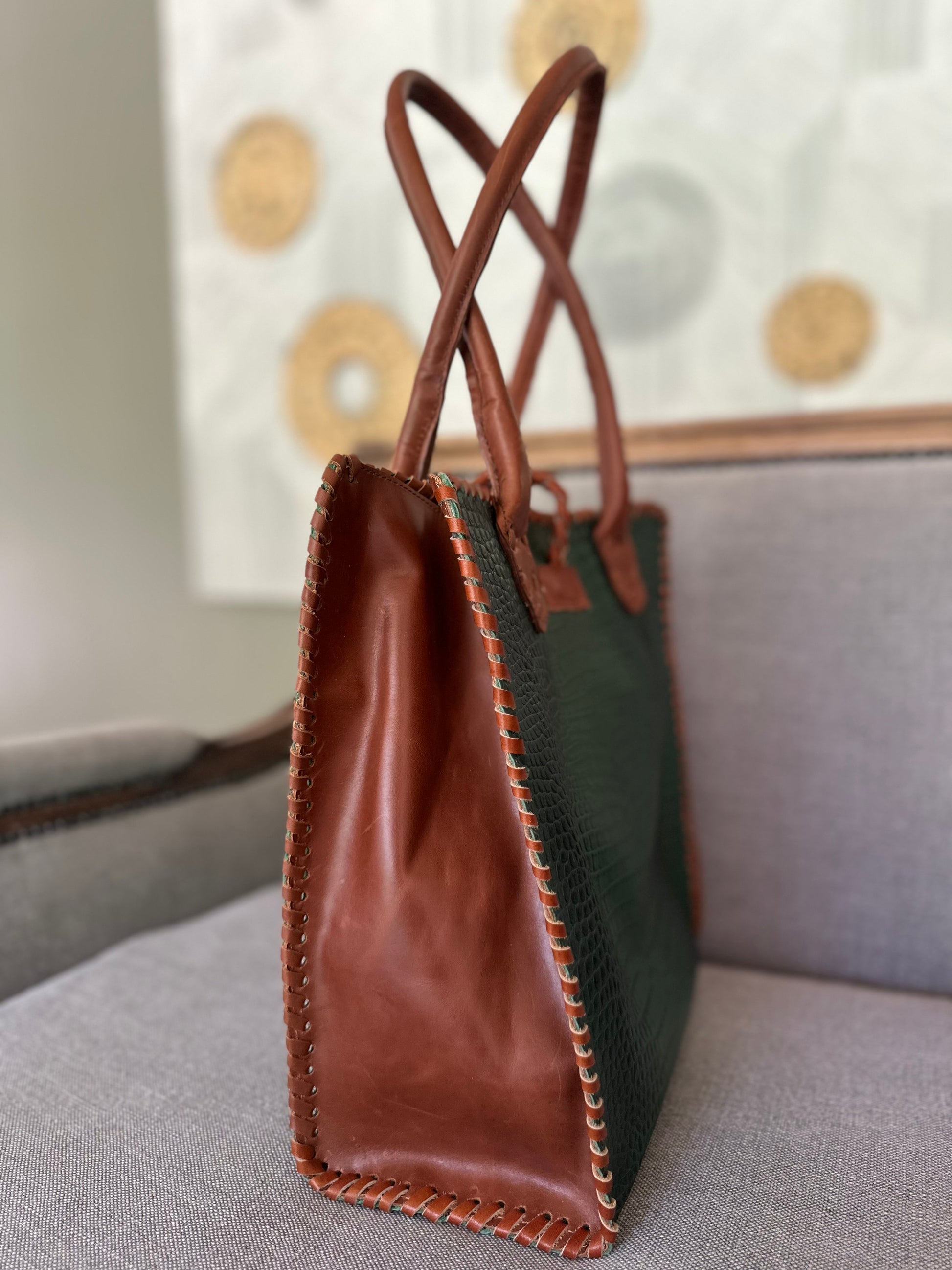Esta cartera Violeta es una pieza de diseño excepcional que fusiona texturas y tonalidades de forma magistral. Combina cuero croco en tono verde con cuero liso en tono café oscuro, creando un contraste visual maravilloso. Esta mezcla de materiales y su paleta cromática equilibrada la convierten en una cartera versátil, capaz de complementar tanto looks casuales como formales. Un accesorio que refleja buen gusto y atención al detalle.