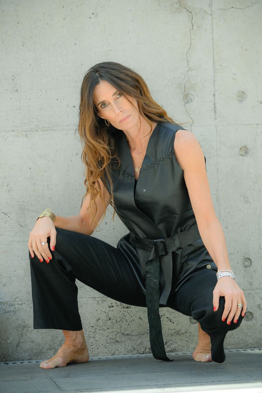 Cazadora en cuero negra cruzada. Se cierra con su cinturón con hebilla en el mismo color. Su espalda está trabajada con un diseño de igual tono. Perfecta para un look más formal o casual.