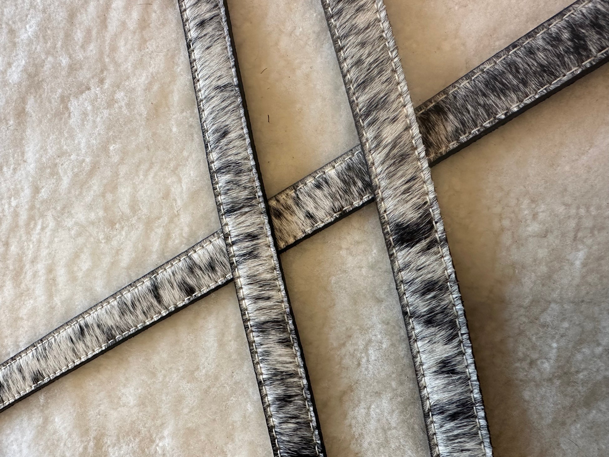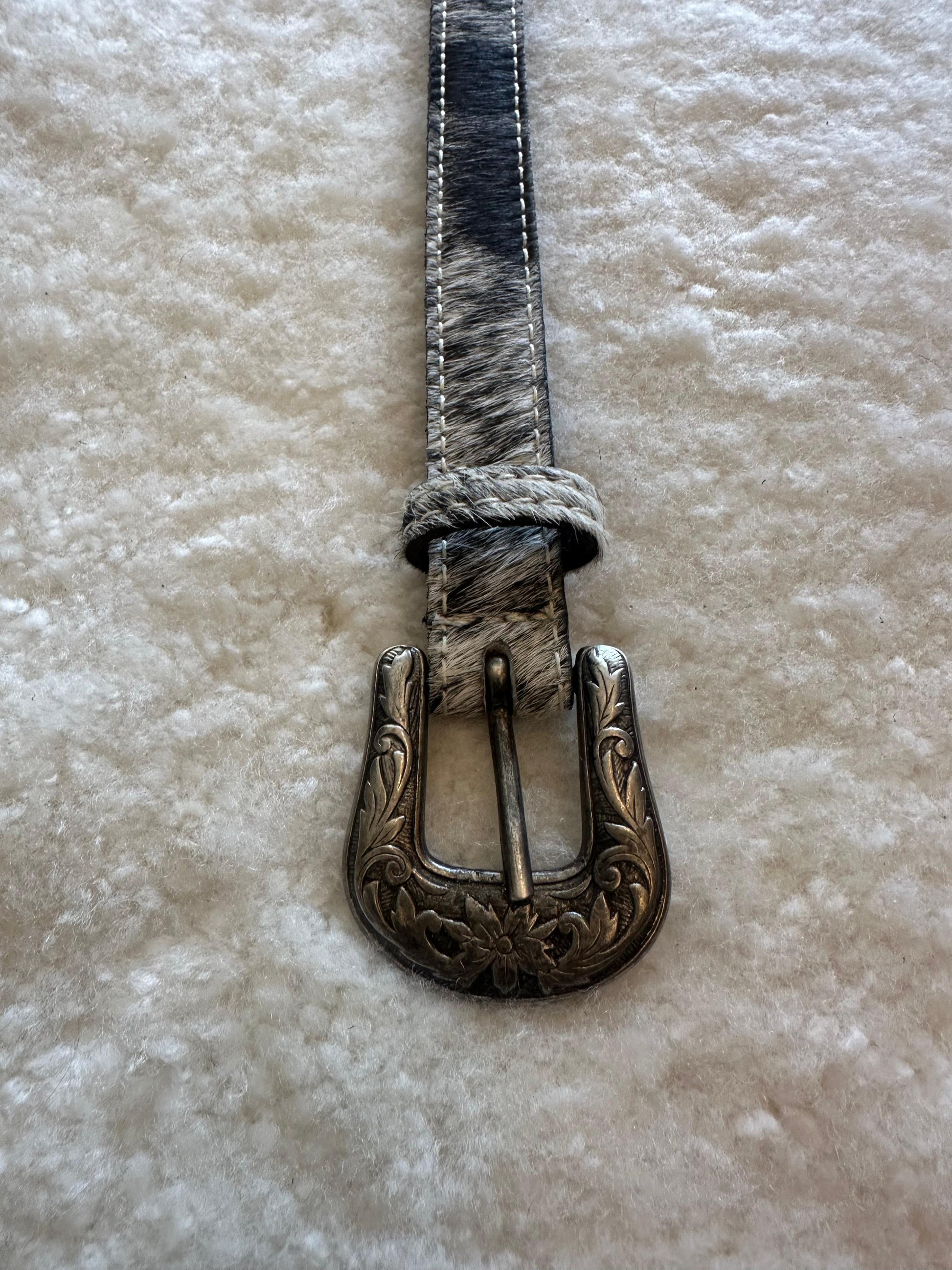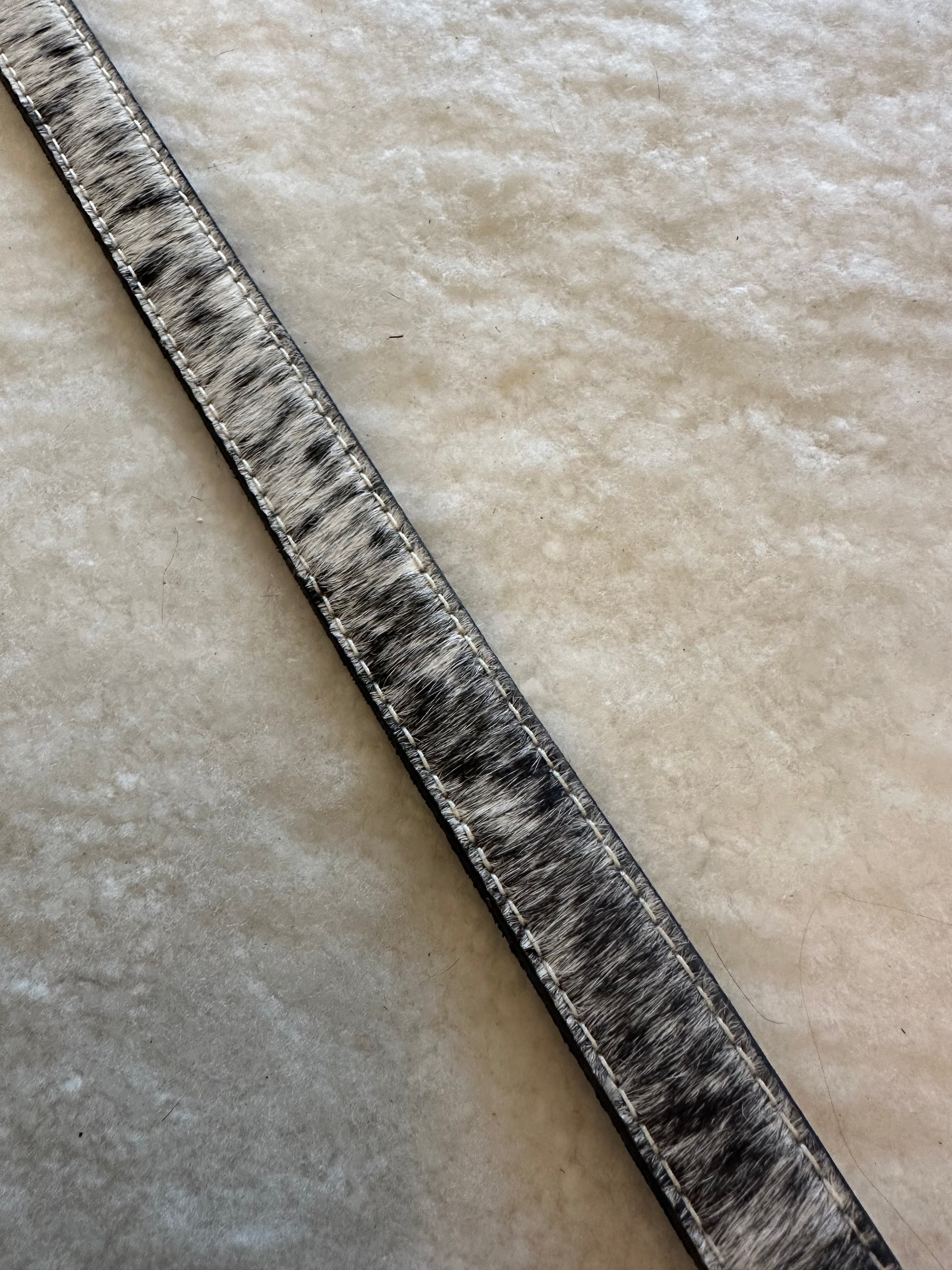 Este cinturón Beatriz combina elegancia y estilo con su diseño en pelo negro y blanco, complementado por una hebilla en plata que da un toque distintivo, ideal para quienes buscan un accesorio versátil y con carácter.