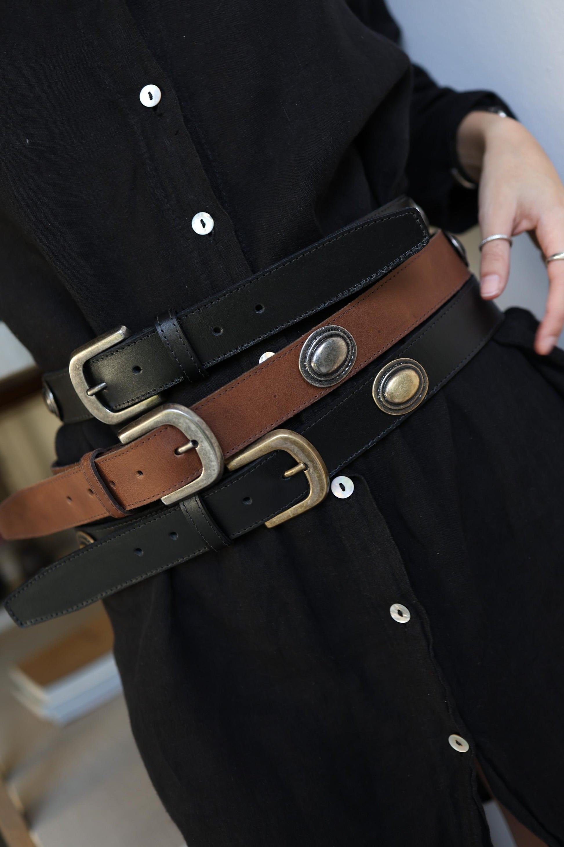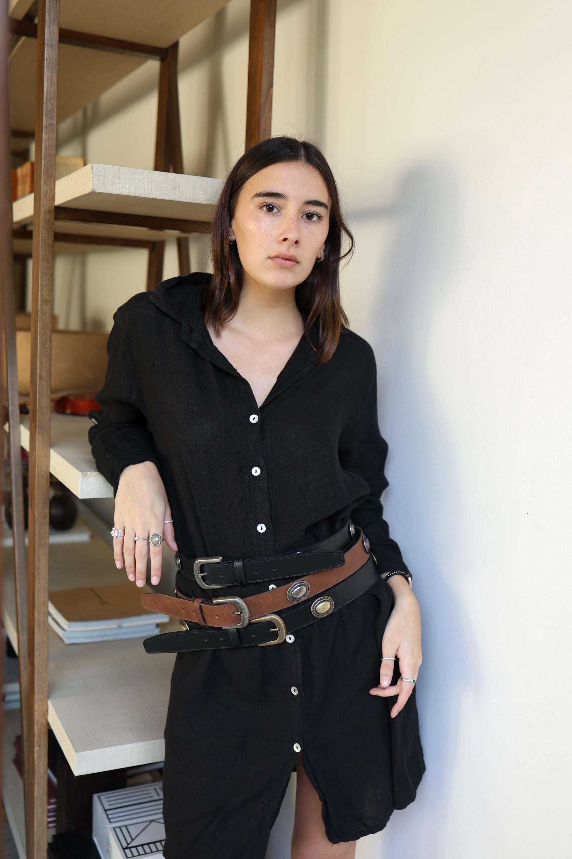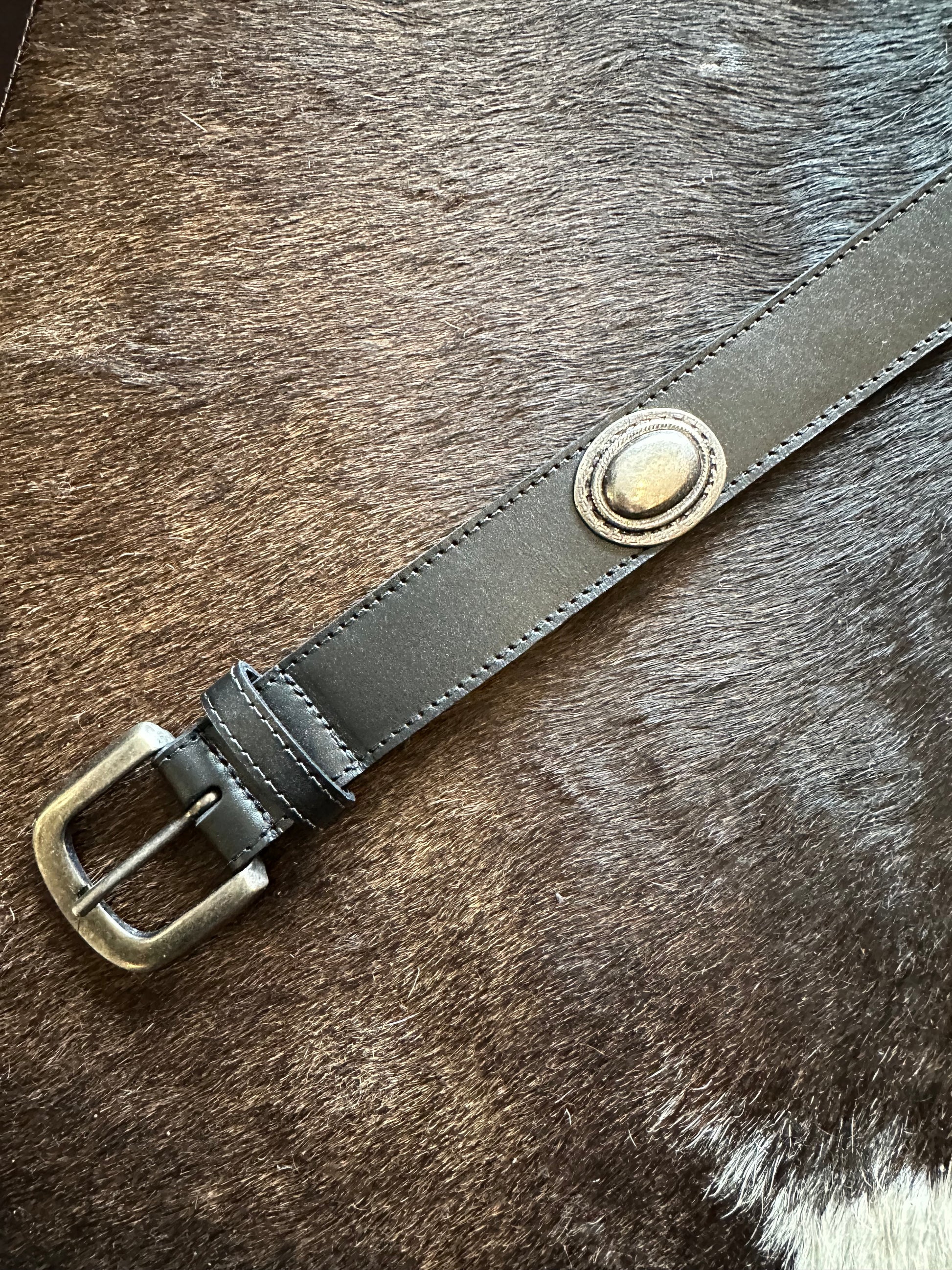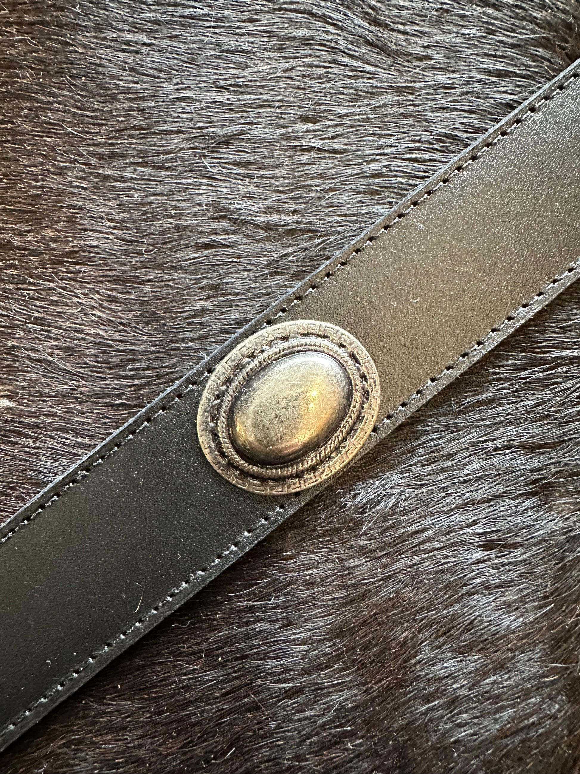 Cinturón Elisa hecho en cuero negro, con un bonito remache ovalado plata (paso 3,5cm).
