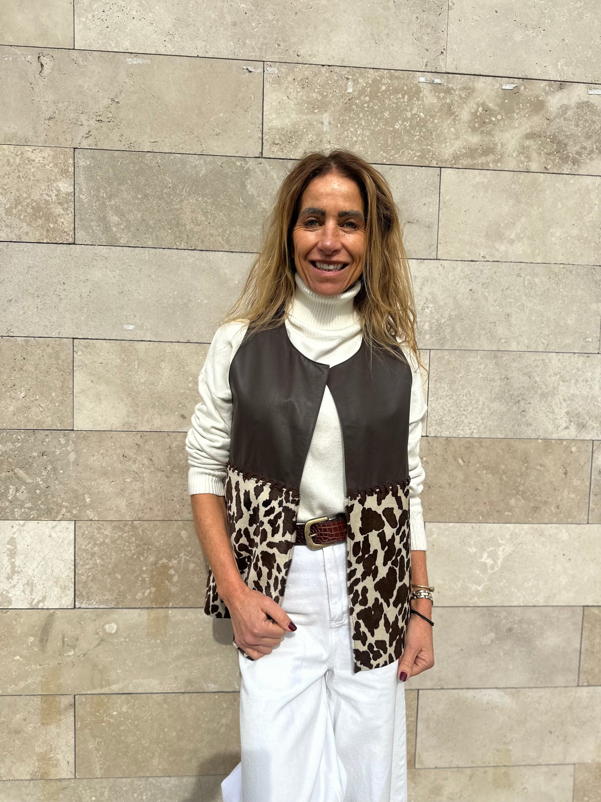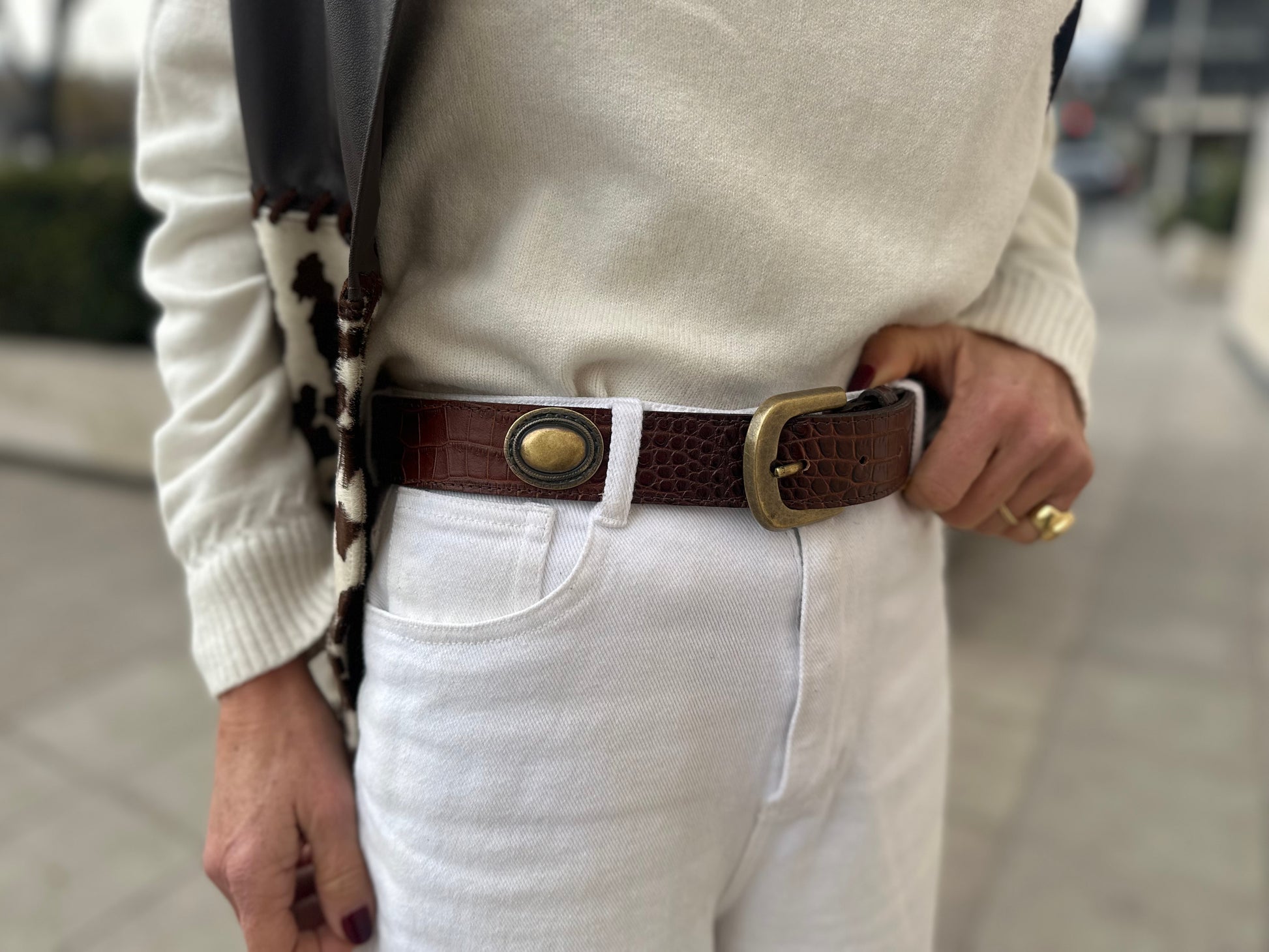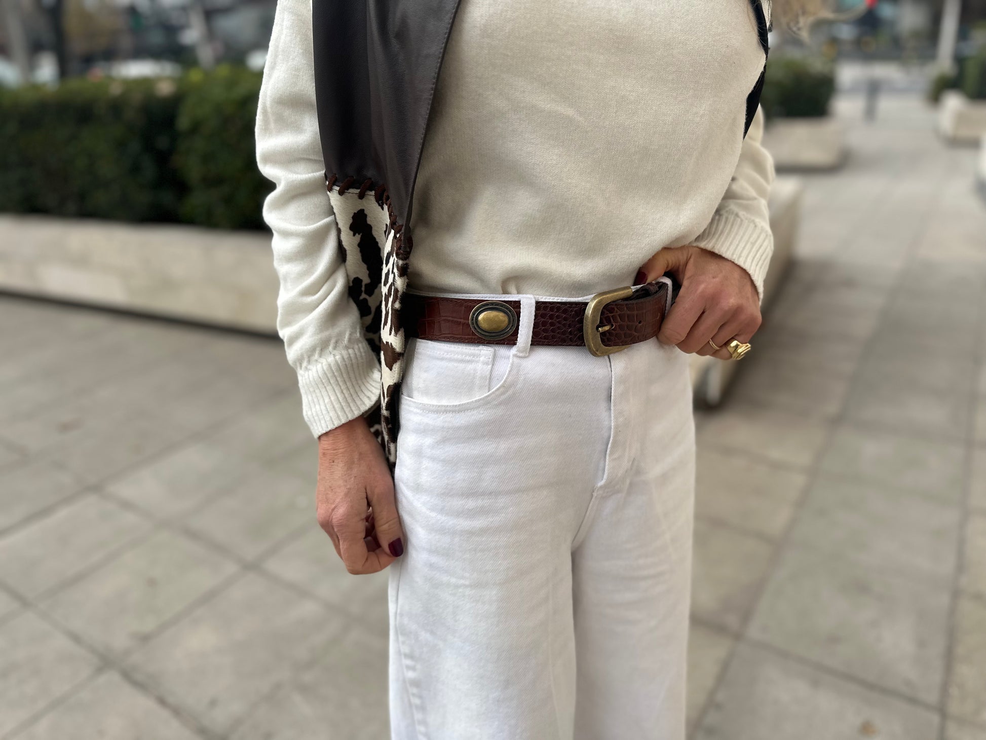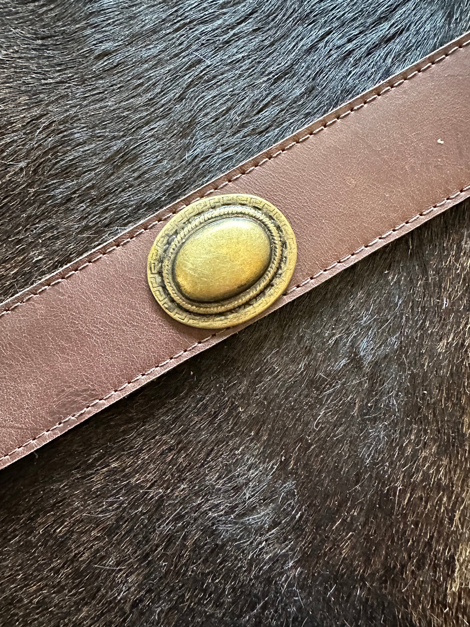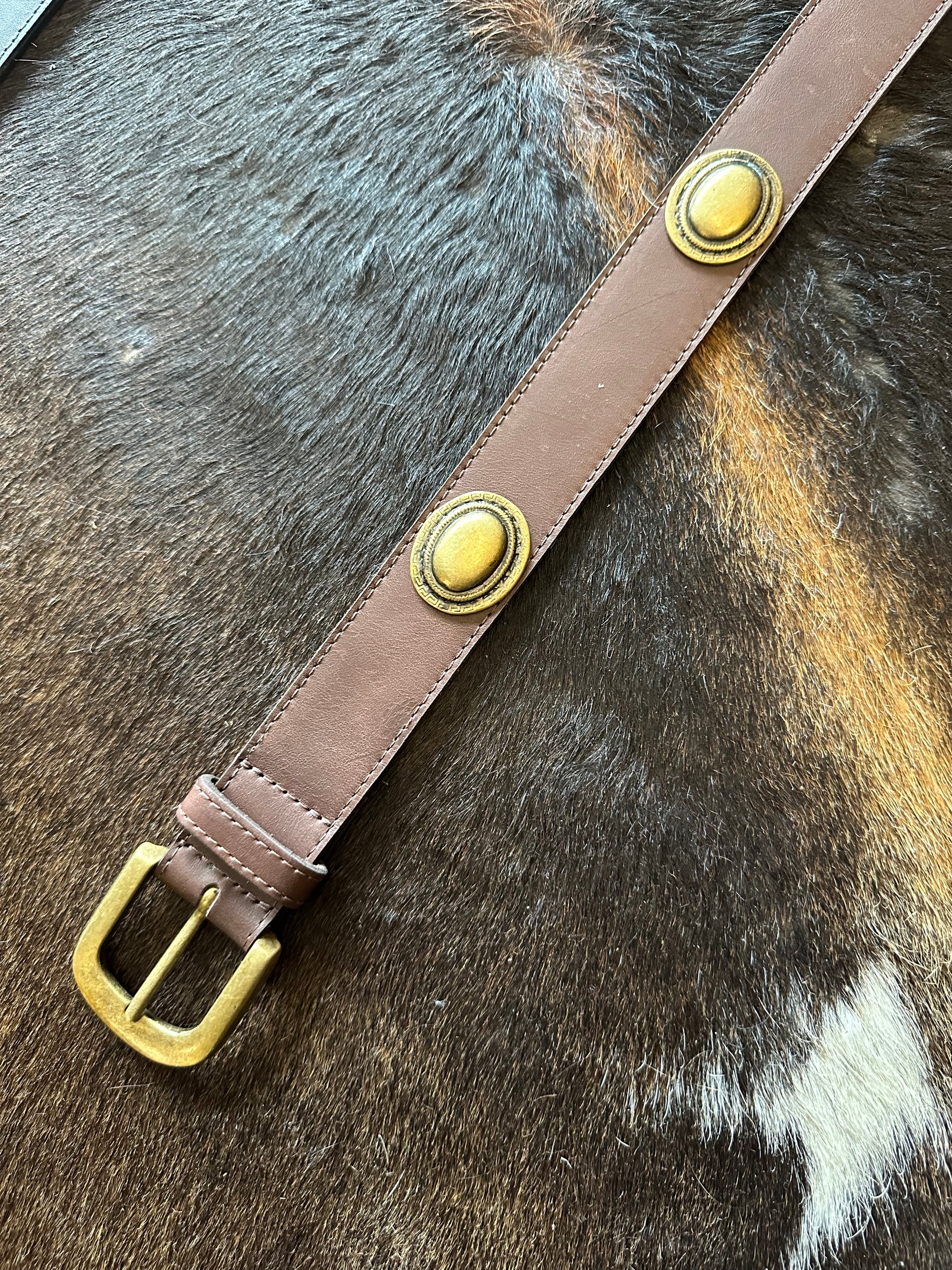 Cinturón Elisa hecho en cuero café oscuro, con un bonito remache en dorado (paso 3,5cm).