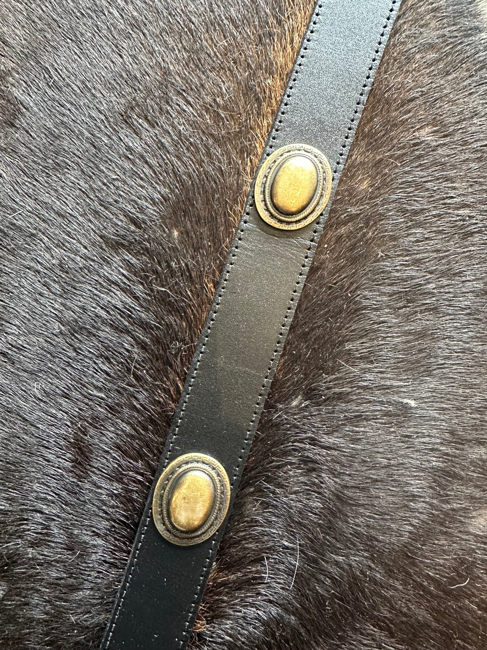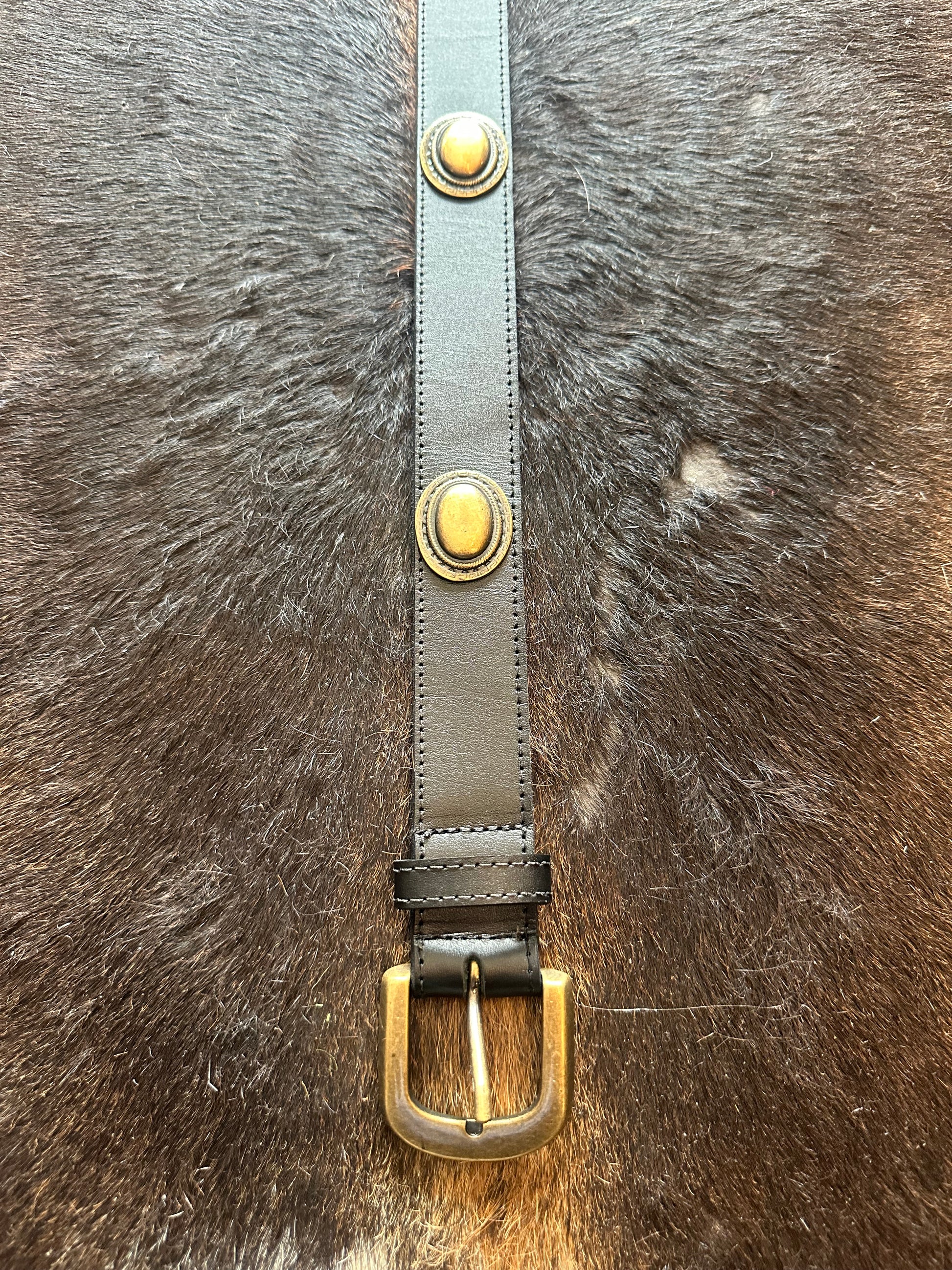 Cinturón Elisa hecho en cuero negro, con un bonito remache ovalado dorado (paso 3,5cm).