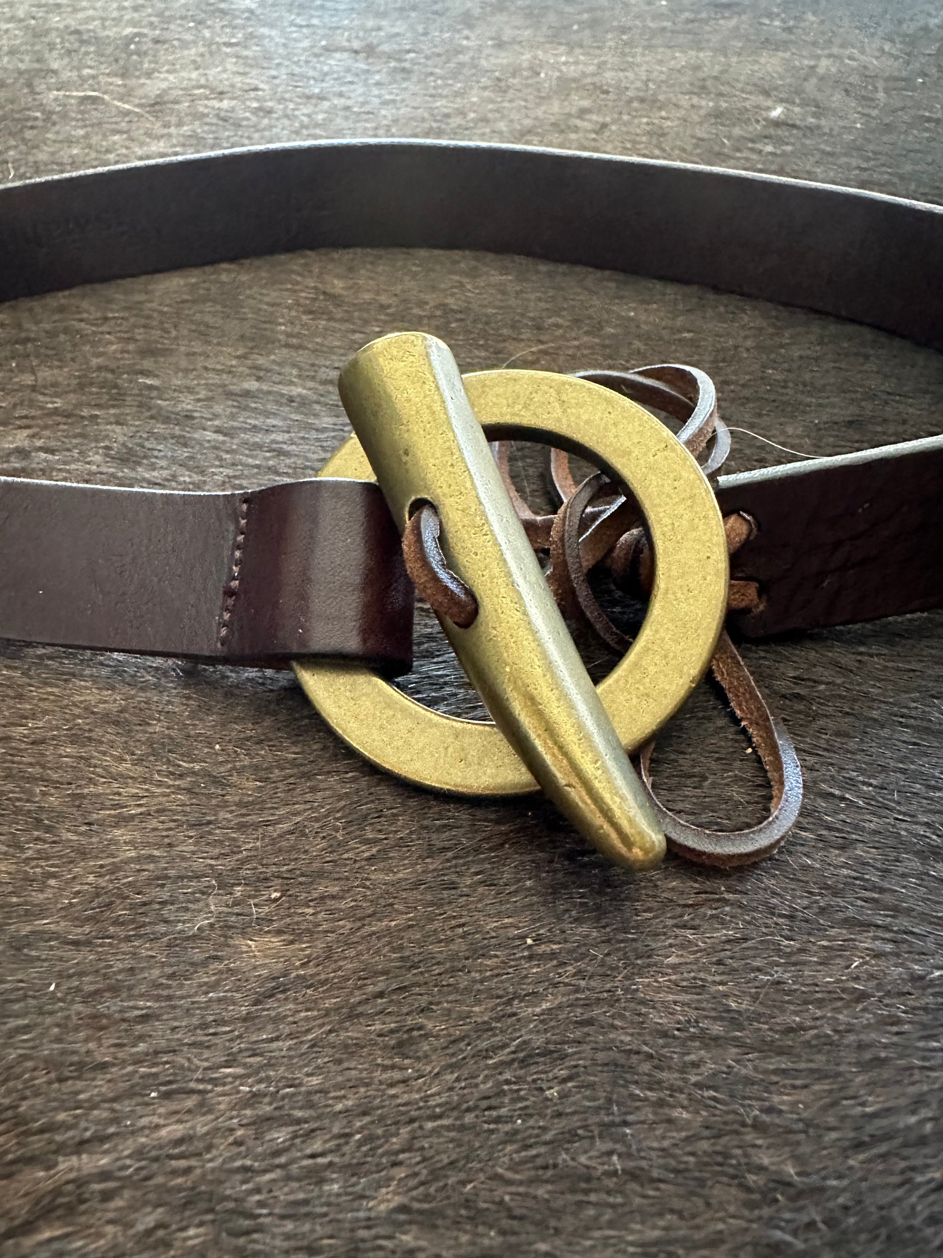 Cinturón en cuero color chocolate. Cuenta con una maravillosa hebilla de bronce circular y cacho. Una verdadera pieza de joyería, única, one of a kind.