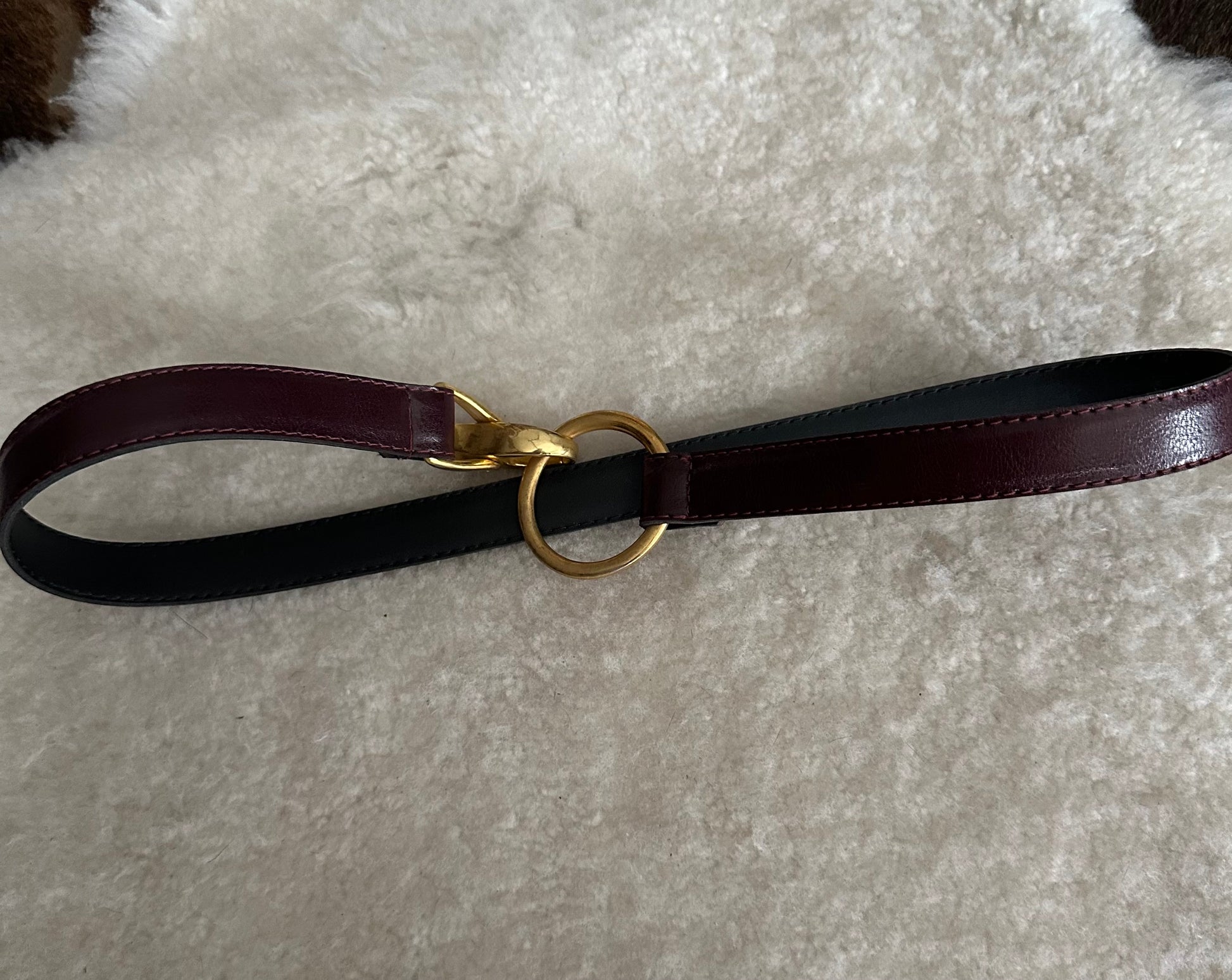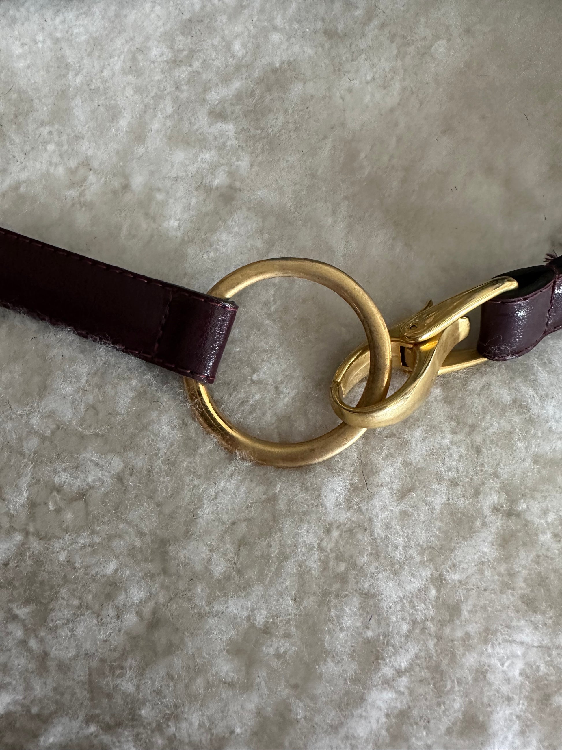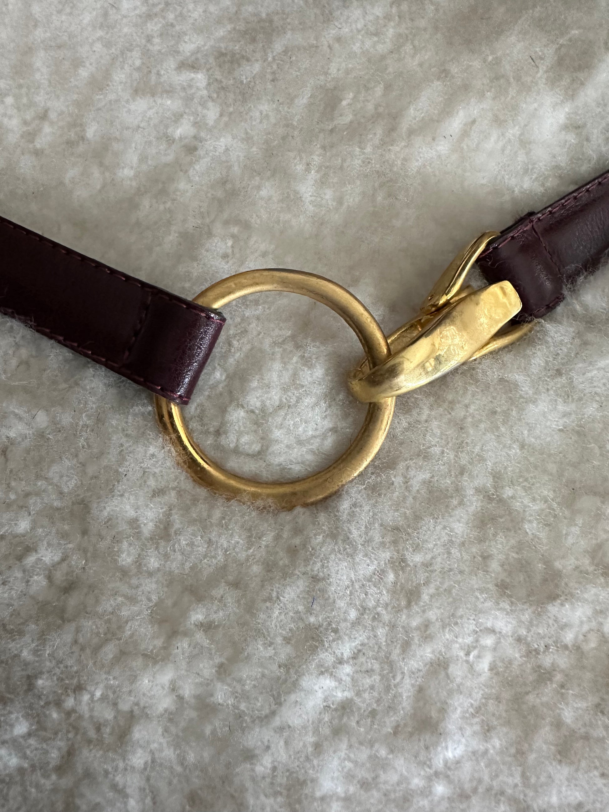 Cinturon en cuero color café burdeo. Se puede usar con pantalones. Su increíble detalle es una maravillosa hebilla de metal dorado, logrando resaltar cualquier tenida.