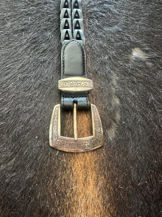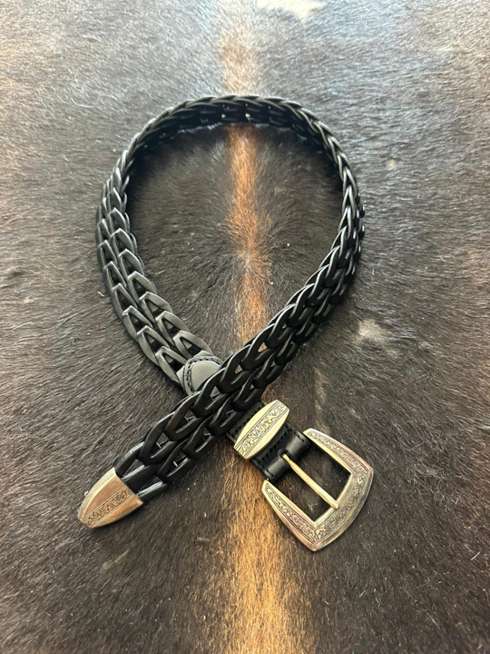 Cinturon en cuero negro trenzado perforado, con una combinación maravillosa de adornos y hebilla metálicas plata. Una obra artesal de lujo que luce con toda tenida.