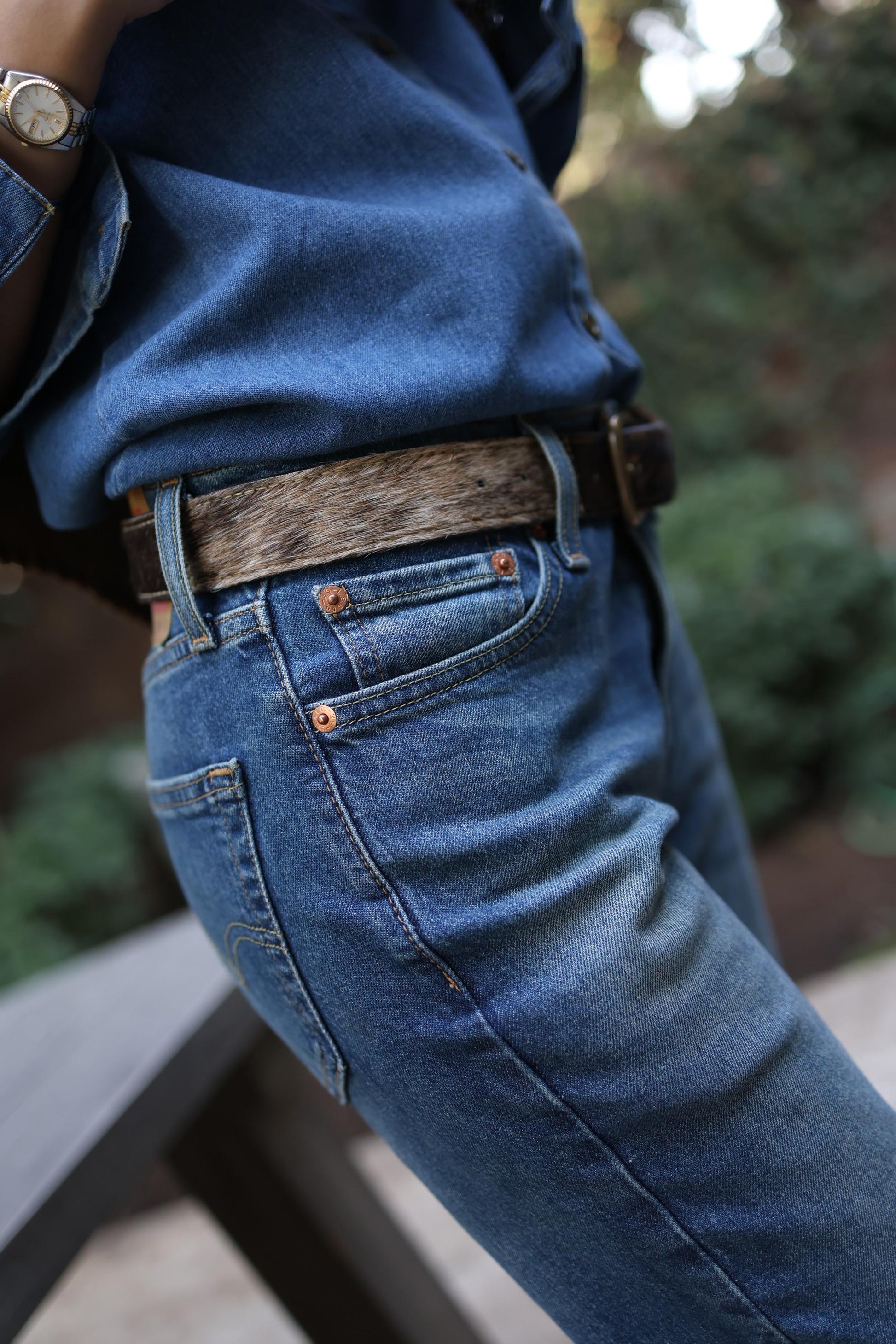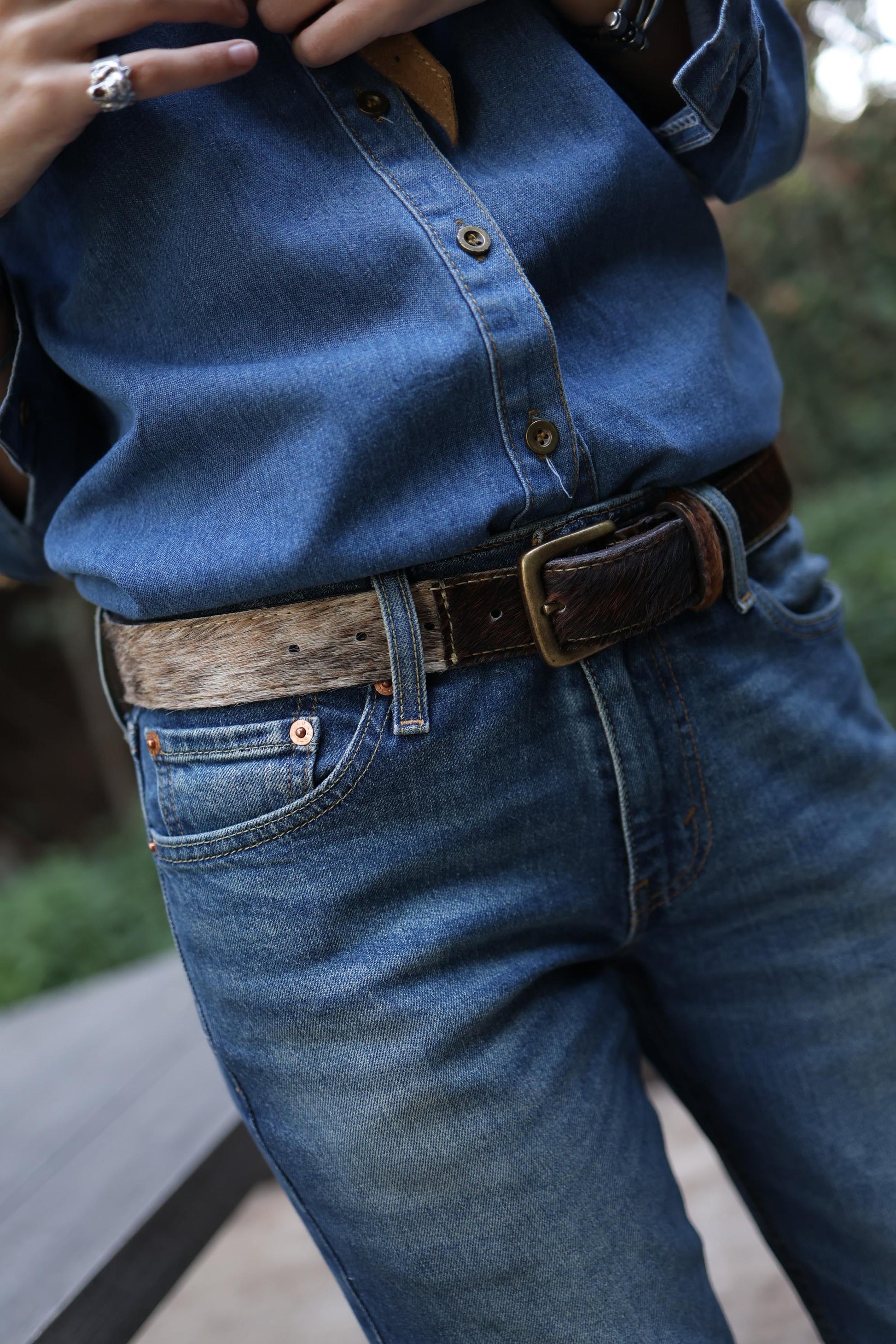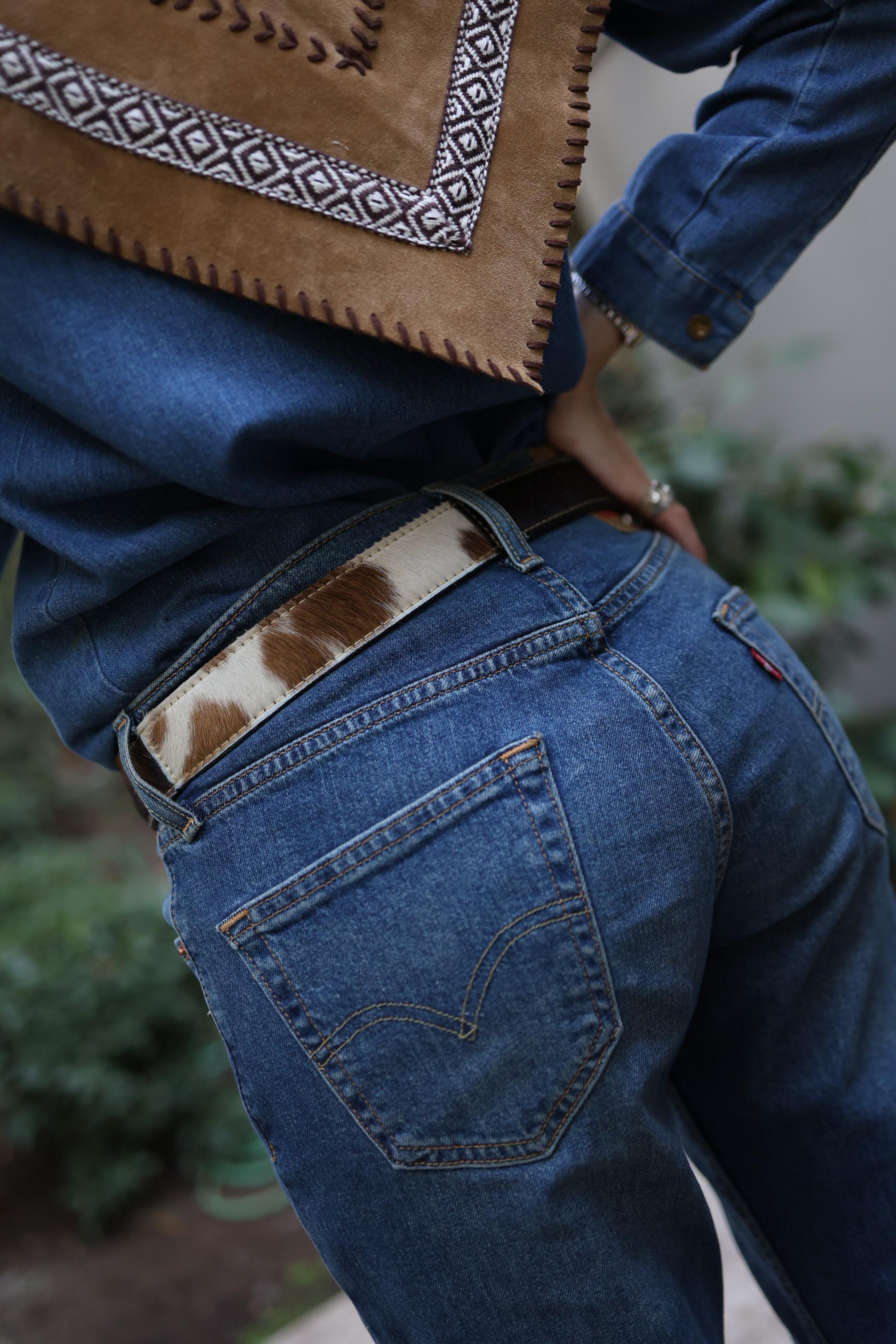 Este Cinturón Matilde está elaborado en cuero y piel patchwork en blanco-café (paso 3,5 cms).
