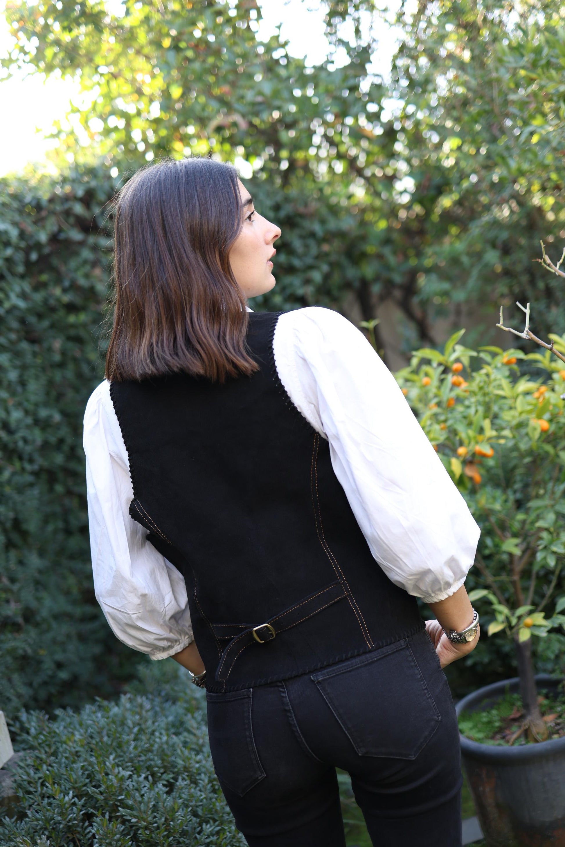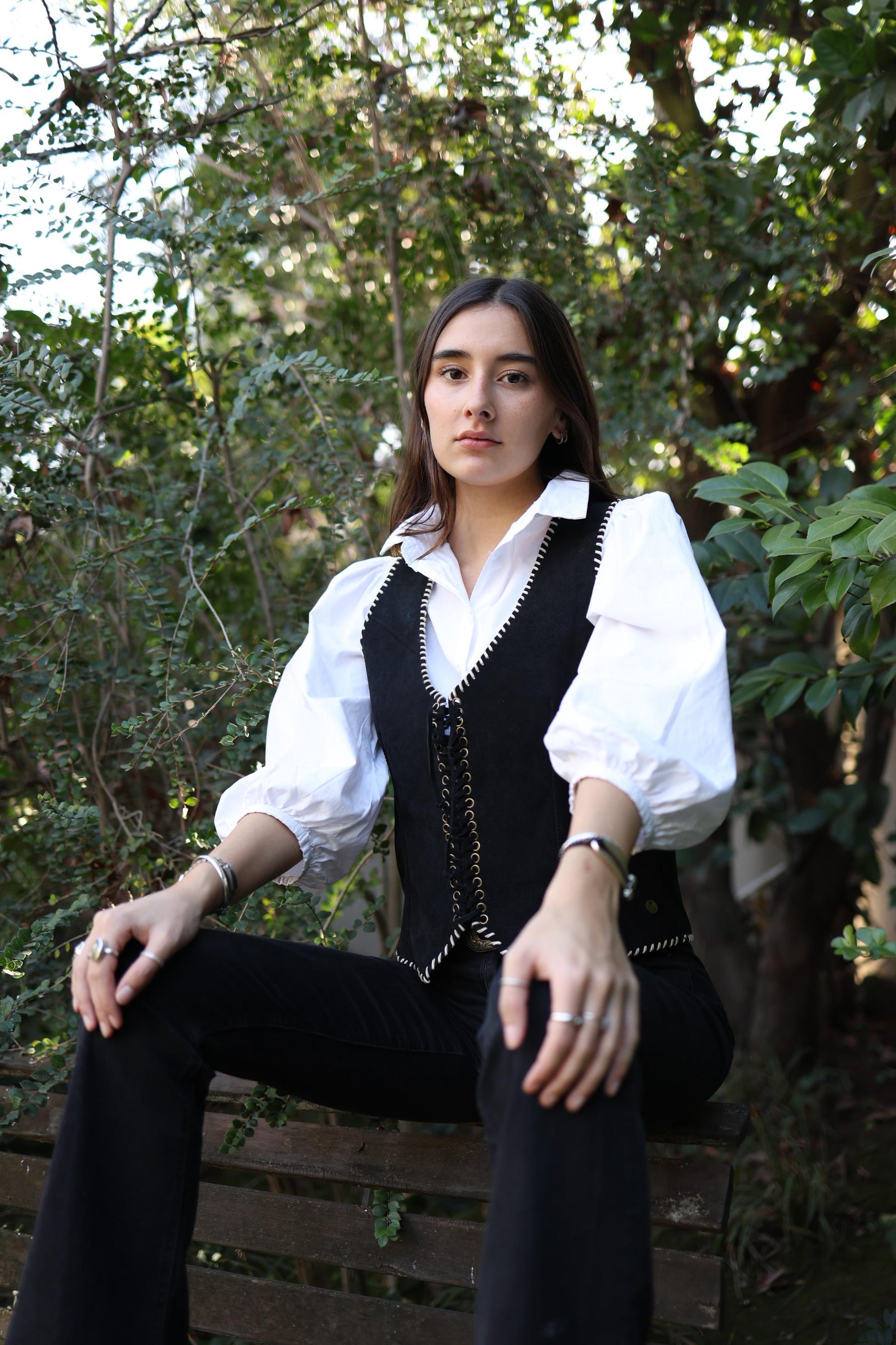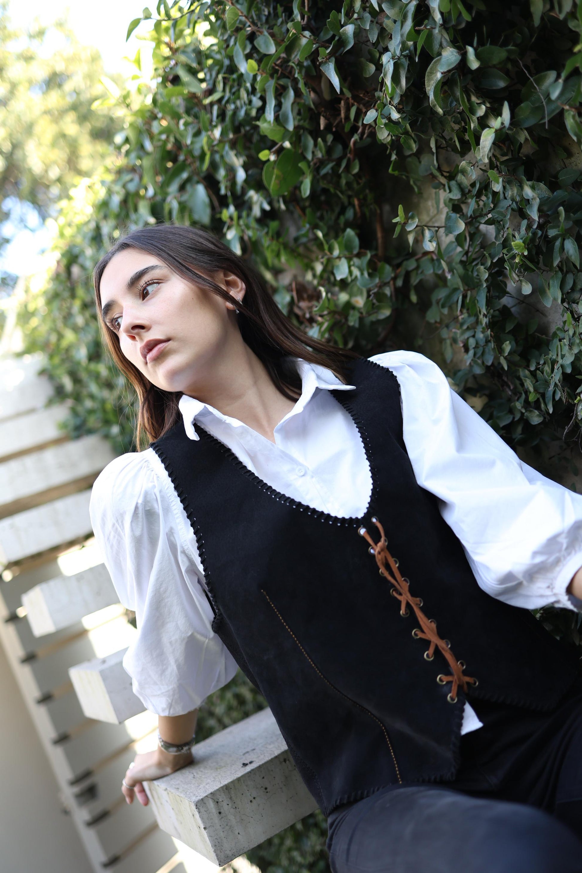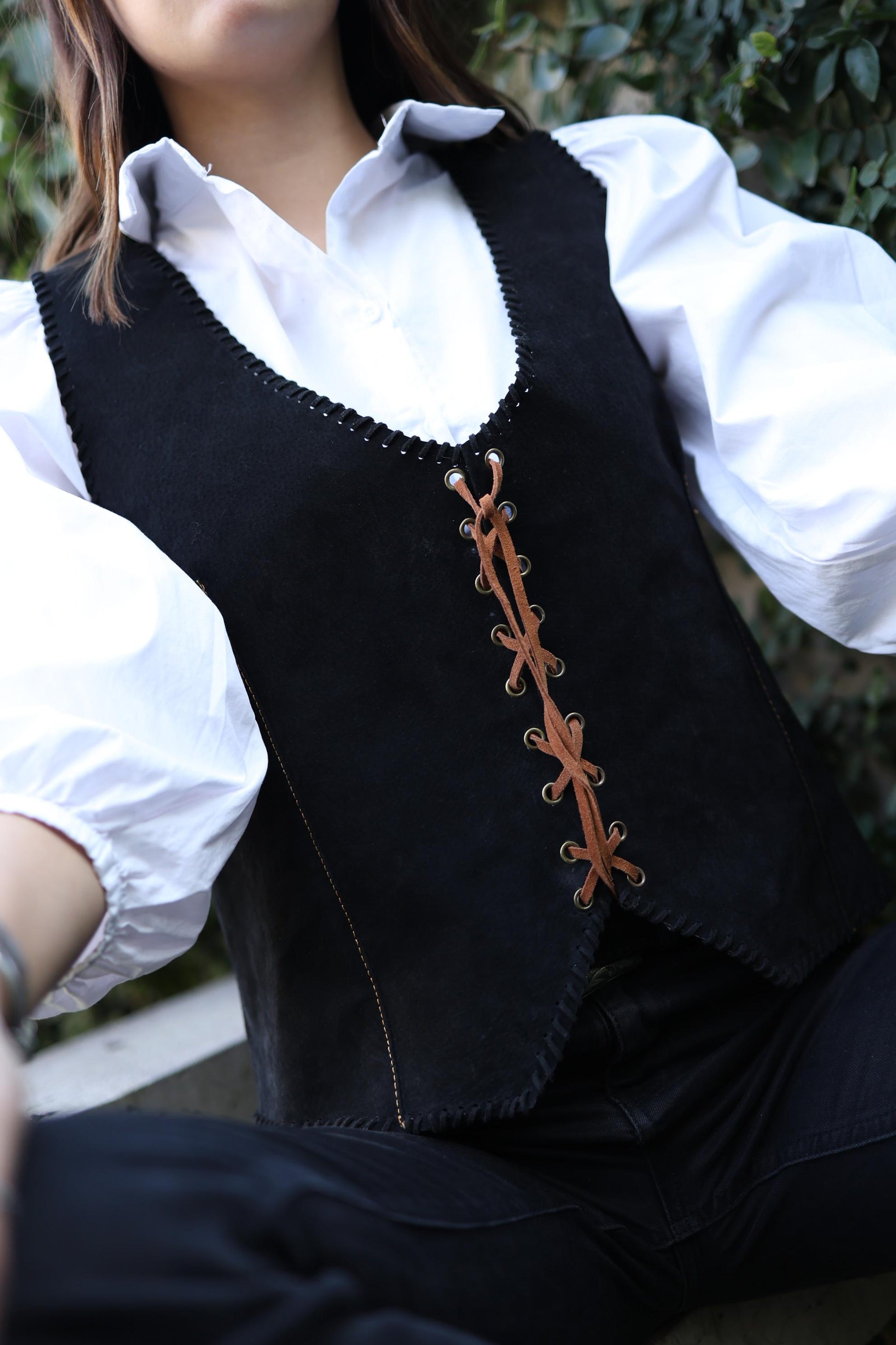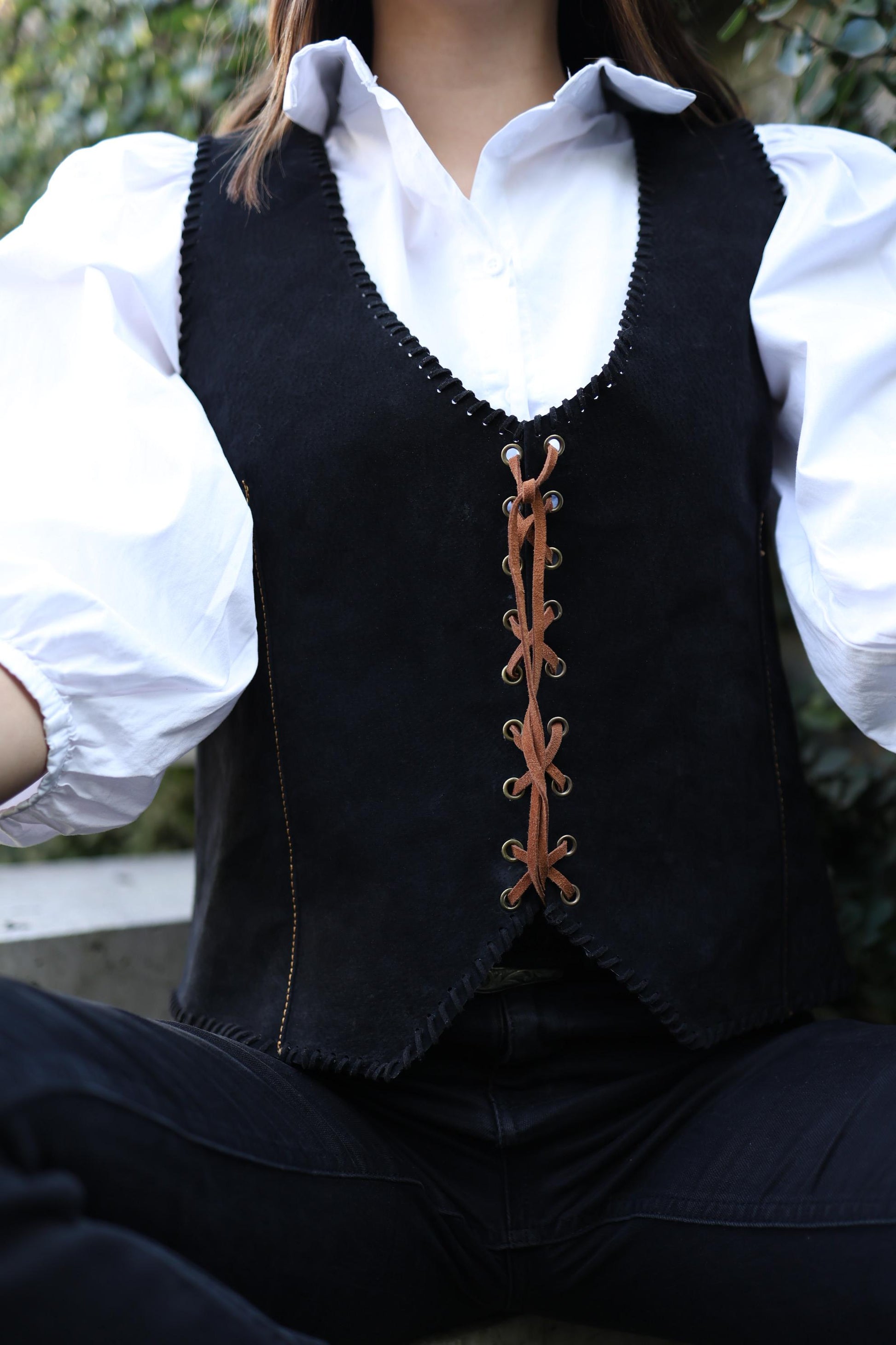 Este corsé Kira está confeccionado en cuero de carpincho negro, con pespuntes de gamuza en cruz en tono camel, aportando un marivilloso y exclusivo diseño, con un toque de distinción.