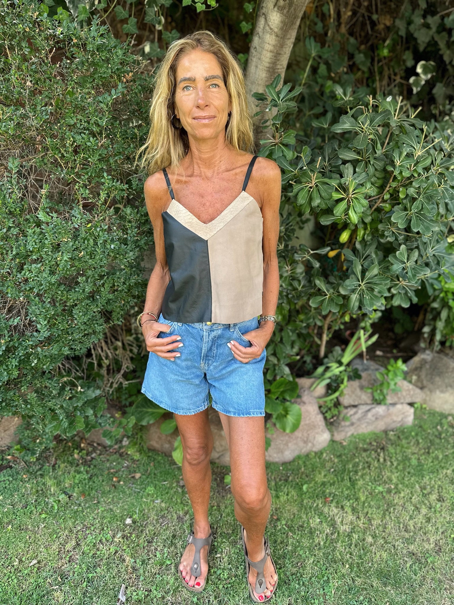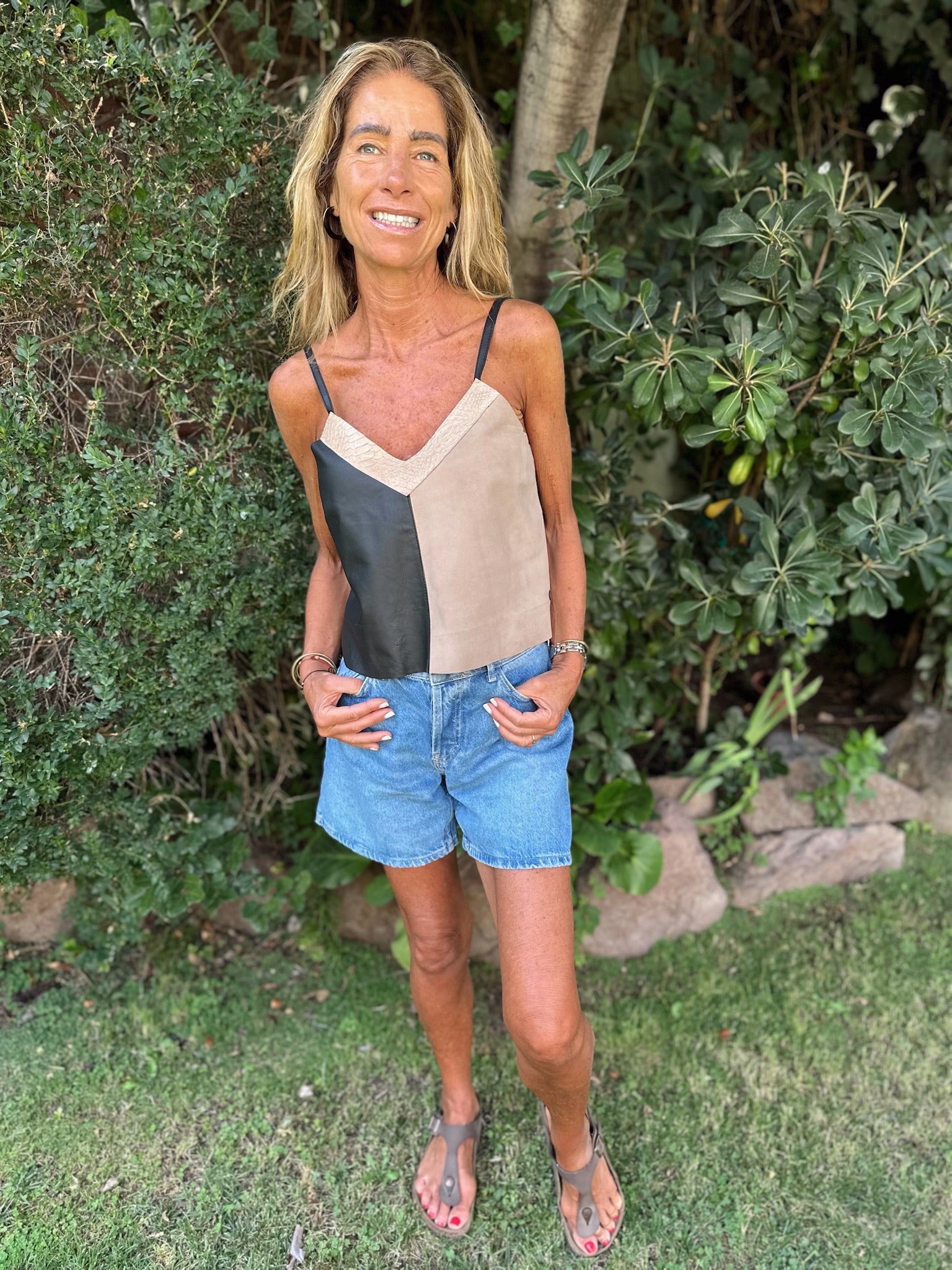 Este es un maravilloso crop top en cuero de oveja negro y gamuza anapada beige, con aplicaciones en cuero snake beige en el escote.