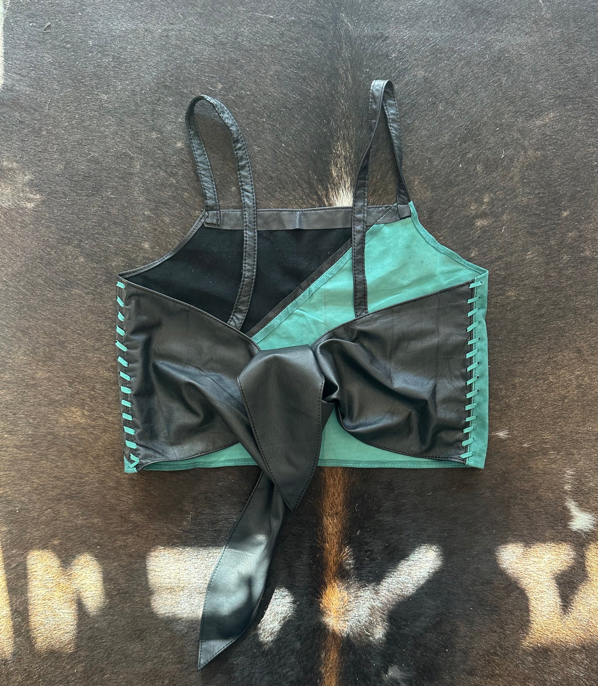 Este es un maravilloso crop top en cuero de oveja negro y gamuza de oveja en tono turquesa con una linda amarra en su espalda. Destaca por su comodidad y suavidad.