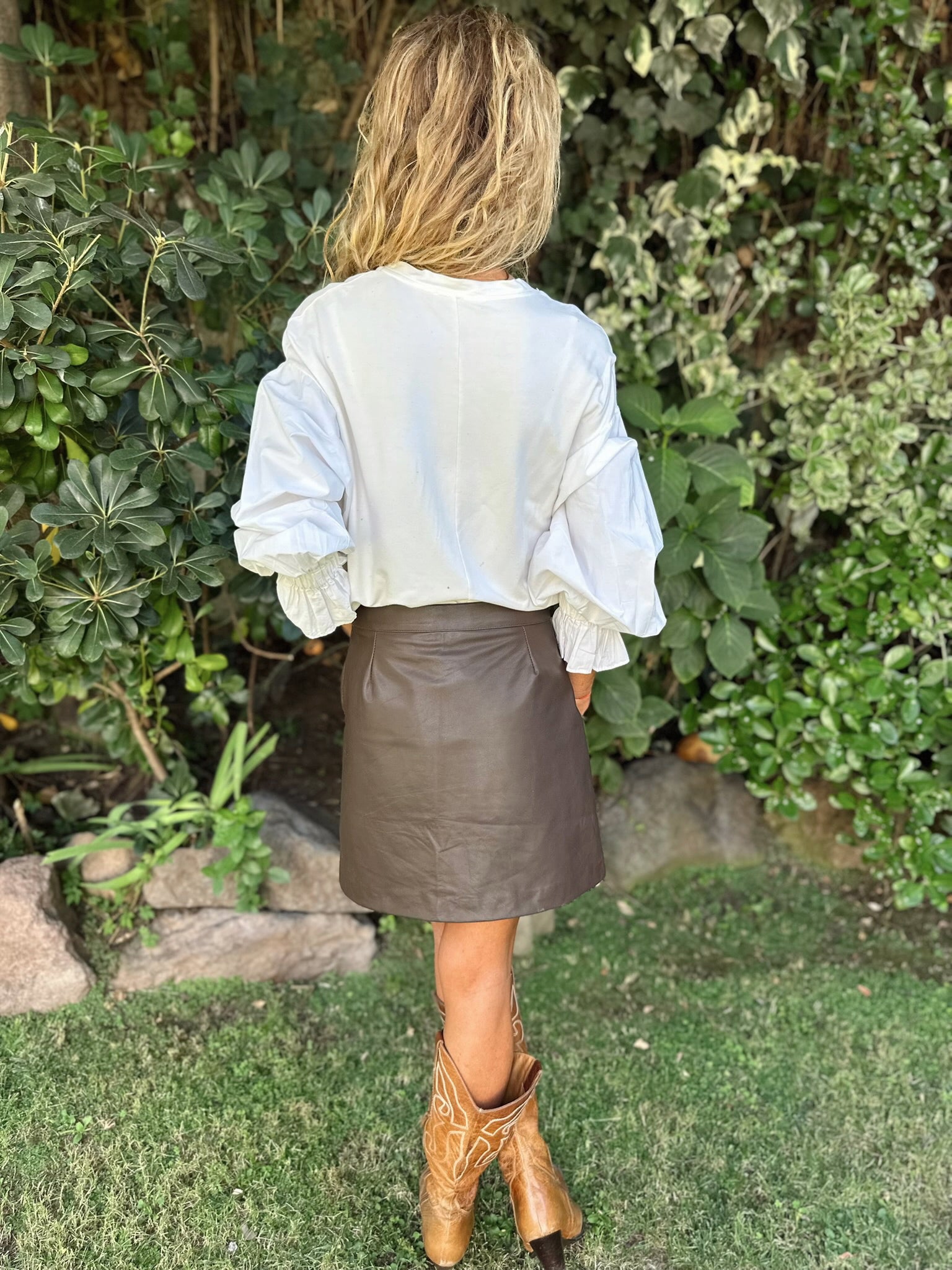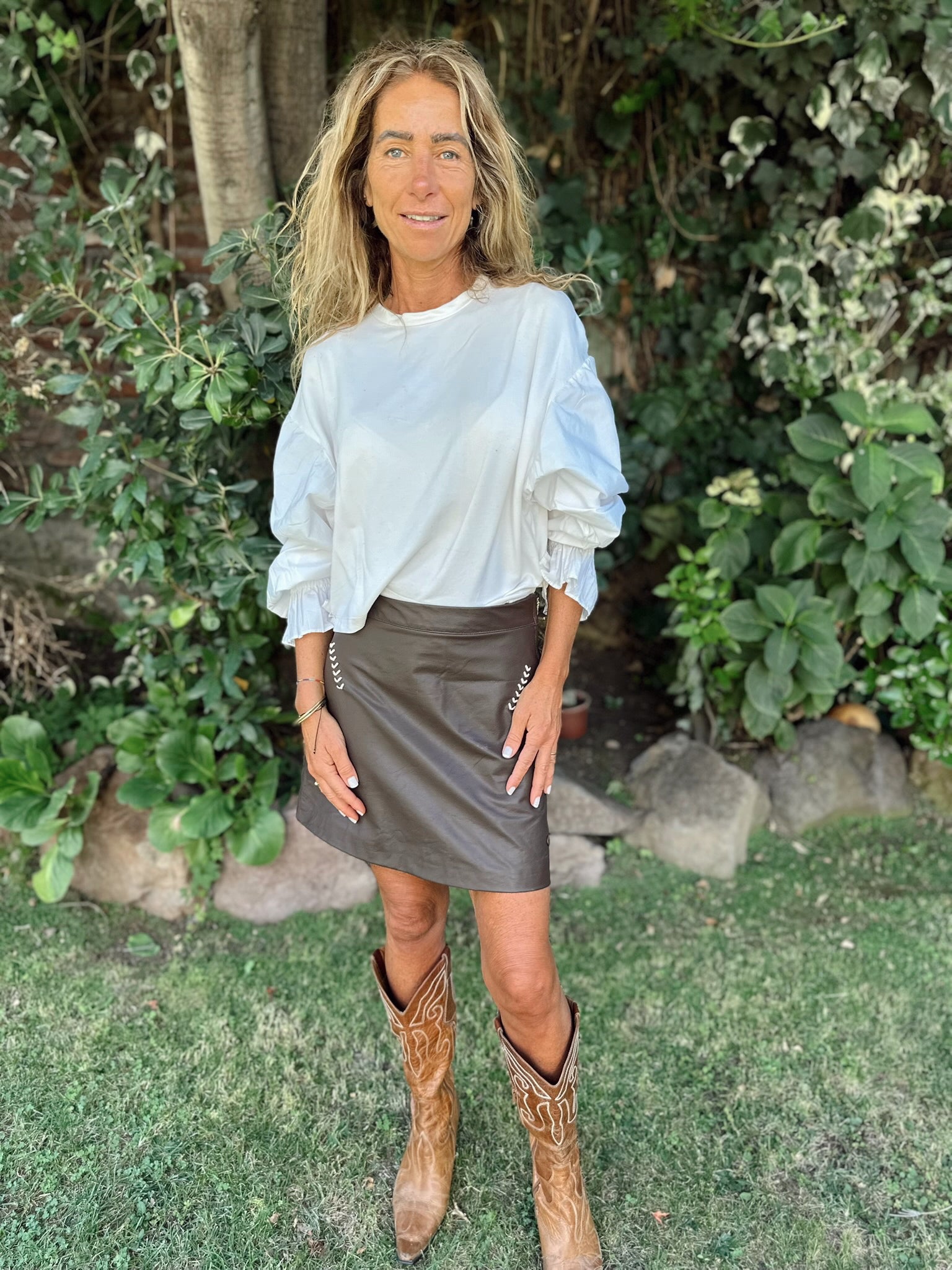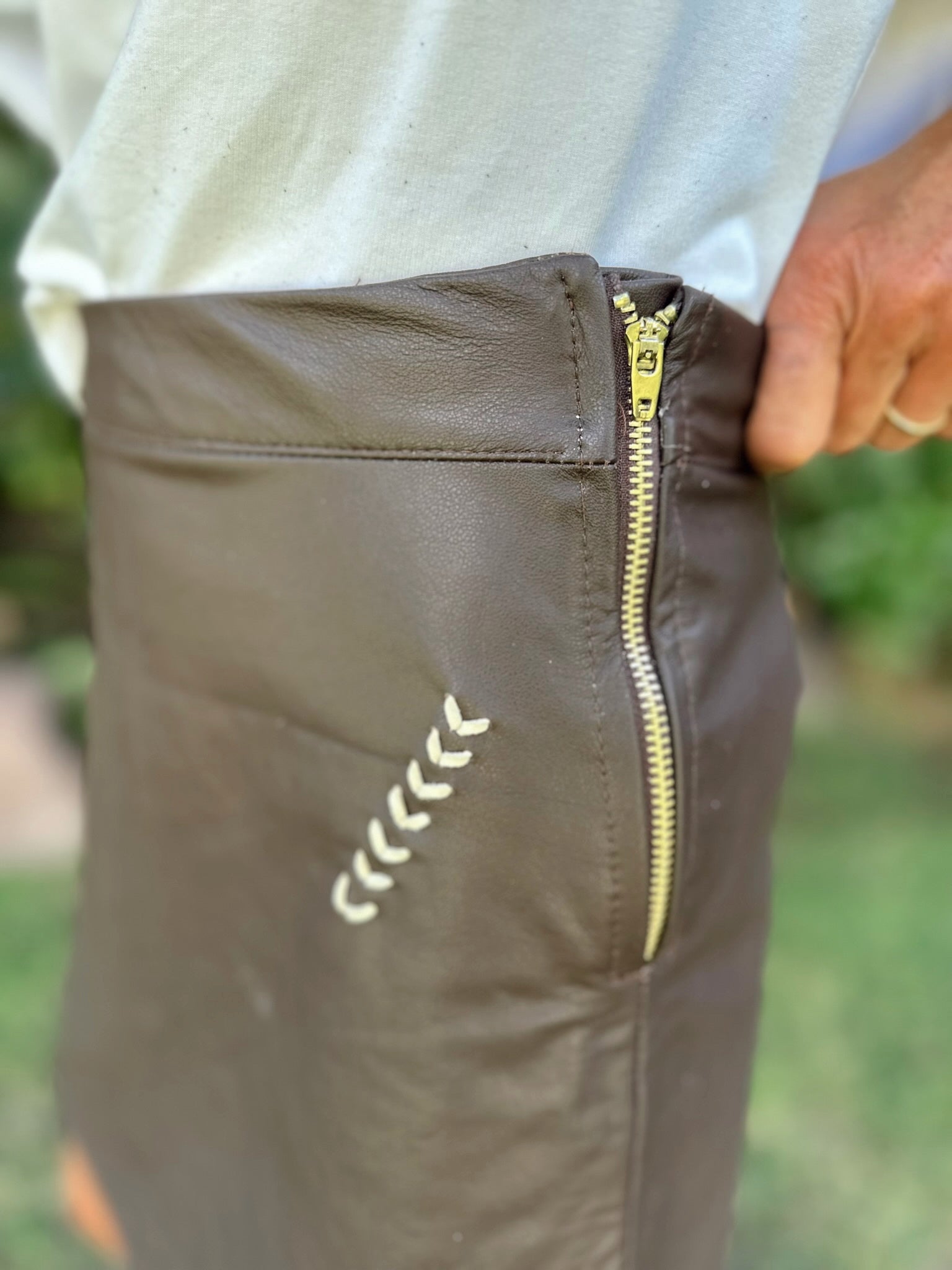 Maravillosa pollera mini en cuero de oveja color chocolate con unas lindas aplicaciones de espigas en gamuza color crudo.