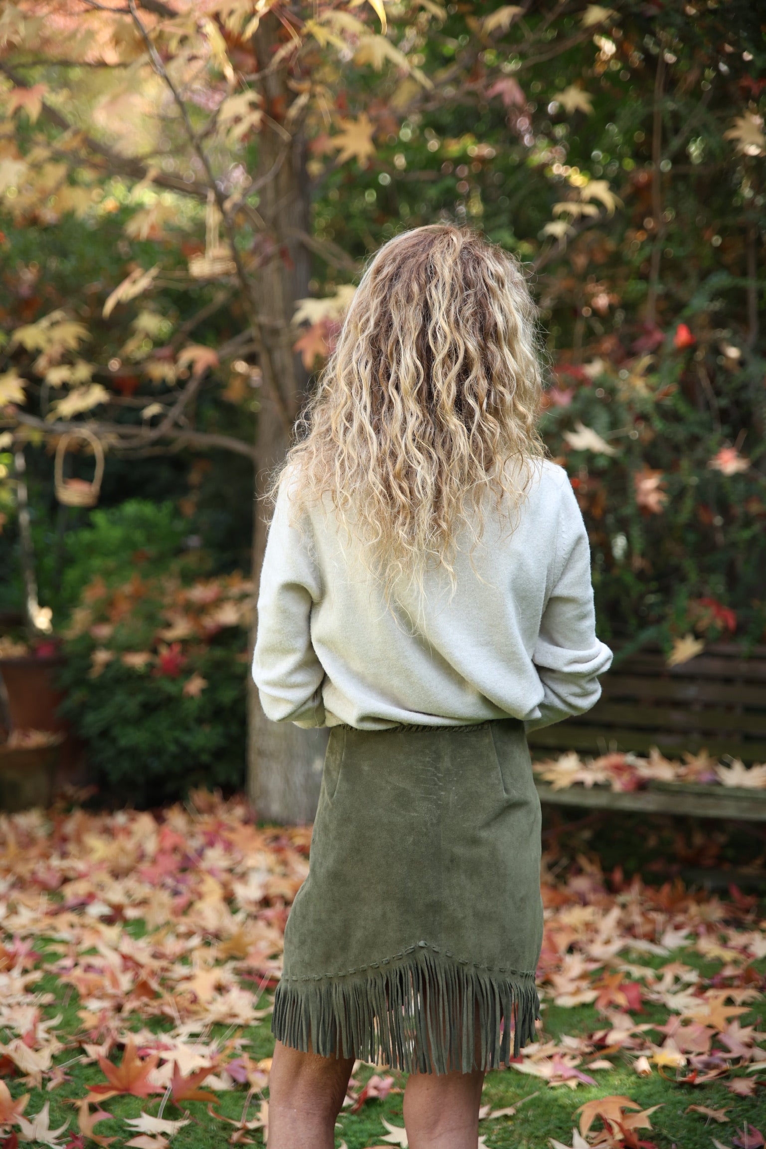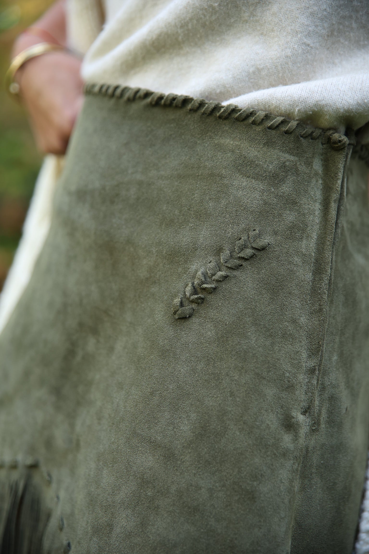 Esta pollera está confeccionada en suave y elegante gamuza verde. Cuenta con flecos decorativos que le dan un toque bohemio y femenino. Su diseño versátil te permite lucirla en diversas ocasiones, añadiendo un toque de estilo a tu outfit. Una opción cómoda y con estilo para cualquier ocasión.