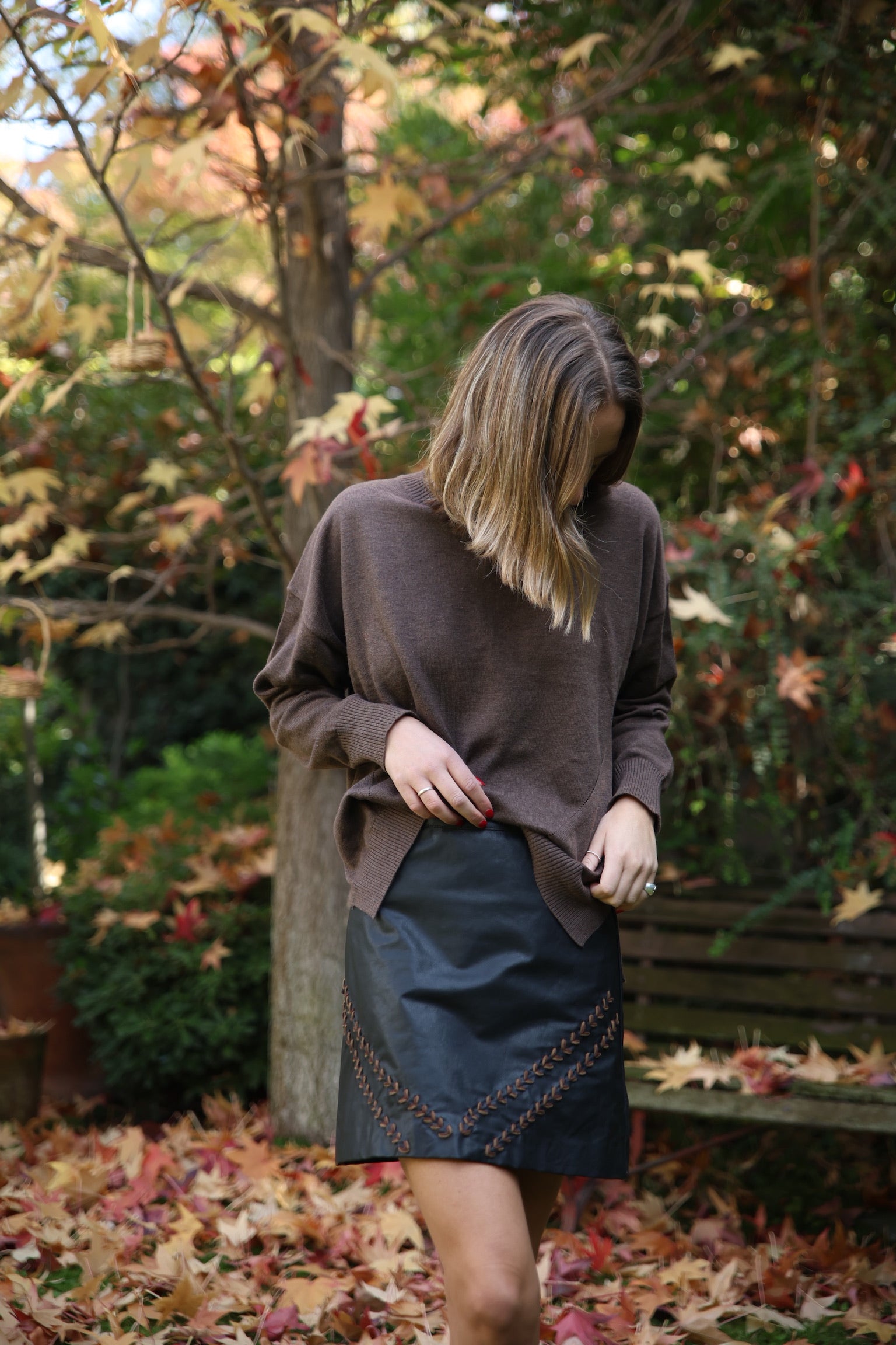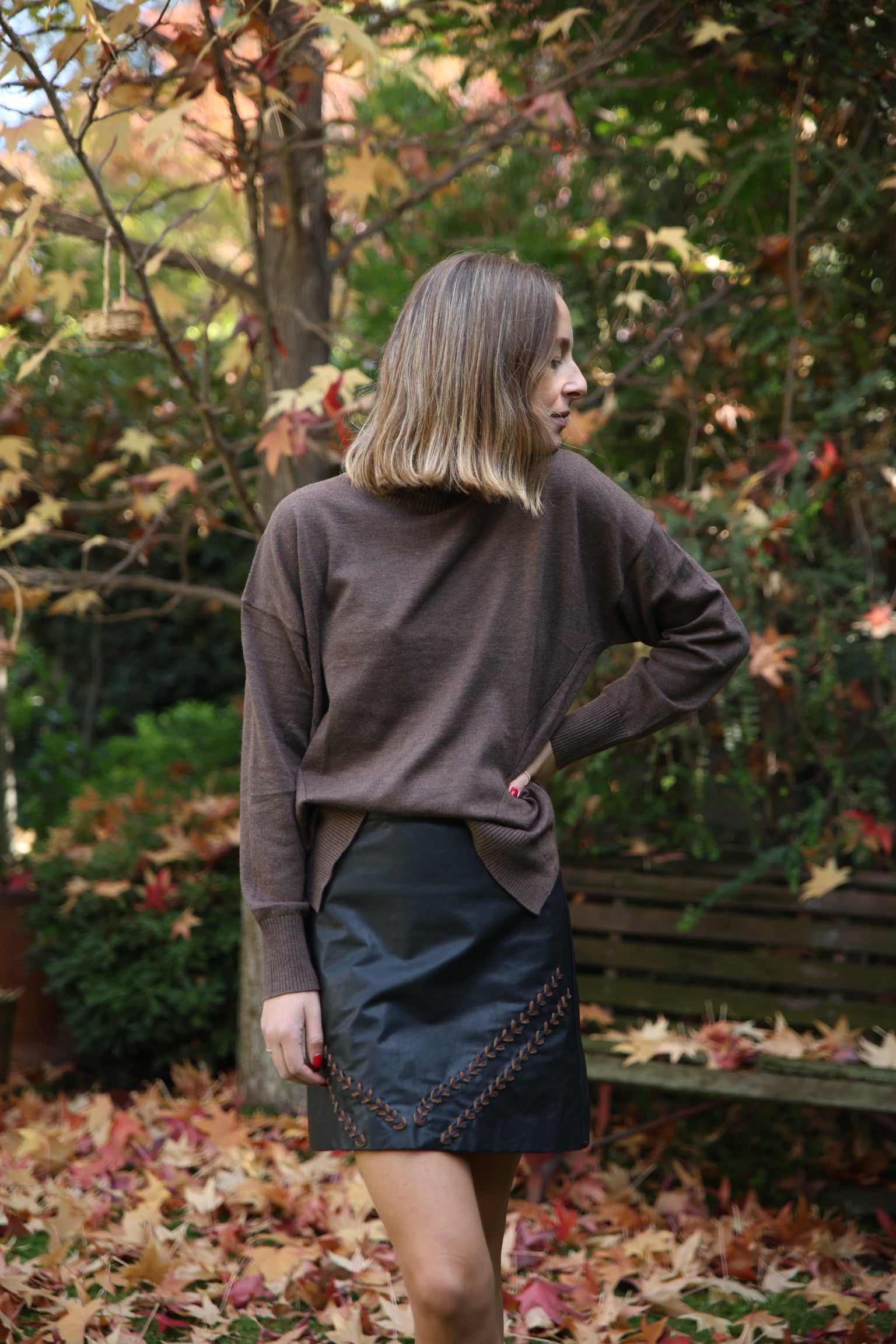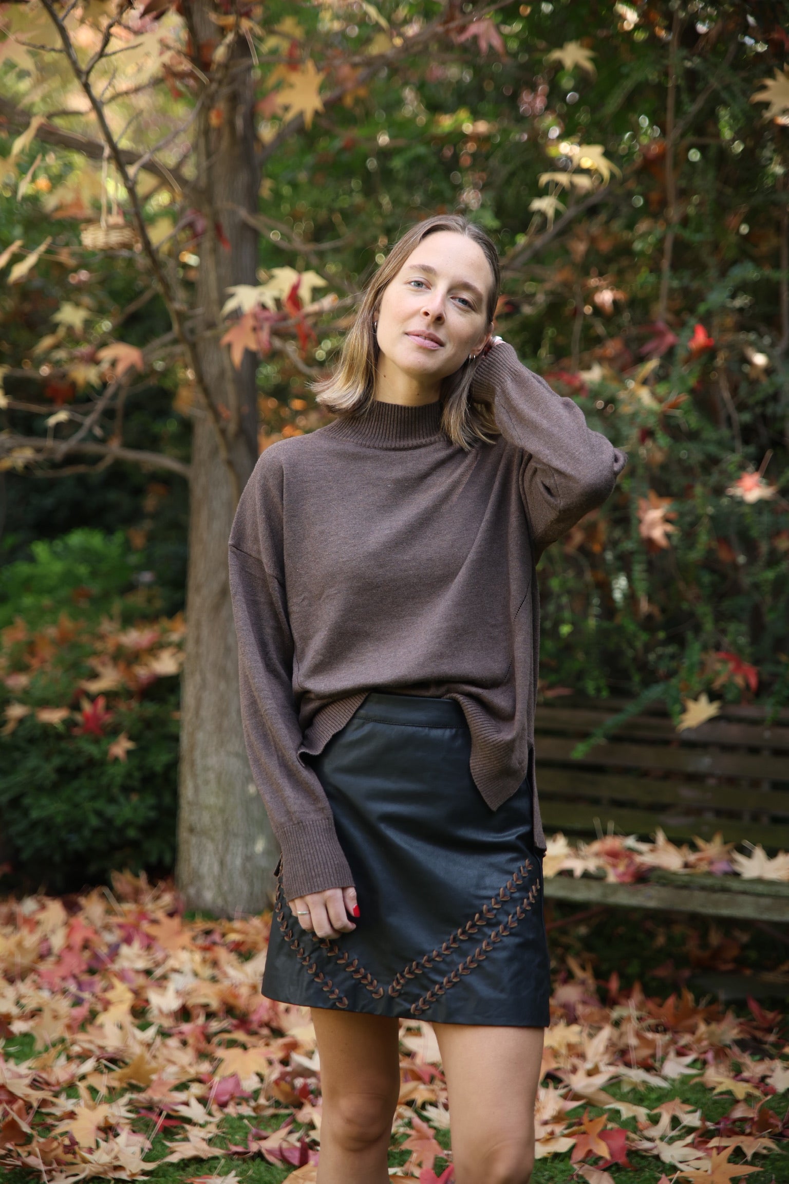 Descubre nuestra elegante y versátil pollera Mini Laura 110 en color negro con detalles de espigas en gamuza de color café. Confeccionada con materiales de alta calidad, esta falda es perfecta para cualquier ocasión. Combínala con tu estilo favorito y siéntete cómoda y elegante al mismo tiempo.