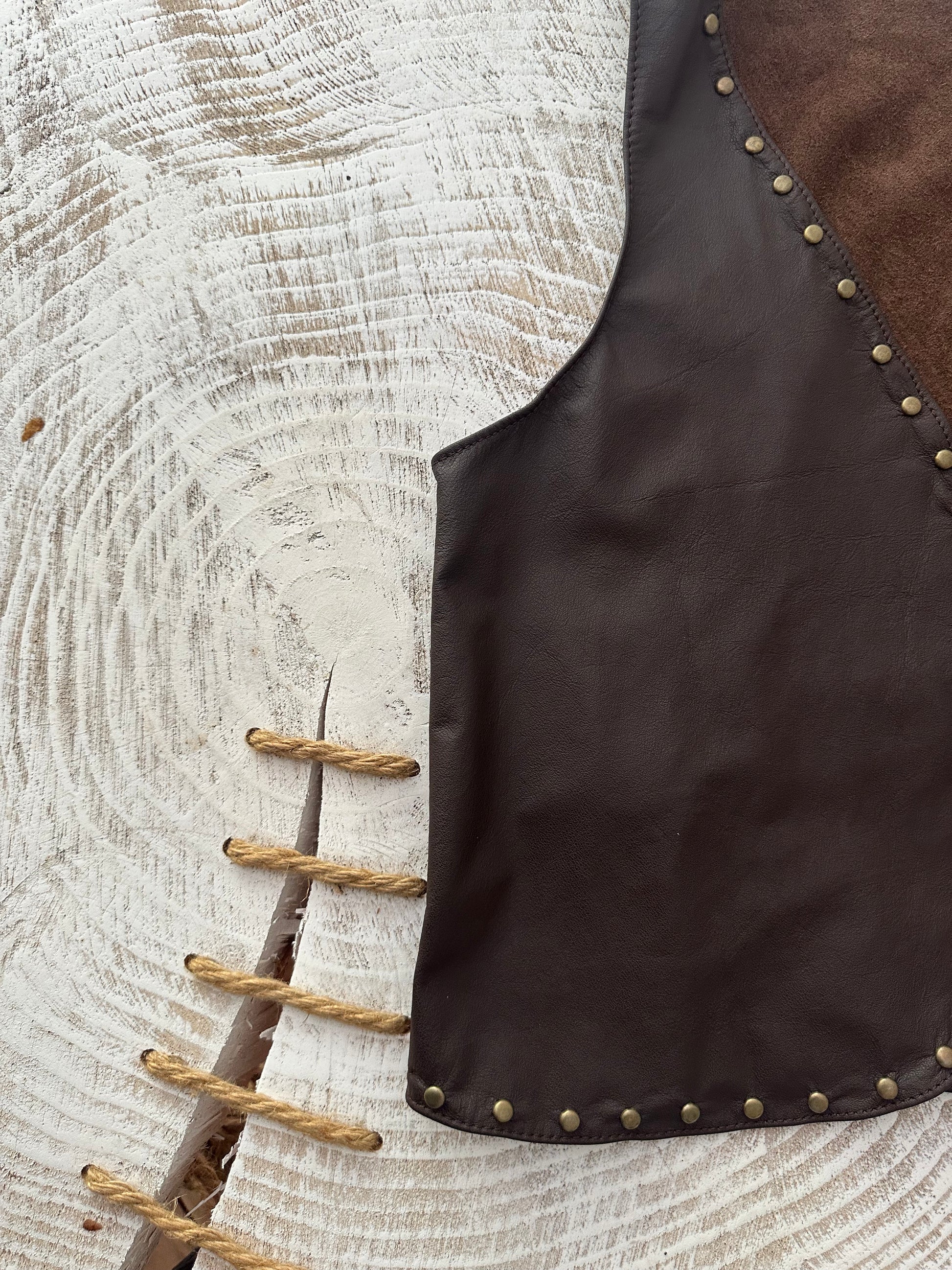 Este Gilet Carola mezcla la elegancia del cuero de oveja, en color chocolate, con una combinación de tachas envejecidas que realzan su diseño. Esta prenda ofrece un acabado sofisticado y exclusivo, ideal para quienes buscan calidad y estilo en cada detalle.