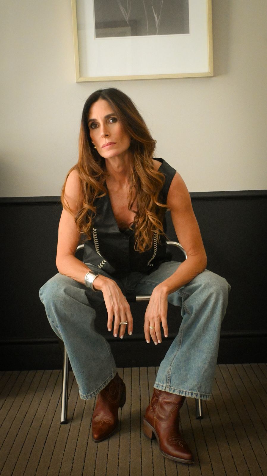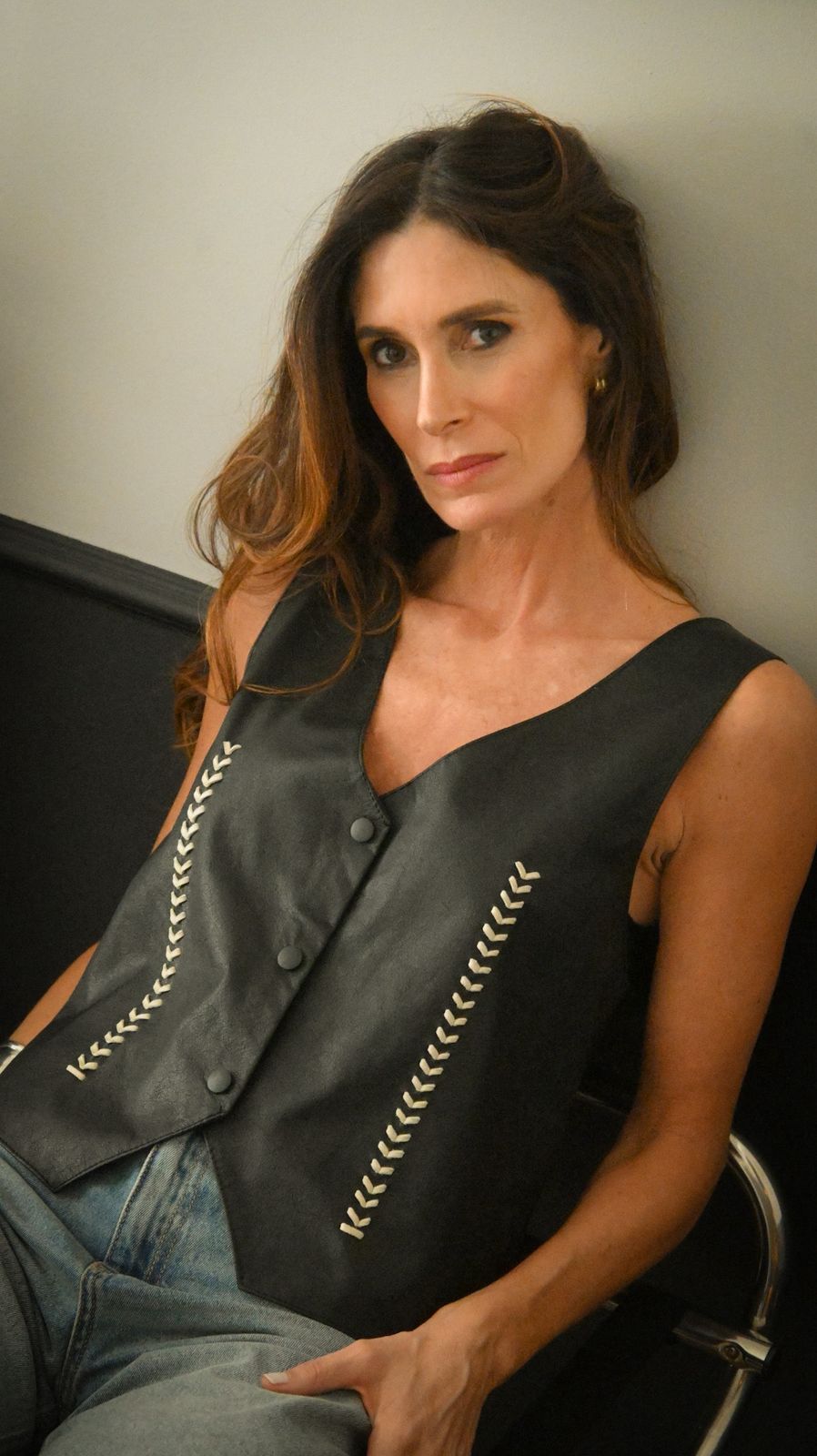 Este maravilloso Gilet Magnolia es en cuero negro con espigas color crudo en su parte delantera. Lo puedes usar solo o con algo debajo. Está hecho en un cuero de oveja muy suave.
