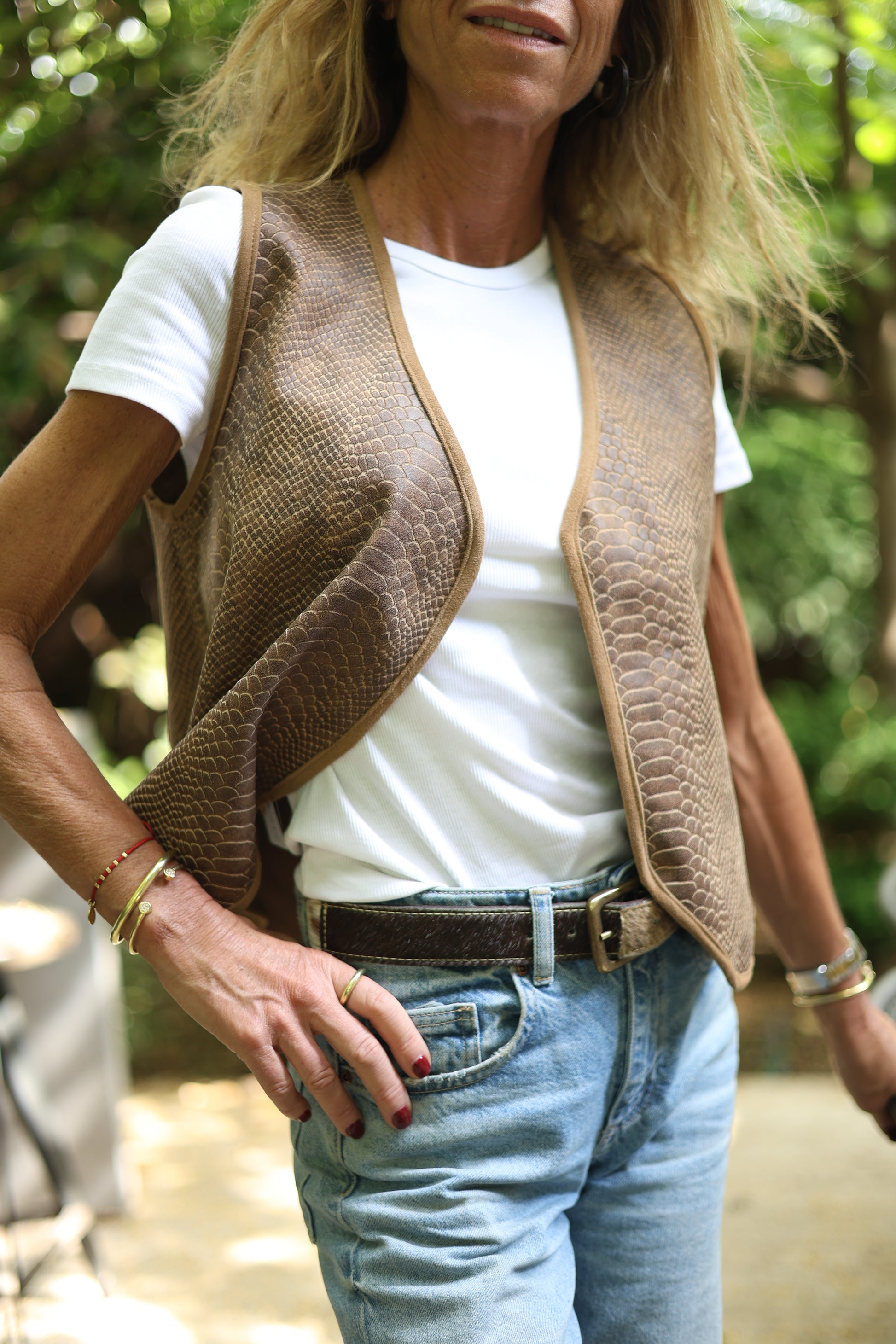 Este gilet Magnolia combina cuero impreso snake y gamuza en un elegante tono arena, destacando por su terminación en punta en la espalda que aporta un diseño sofisticado y moderno. Los detalles de cruces al costado en gamuza color mostaza añaden un toque distintivo y artesanal, realzando su estilo único. Ideal para quienes buscan una prenda versátil que une textura y color con un acabado experto y cuidado.