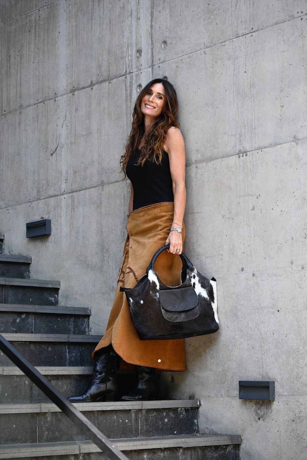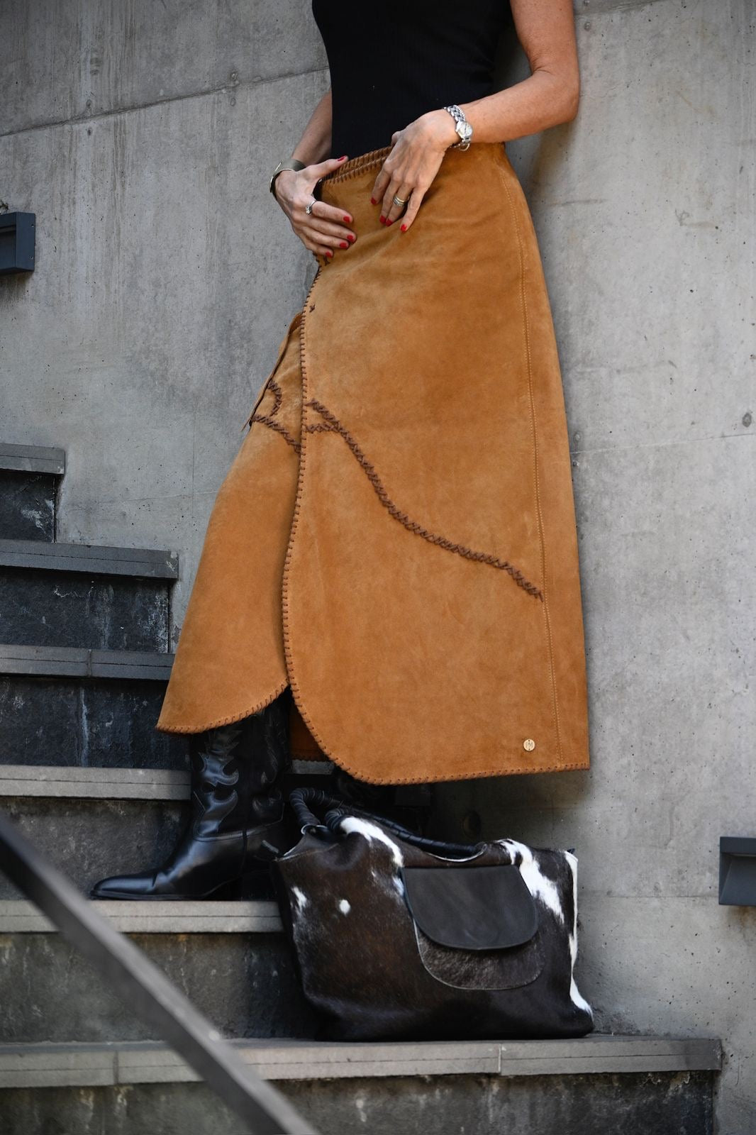 Esta pollera Ana en gamuza de color camel, combina sofisticación y estilo, con un embarrilado en gamuza tono chocolate en todo su contorno que la realza. Ideal para quienes buscan destacar con elegancia en cualquier ocasión.