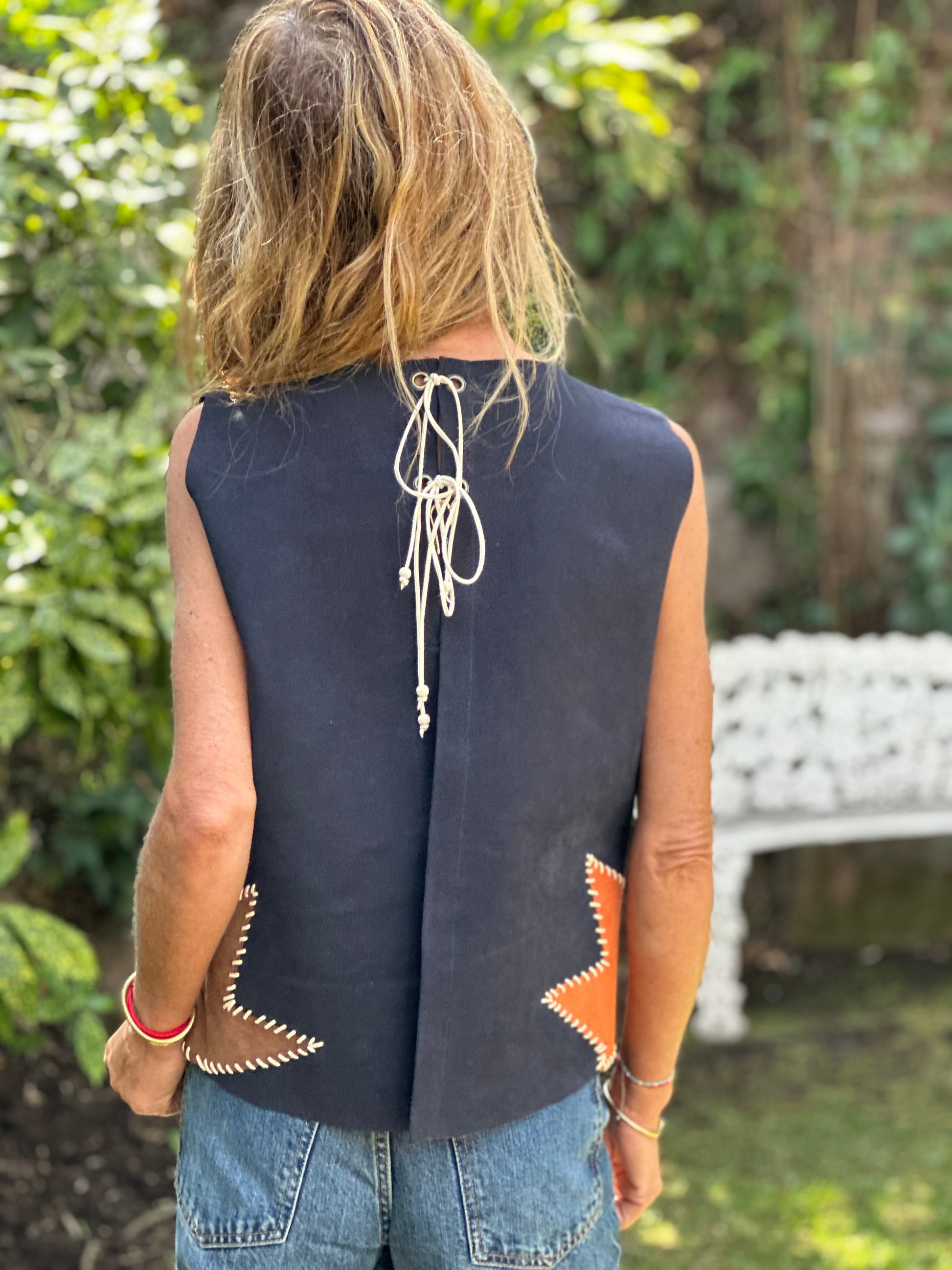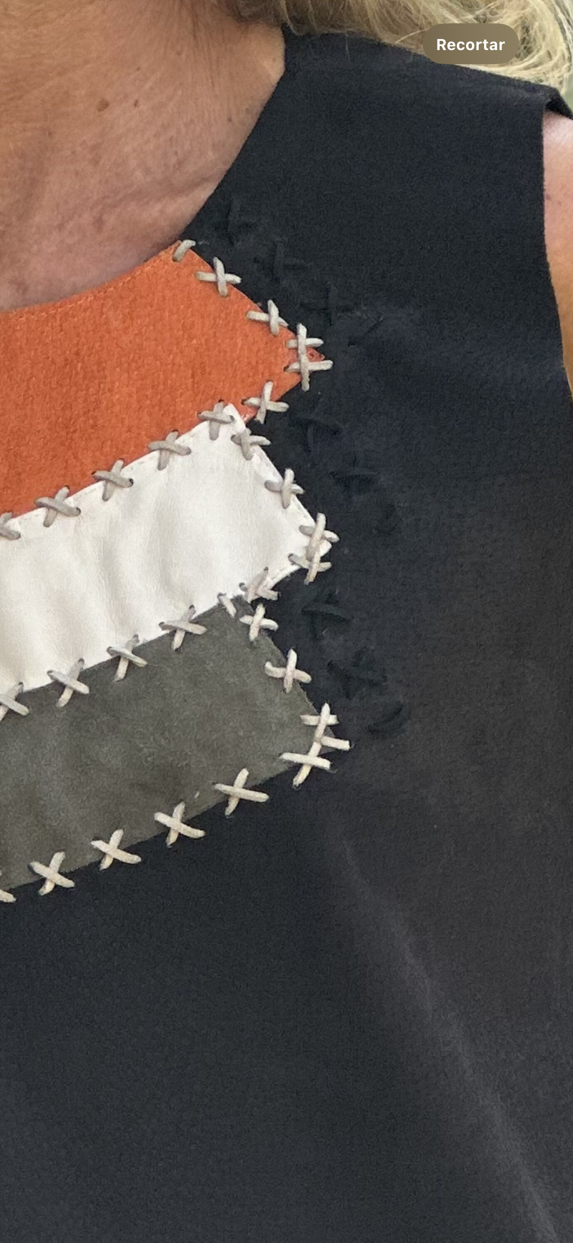 El Top Antonia Étnico en color negro, tiene preciosas aplicaciones en gamuza en distintos tonos que contrastan con el color neutro de fondo, además, sus amarras en la parte trasera son únicas, de manera que se puede usar como top y como gilet.