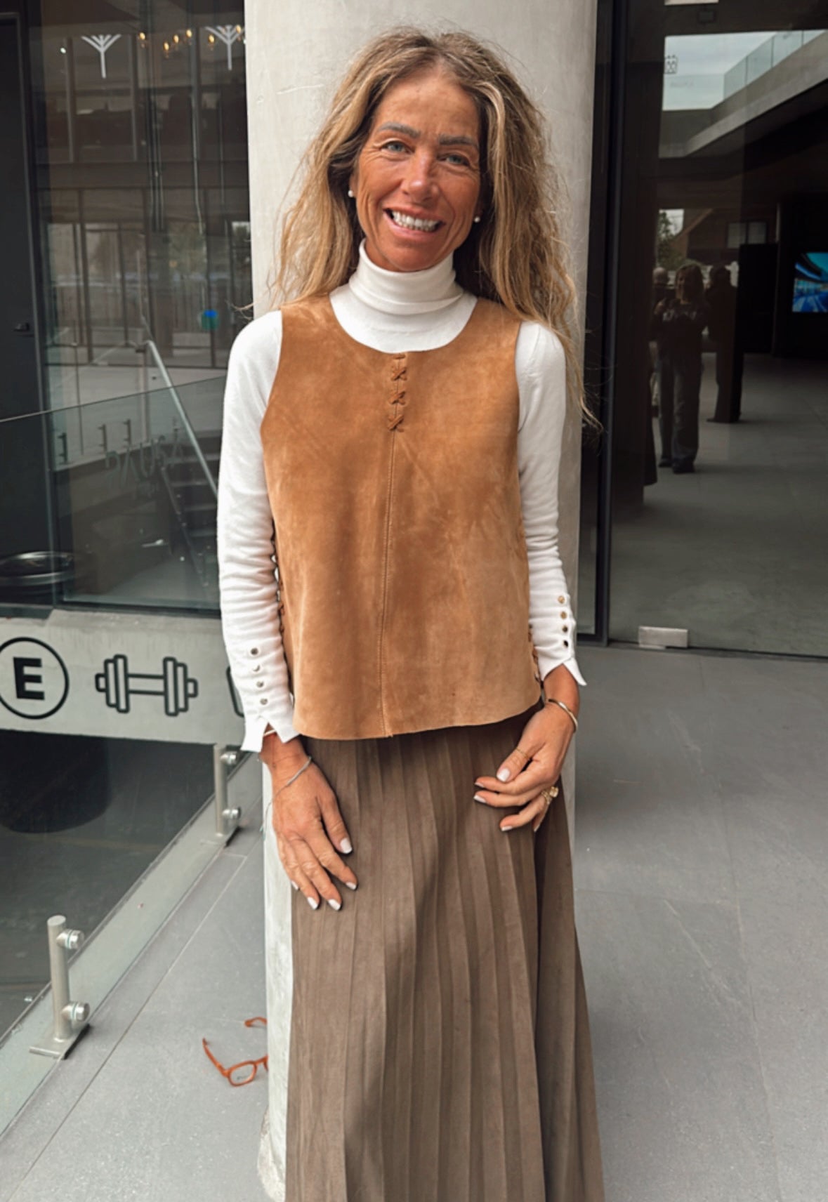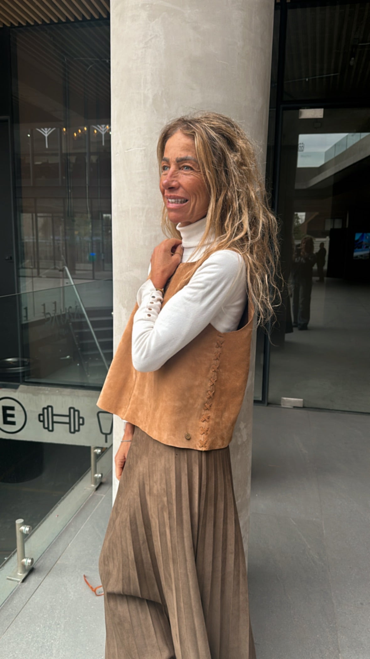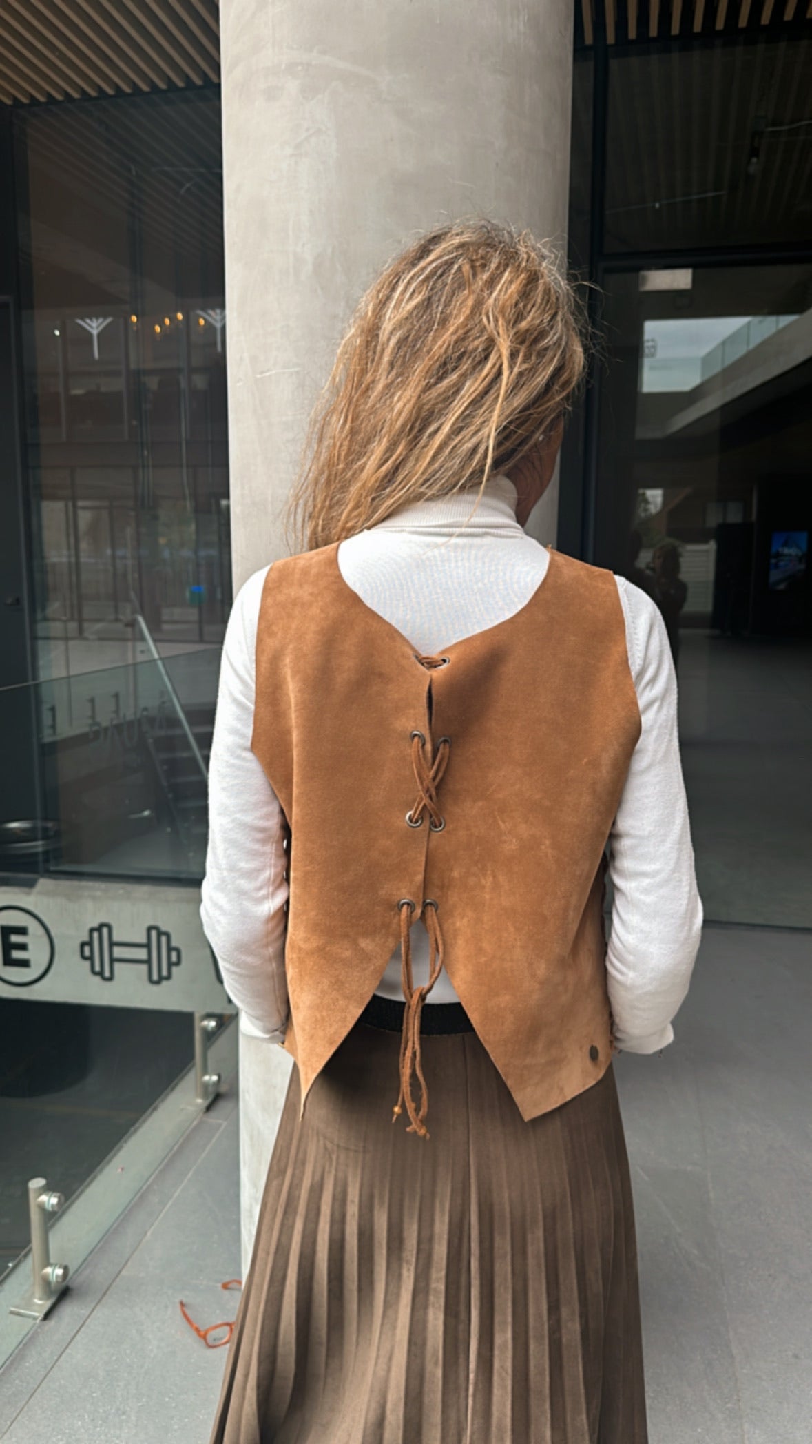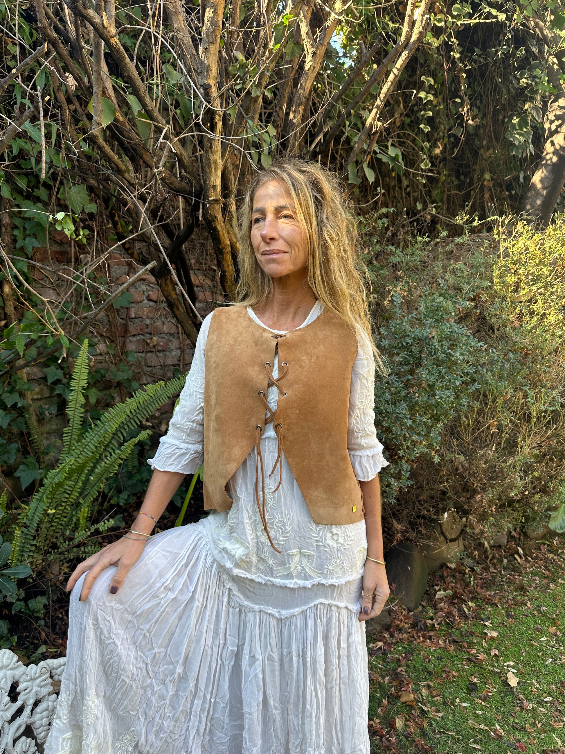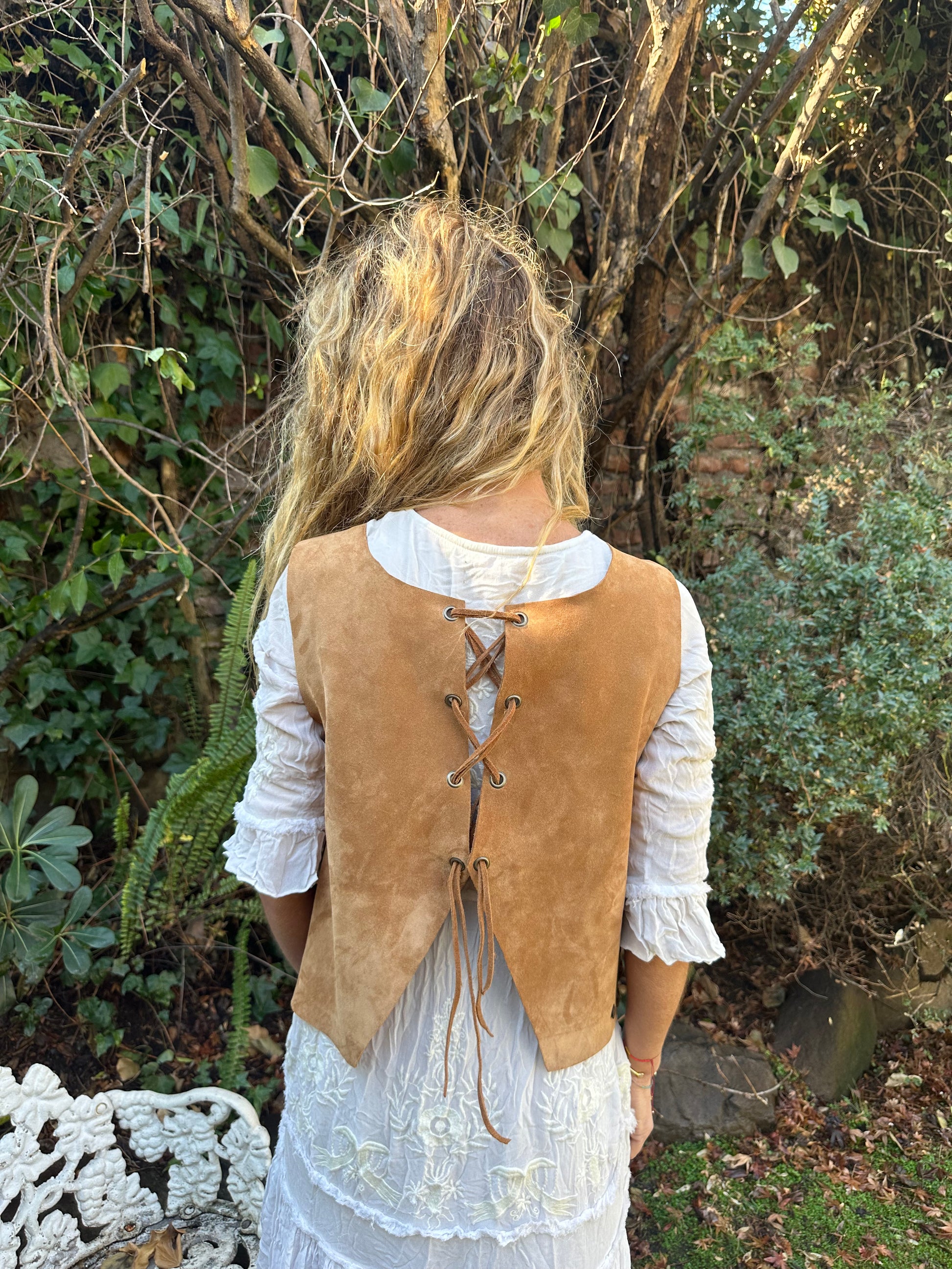 Top Antonia en gamuza tostada con detalles en su parte frontal y cerrada en la espalda, con 4 ojetillos que permiten ajustarla a gusto de cada una. Este modelo permite usarla tanto como top o como gilet. Su gamuza más firme hace que tenga una caída importante.