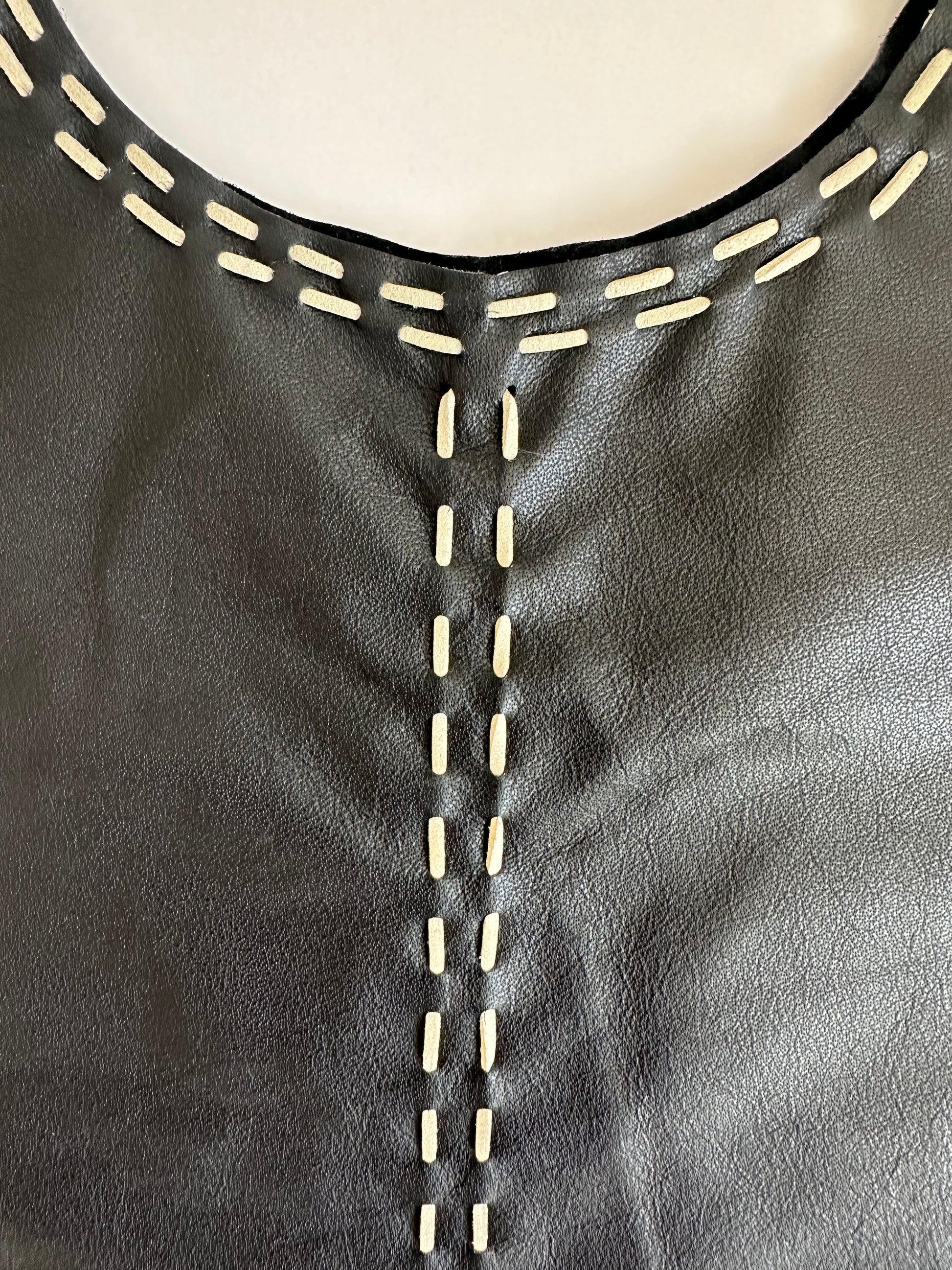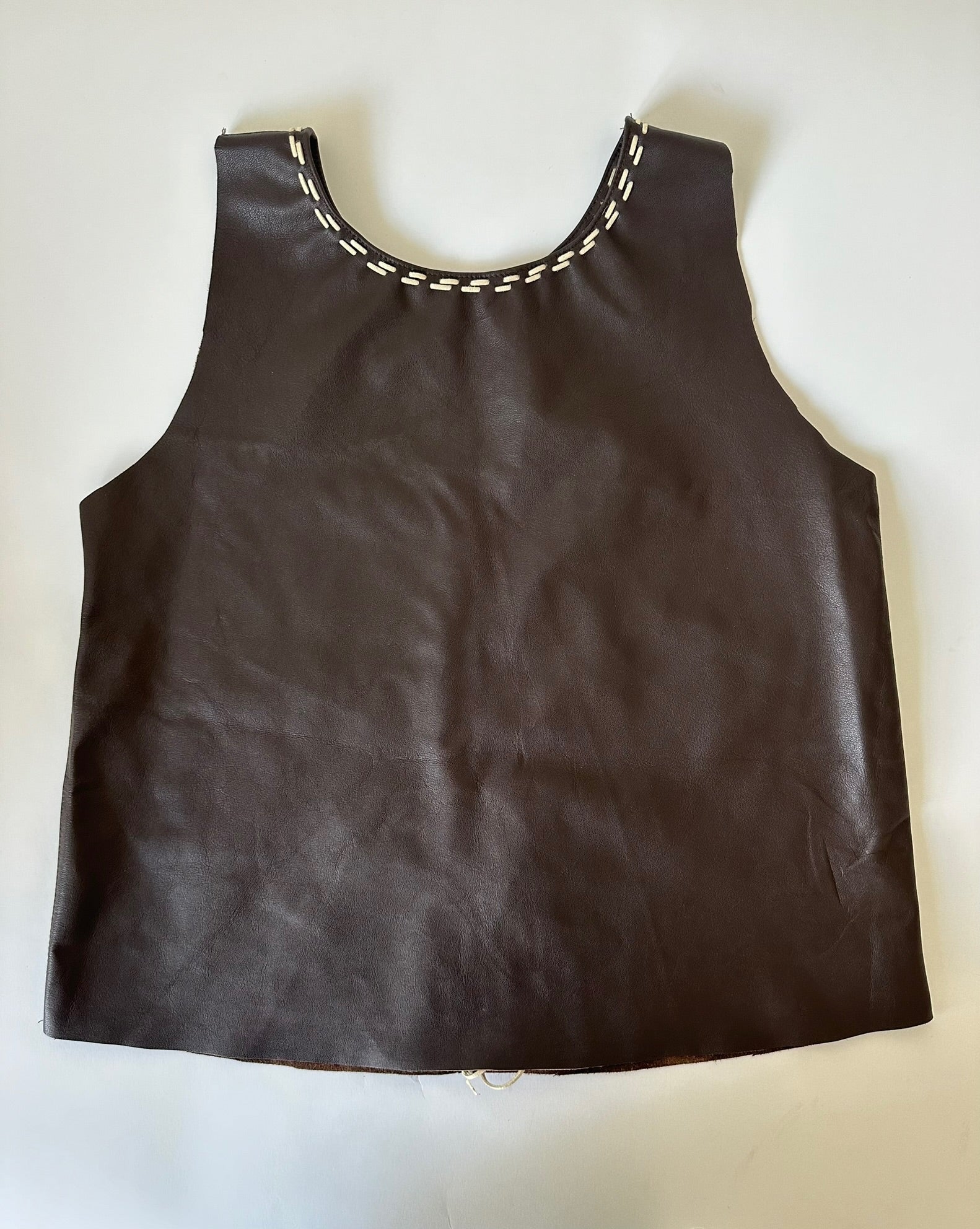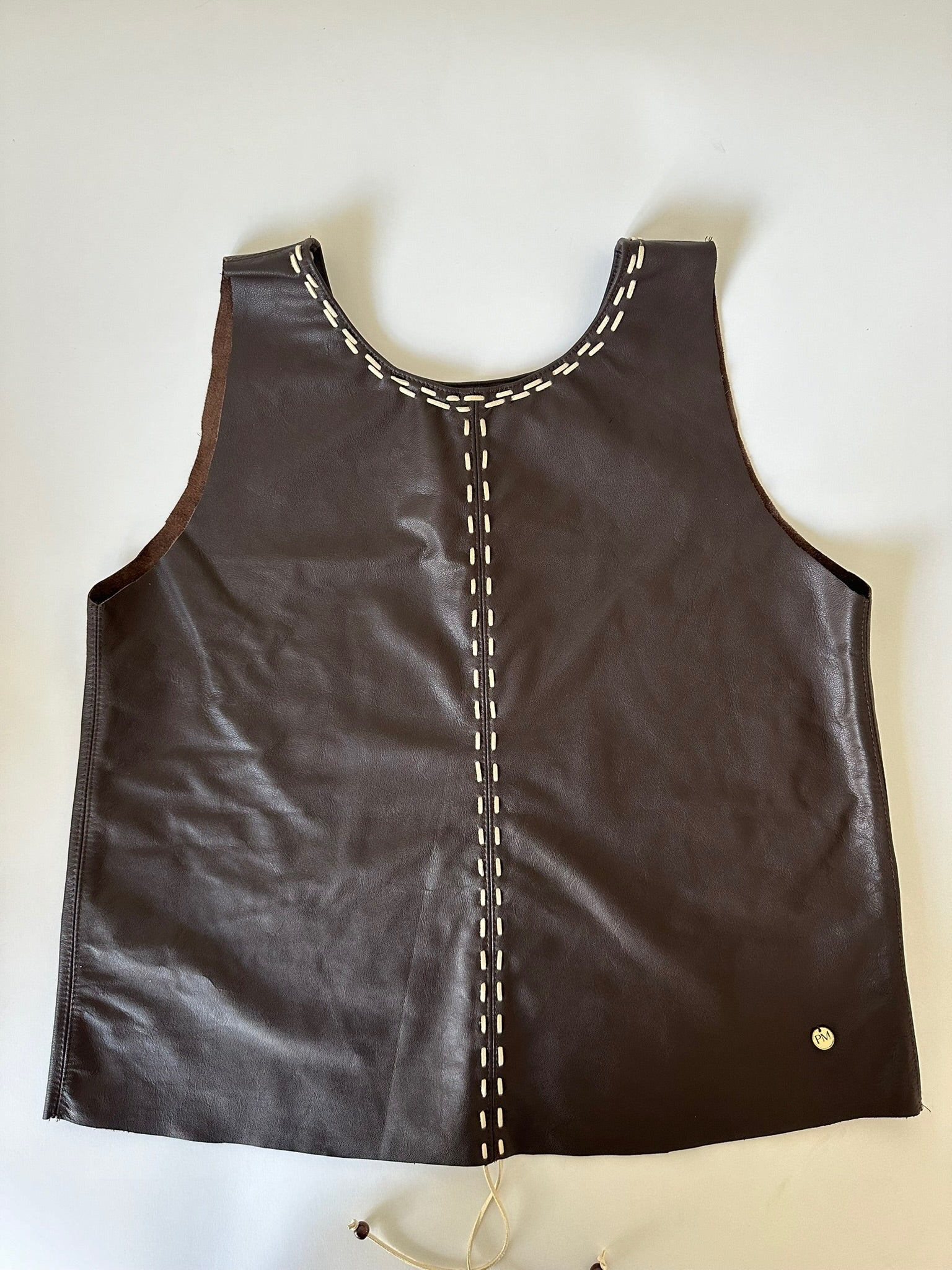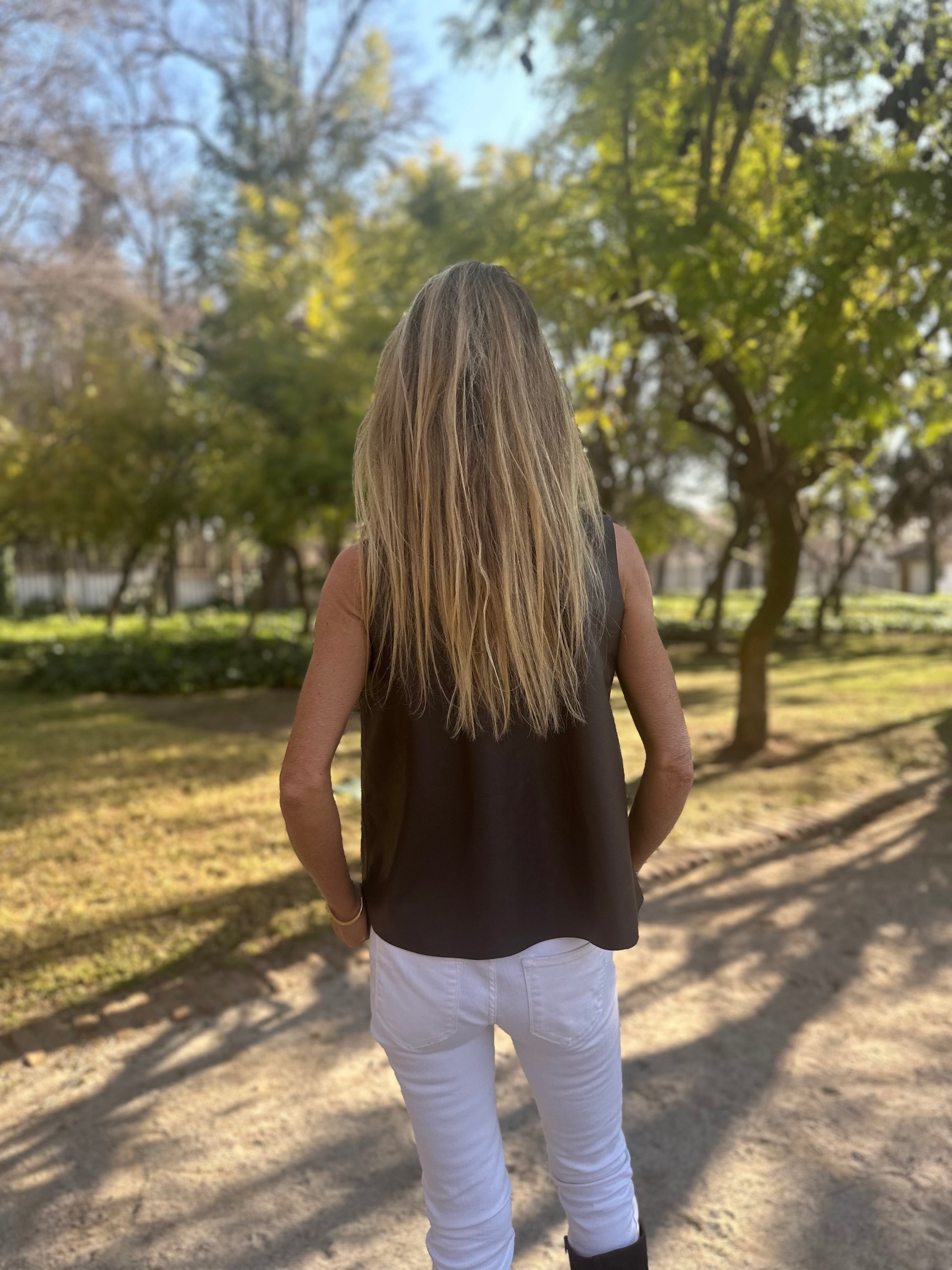 Este top en cuero de oveja café chocolate, mezcla lo elegante y casual; lo ribeteamos con un color en gamuza crudo en su parte delantera y en todo el borde del cuello, dándole más luz y un toque diferente.