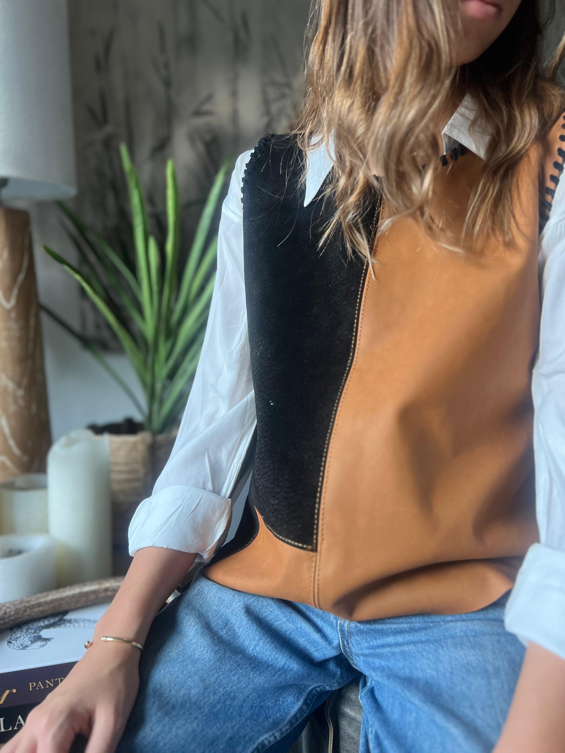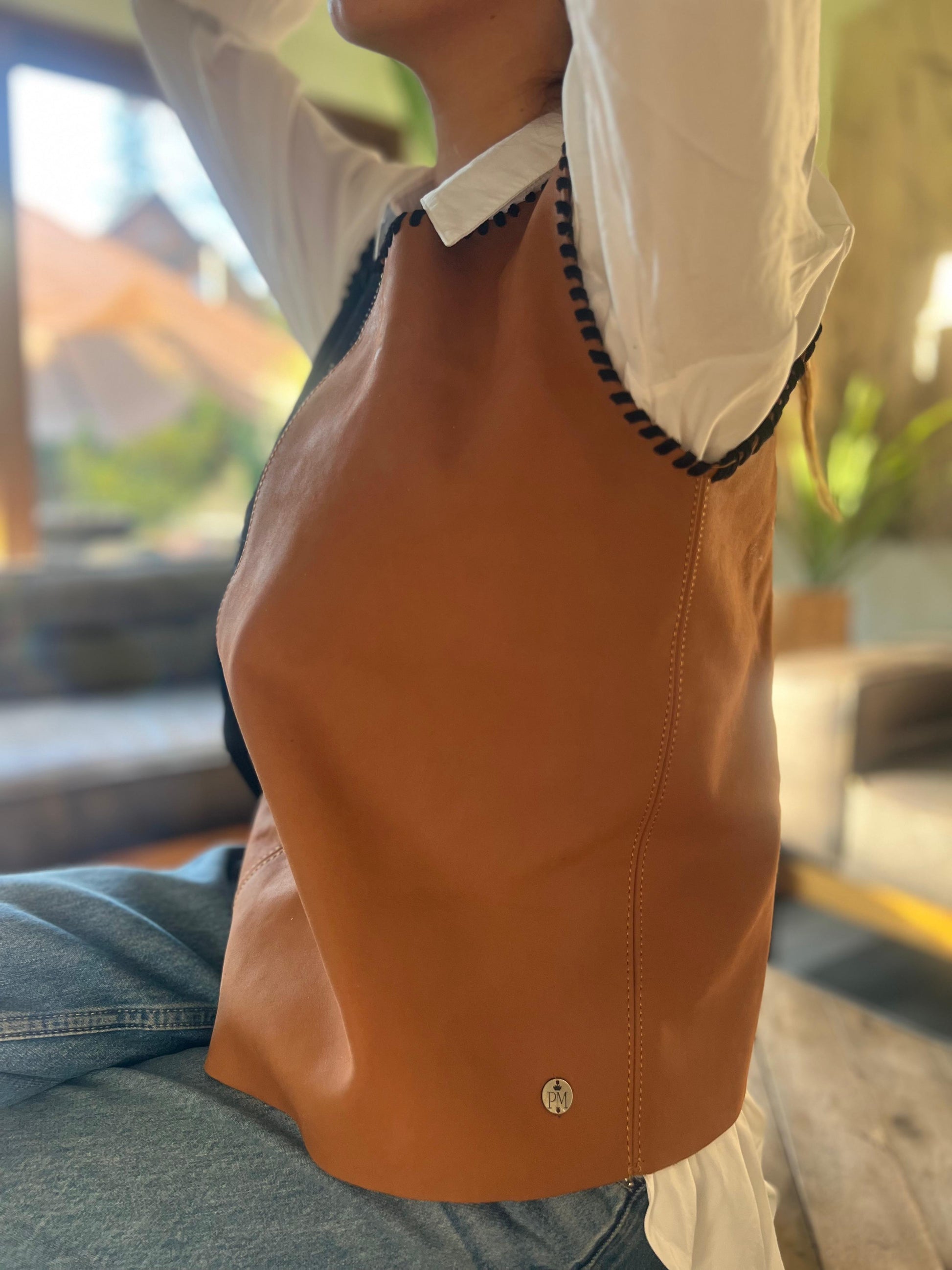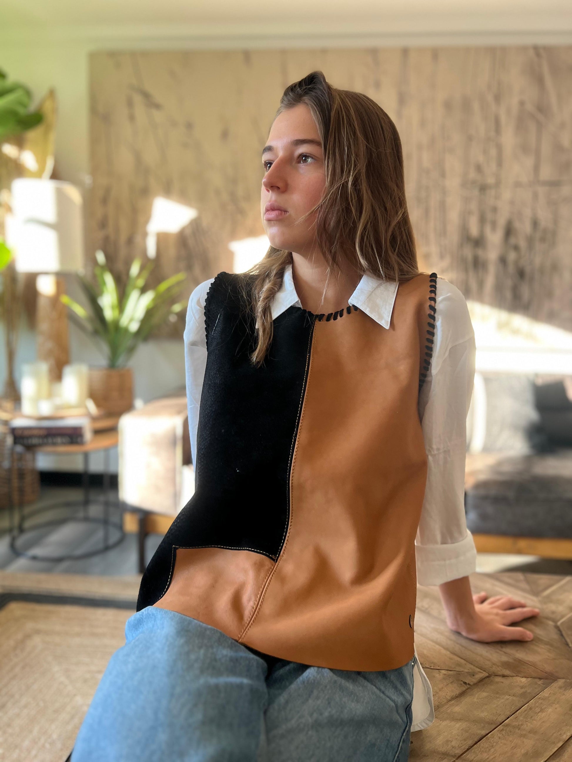 Este exclusivo Top Antonia combina cuero beige y negro en el delantero, la espalda en camel y un elegante detalle de embarrilado en gamuza negra . aportando sofisticación y textura única. Su diseño cuidadoso y materiales nobles garantizan durabilidad y estilo atemporal, ideal para quienes buscan una prenda distintiva y de alta calidad.