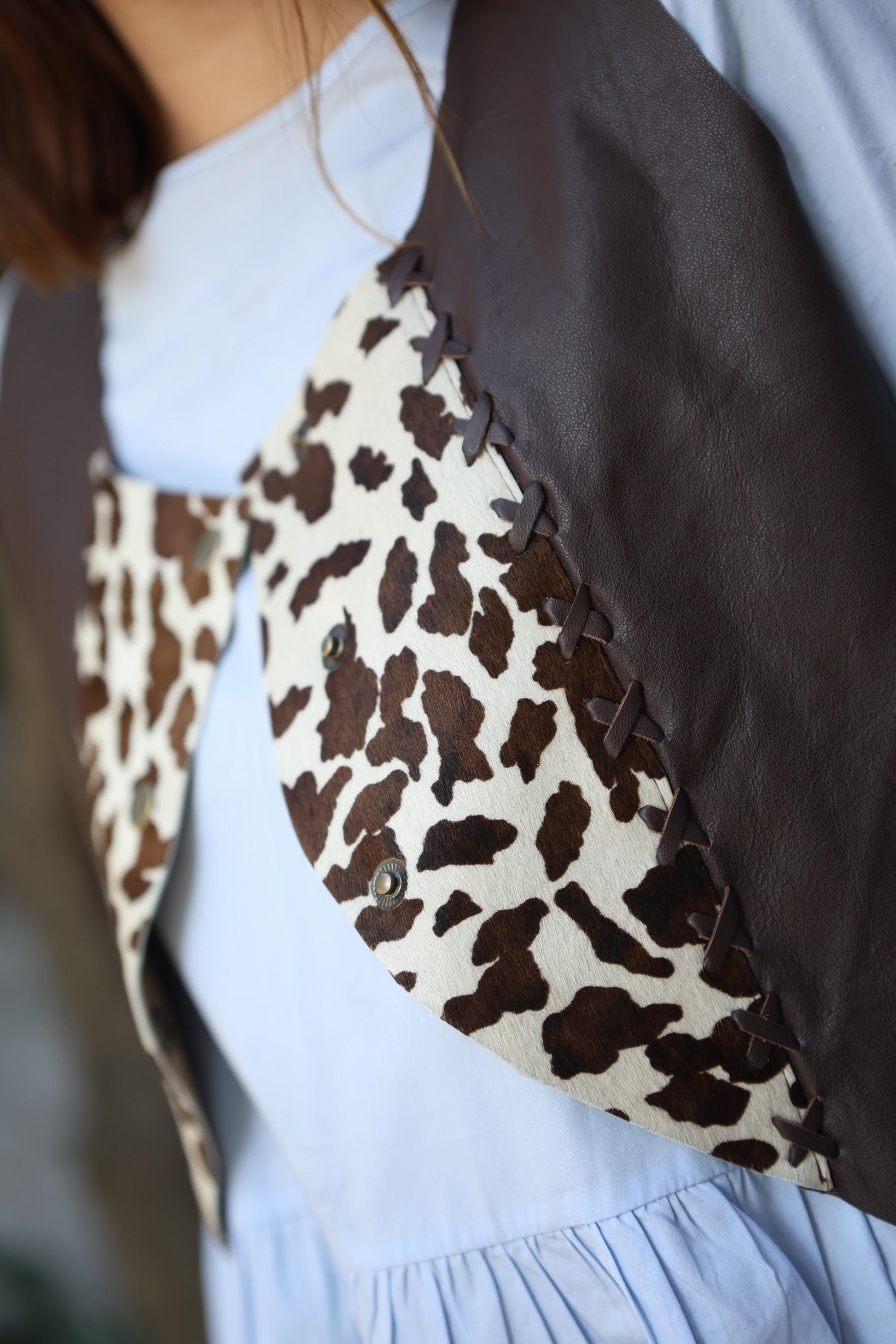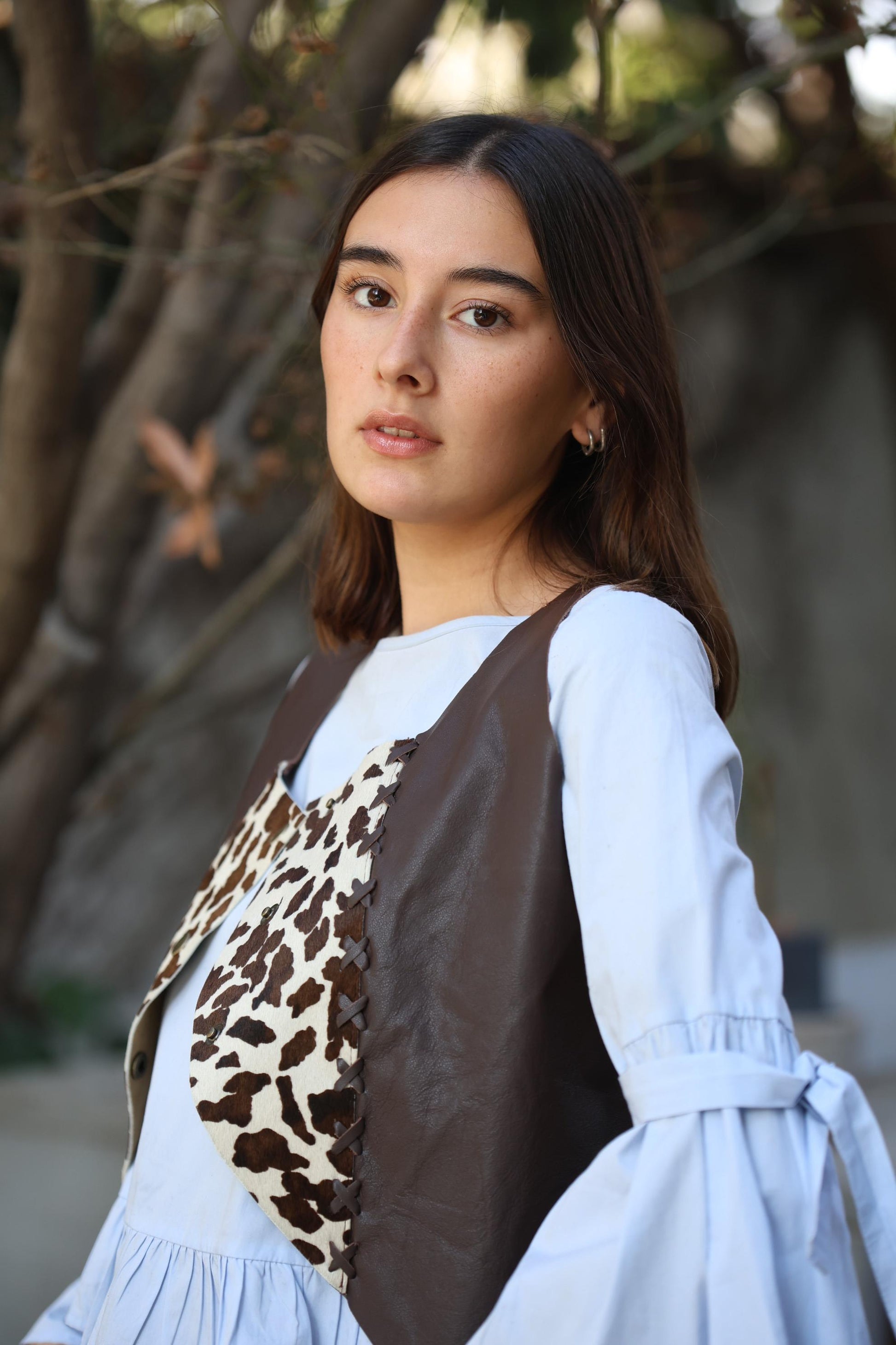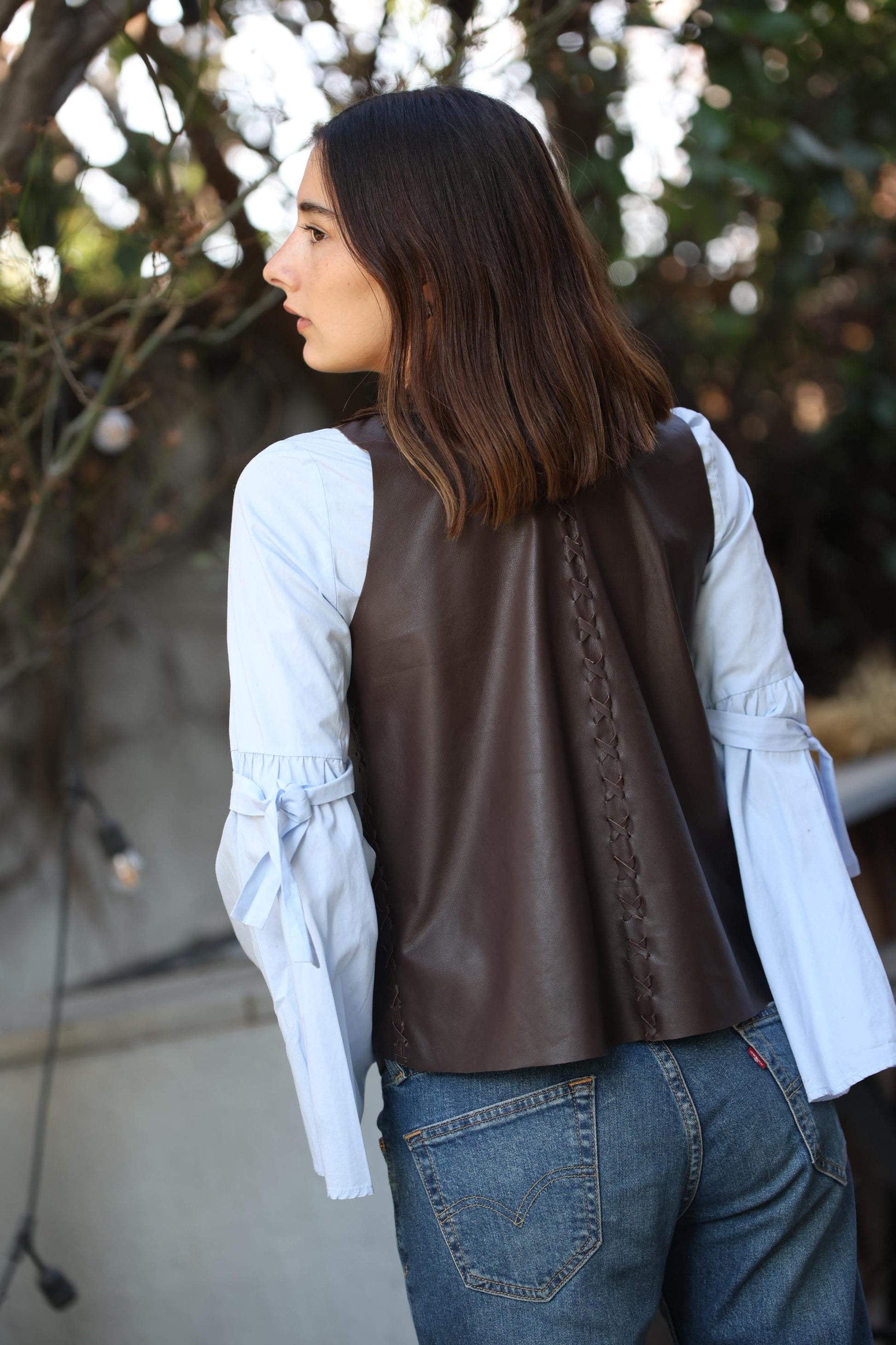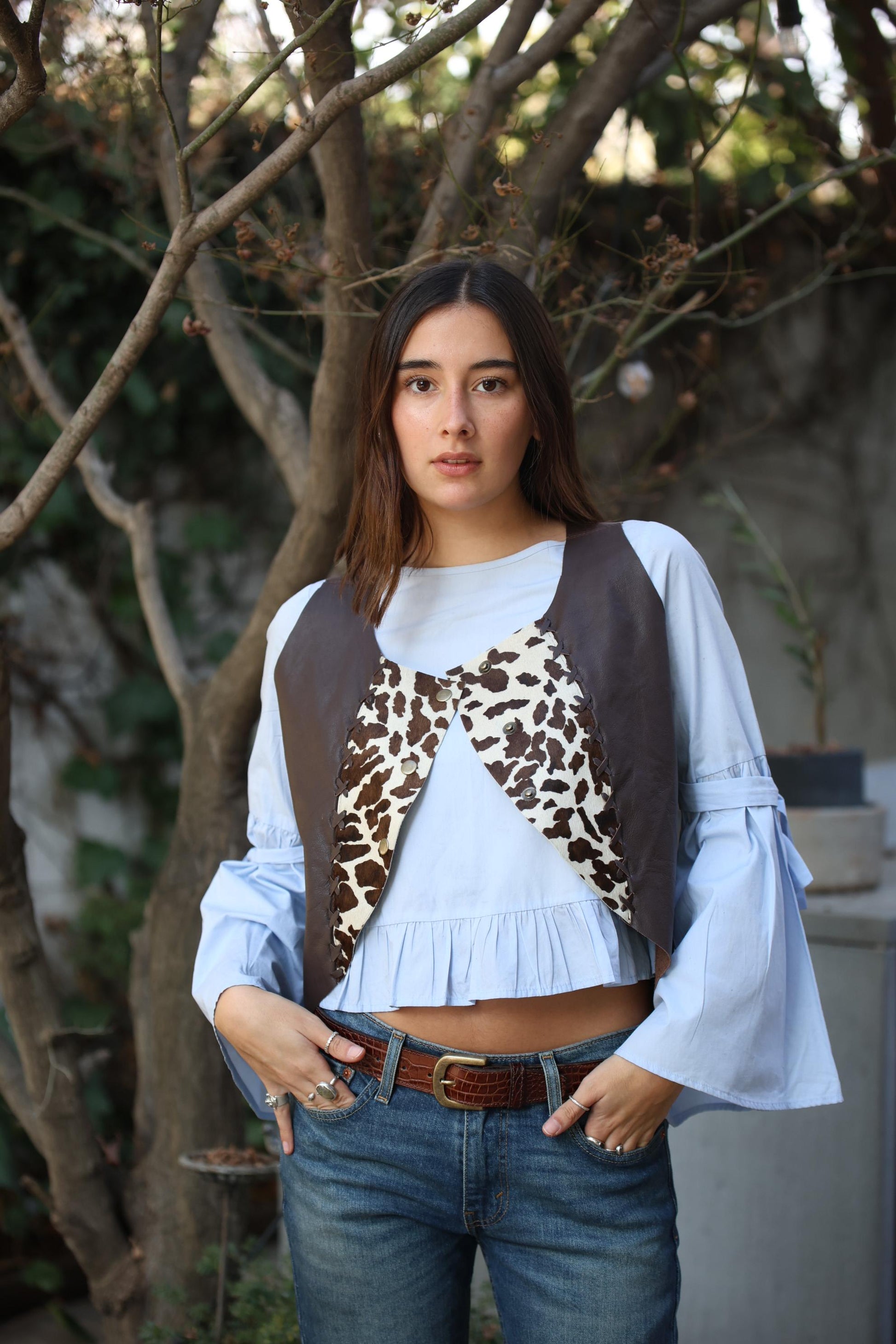 Este Top Antonia está confeccionado en cuero de oveja moka, ofreciendo una textura suave y duradera. Su diseño permite usarlo tanto como un top o como un gilet,, gracias a su abrochado exclusivo en la espalda, que aporta un toque sofisticado y funcional e incorpora piel. Los pespuntes de cuero en cruces en el mismo tono realzan su acabado, combinando elegancia y versatilidad. Ideal para quienes buscan un estilo contemporáneo con materiales nobles.