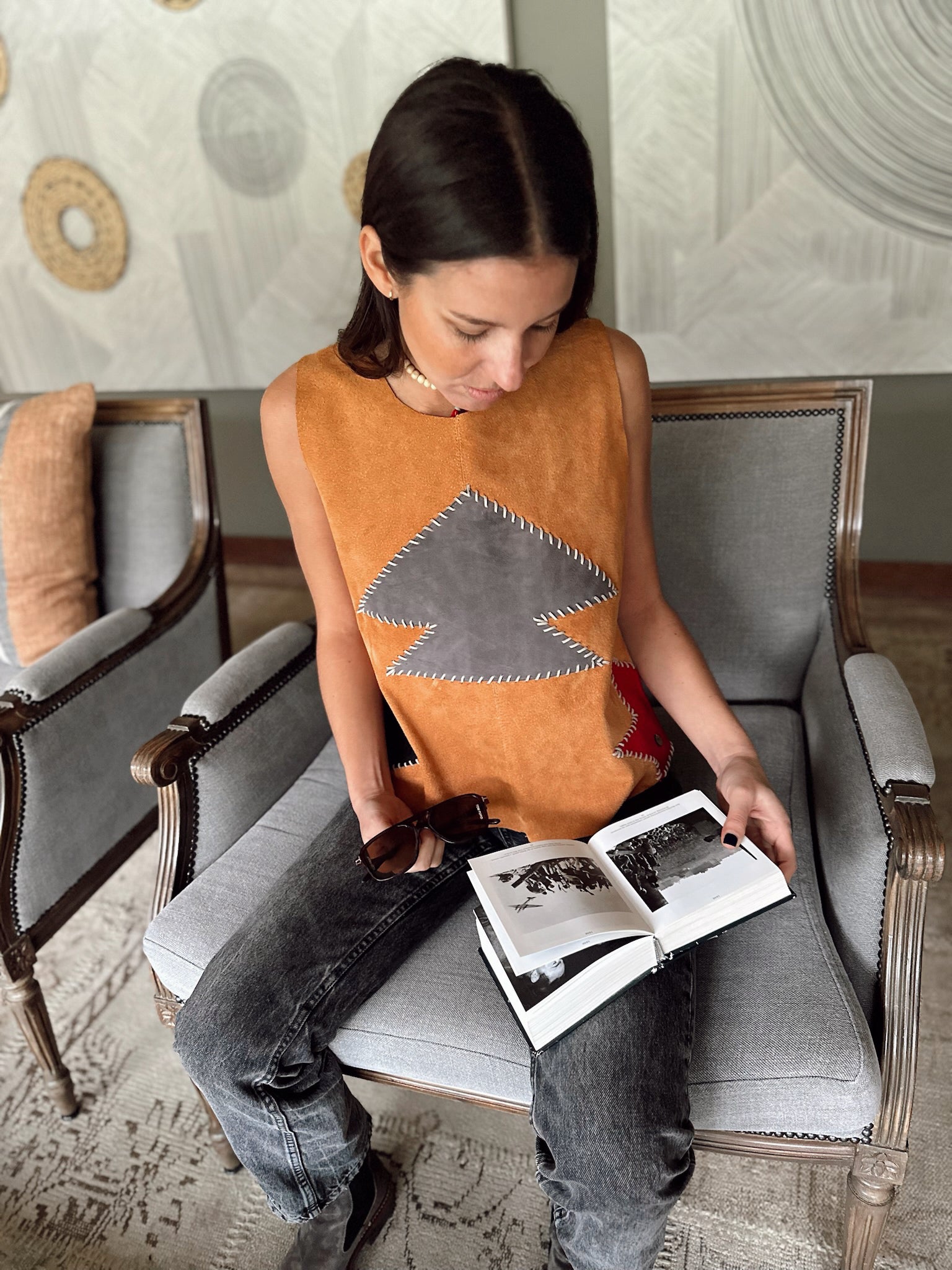 Este top en color beige genera un contraste precioso con el color gris y rojo de las aplicaciones, junto con las puntadas en beige. Gracias a sus amarras de gamuza en la parte de atrás, lo puedes usar como top o como un original gilet.