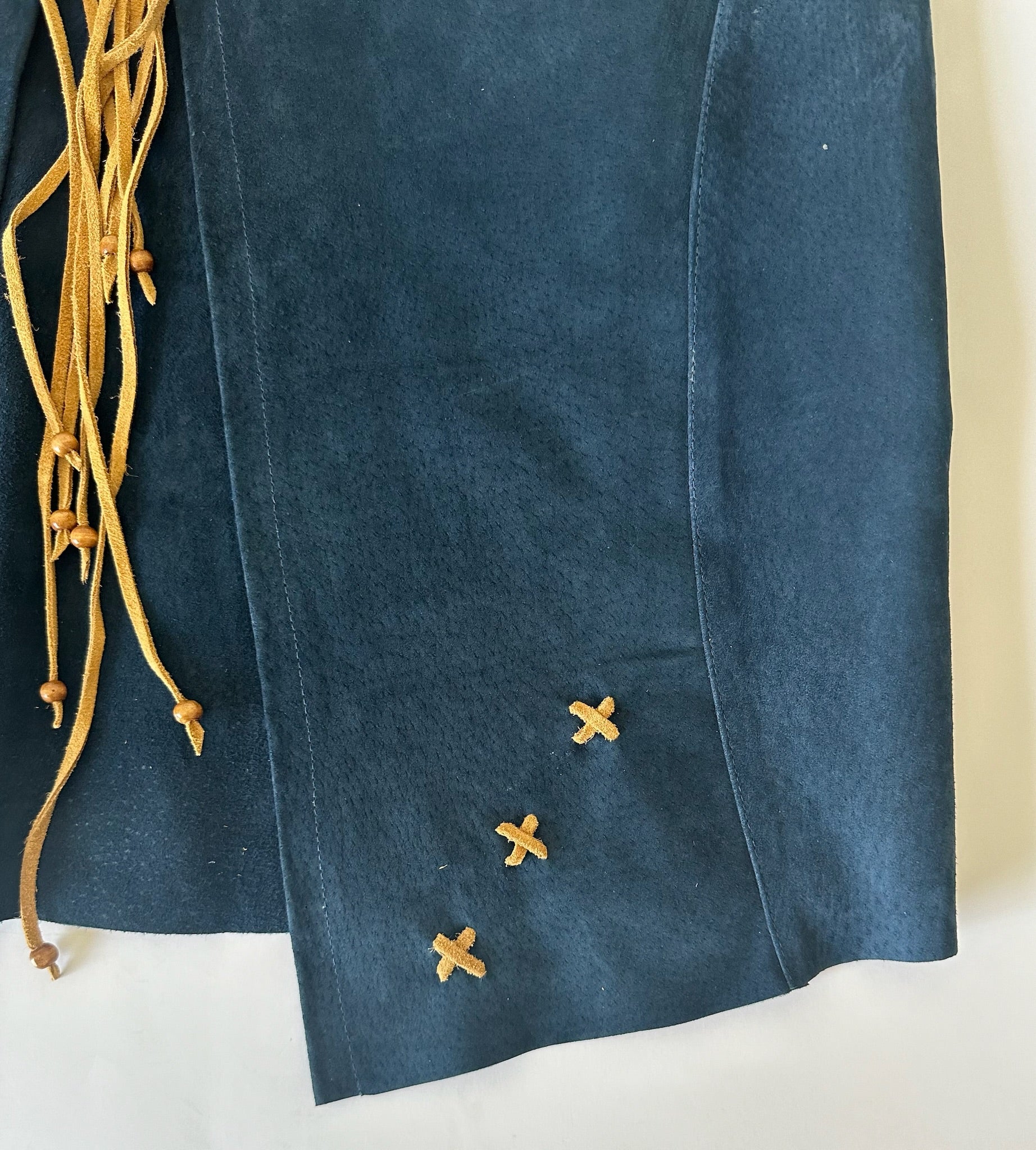 Este top en color azul marino es perfecto para las diferentes temporadas del año. Perfecto para el verano y en invierno ideal para usarlo con una blusa debajo de éste. Se destaca por sus detalles en cruz en ambos costados en color beige y abajo en la espalda como sale en la foto. Gracias a sus amarras en la parte de atrás permite poder usarlo como un original gilet.