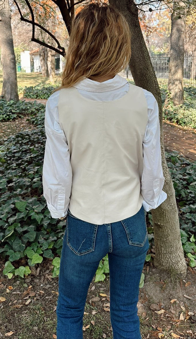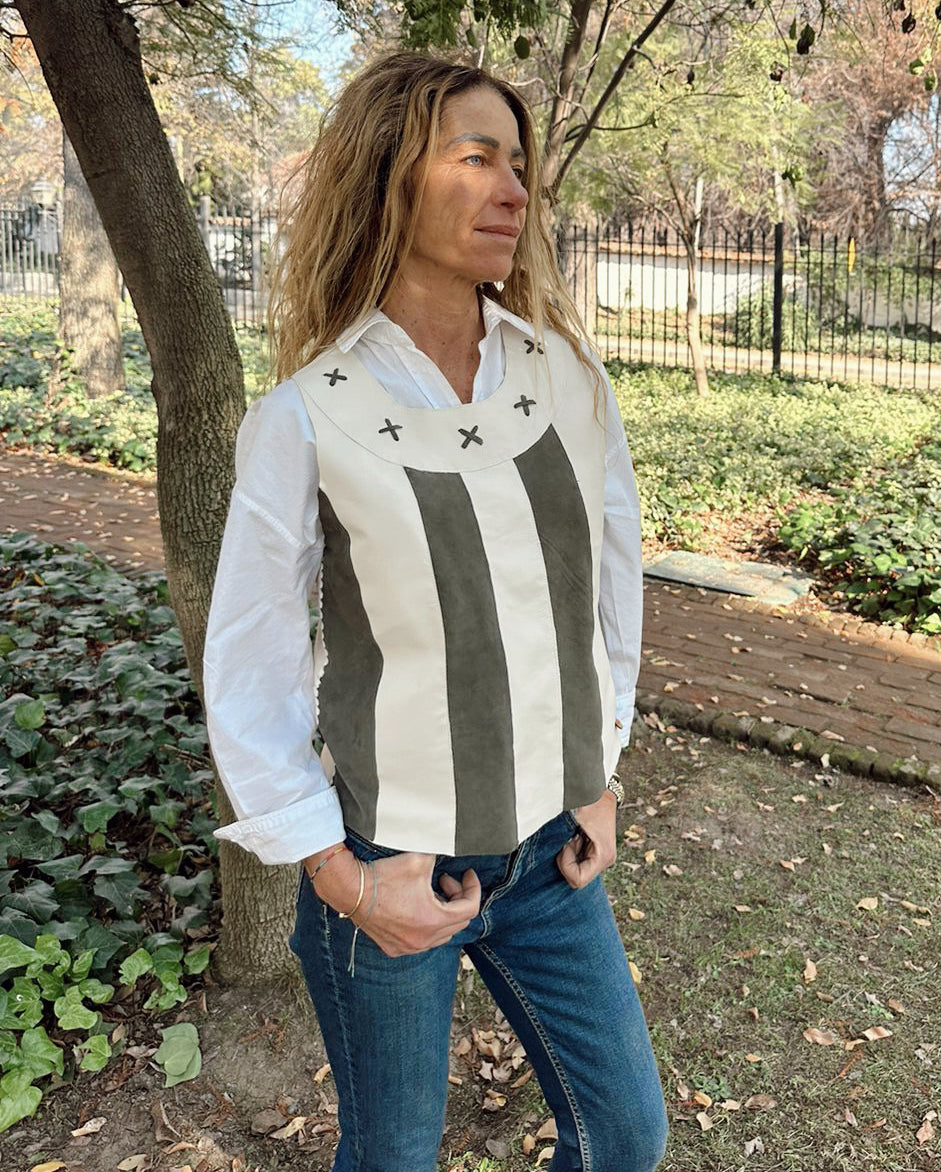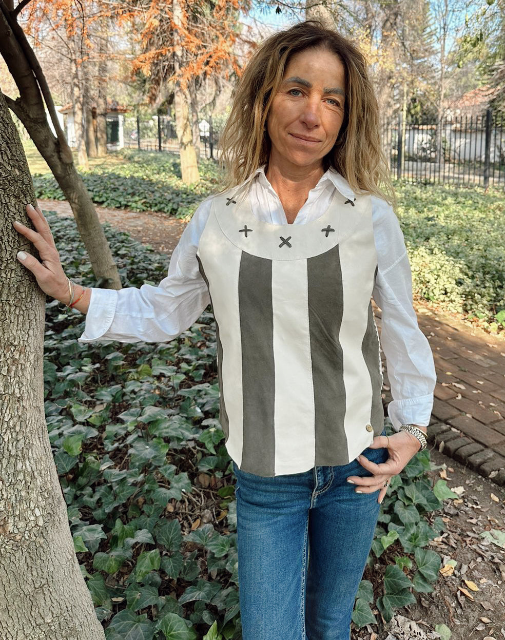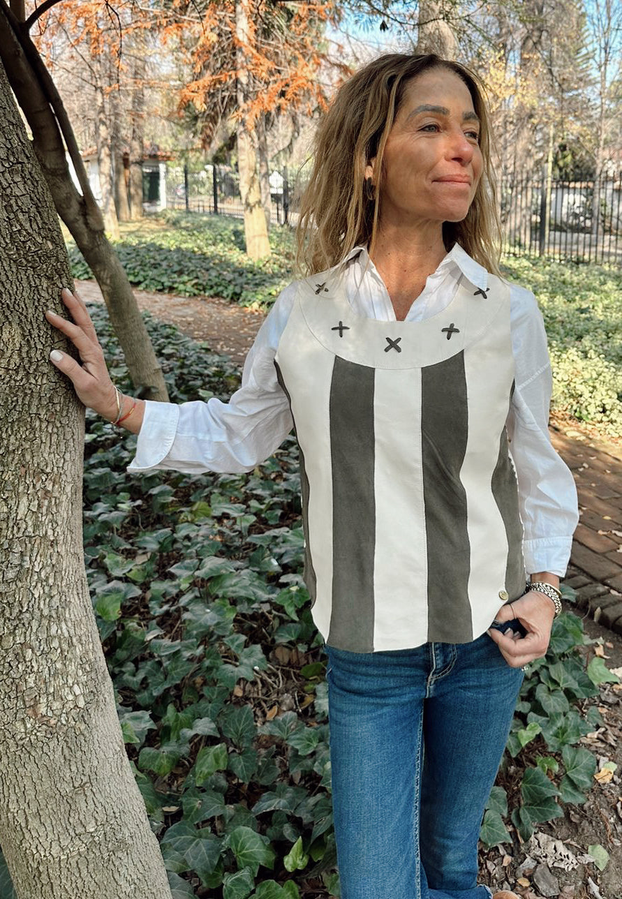 Este maravilloso top en gamuza verde y cuero color crudo, va con un detalle precioso en su escote con sus puntadas en cruz.
