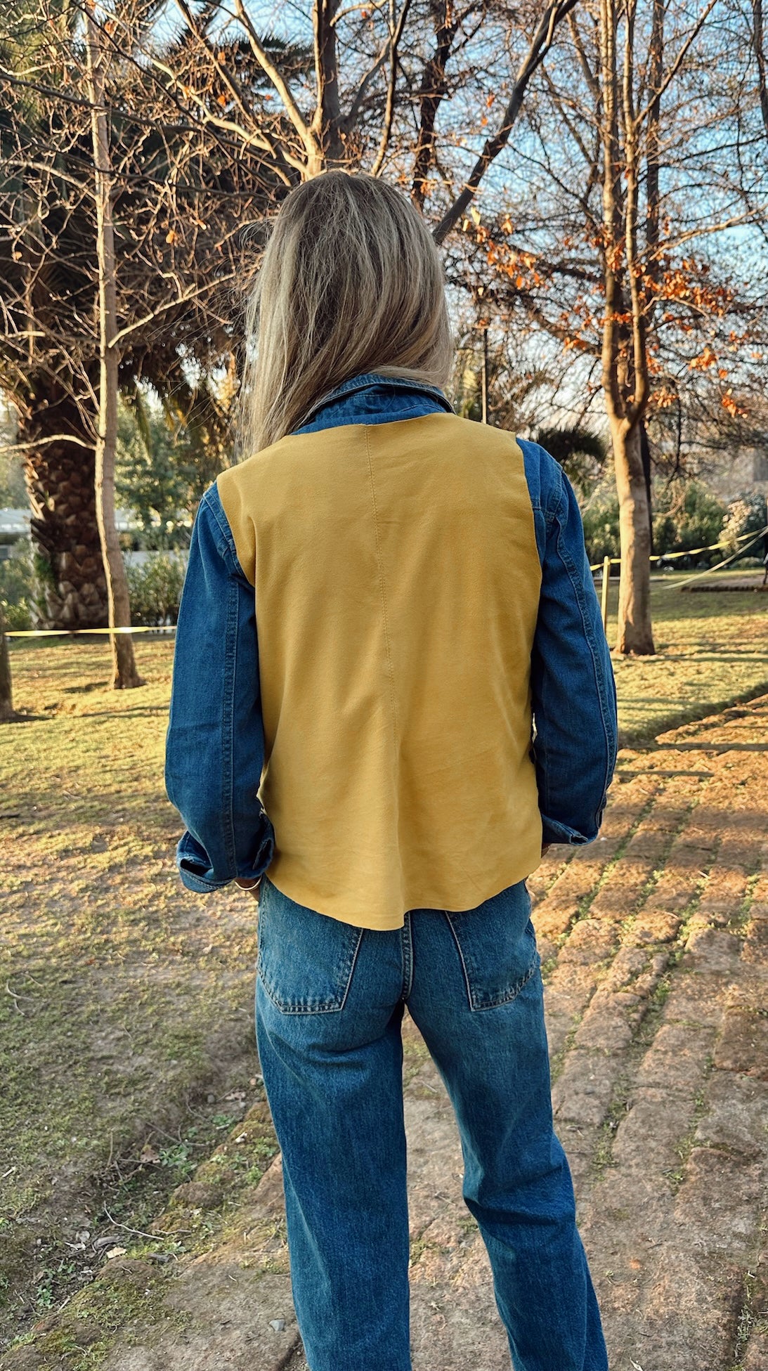 Top Antonia en gamuza anapada amarilla suave exquisita! embarrilado en gamuza azul en todo su escote y costados. Increíble su colorido.