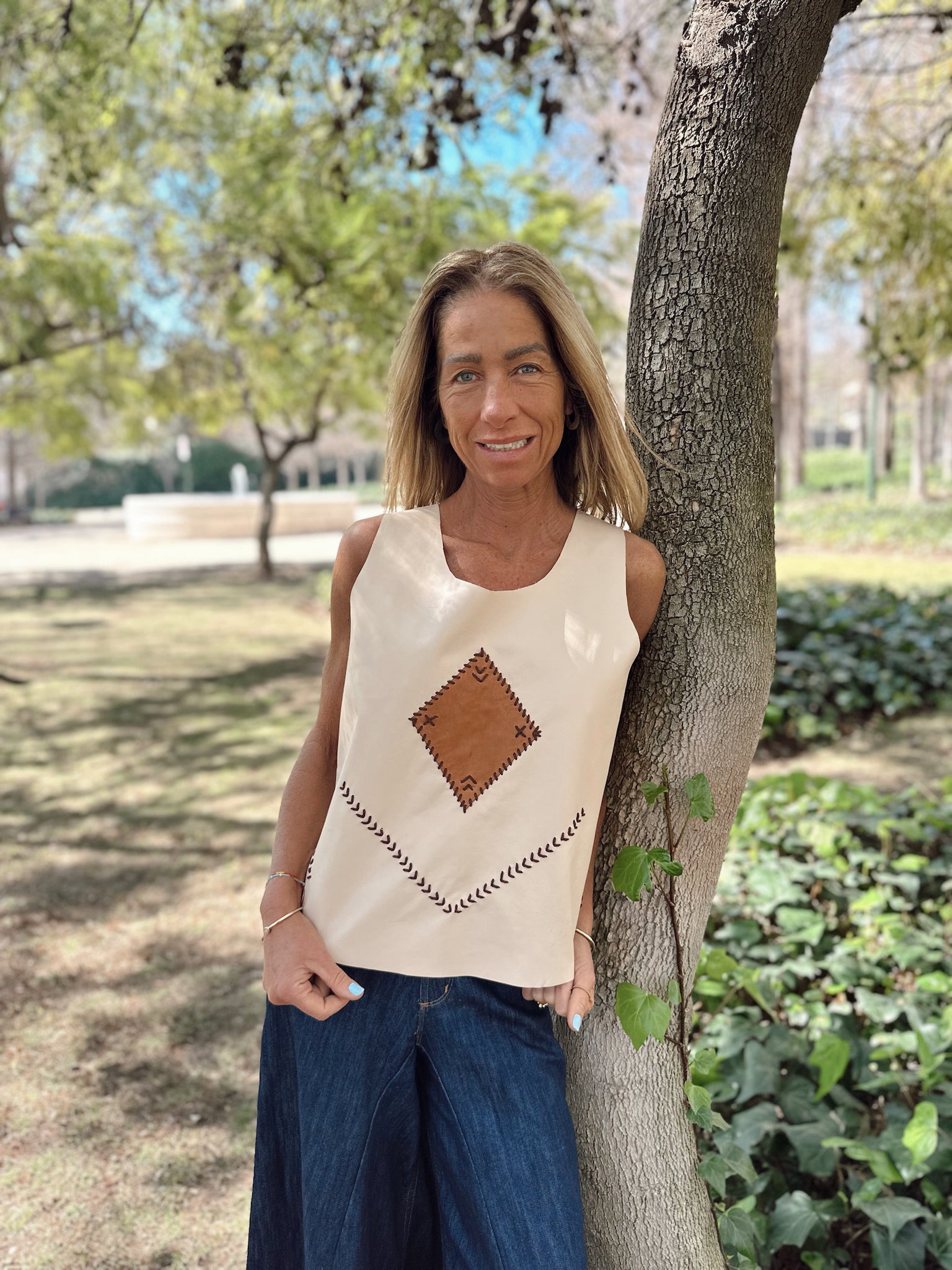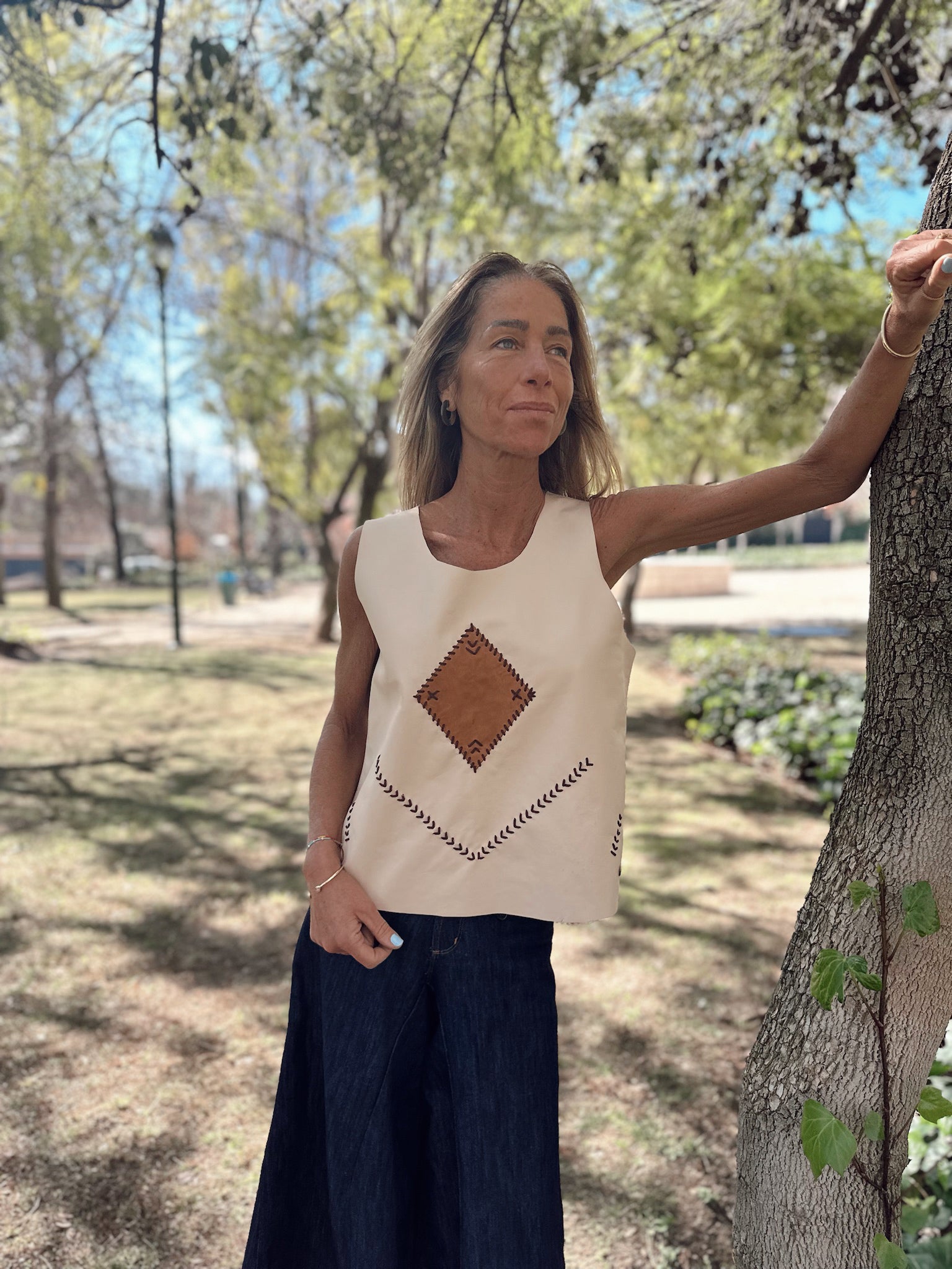 Top Delfina étnico, en cuero crudo, con aplicaciones en cuero beige y detalles en gamuza.
