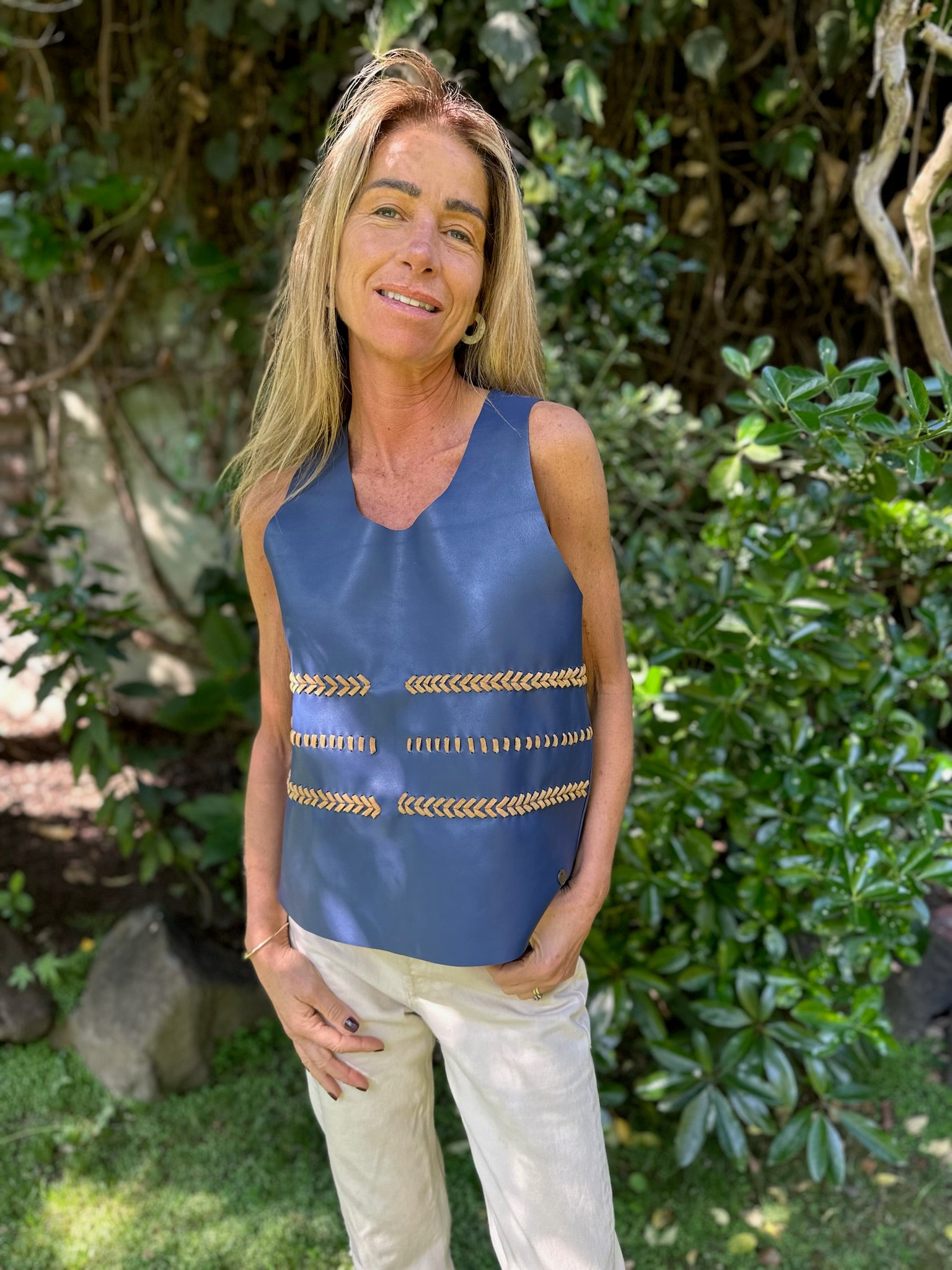 Este maravilloso top en cuero azul, tiene sus detalles en la parte frontal, en gamuza beige. único con la mezcla de materiales en la parte frontal.