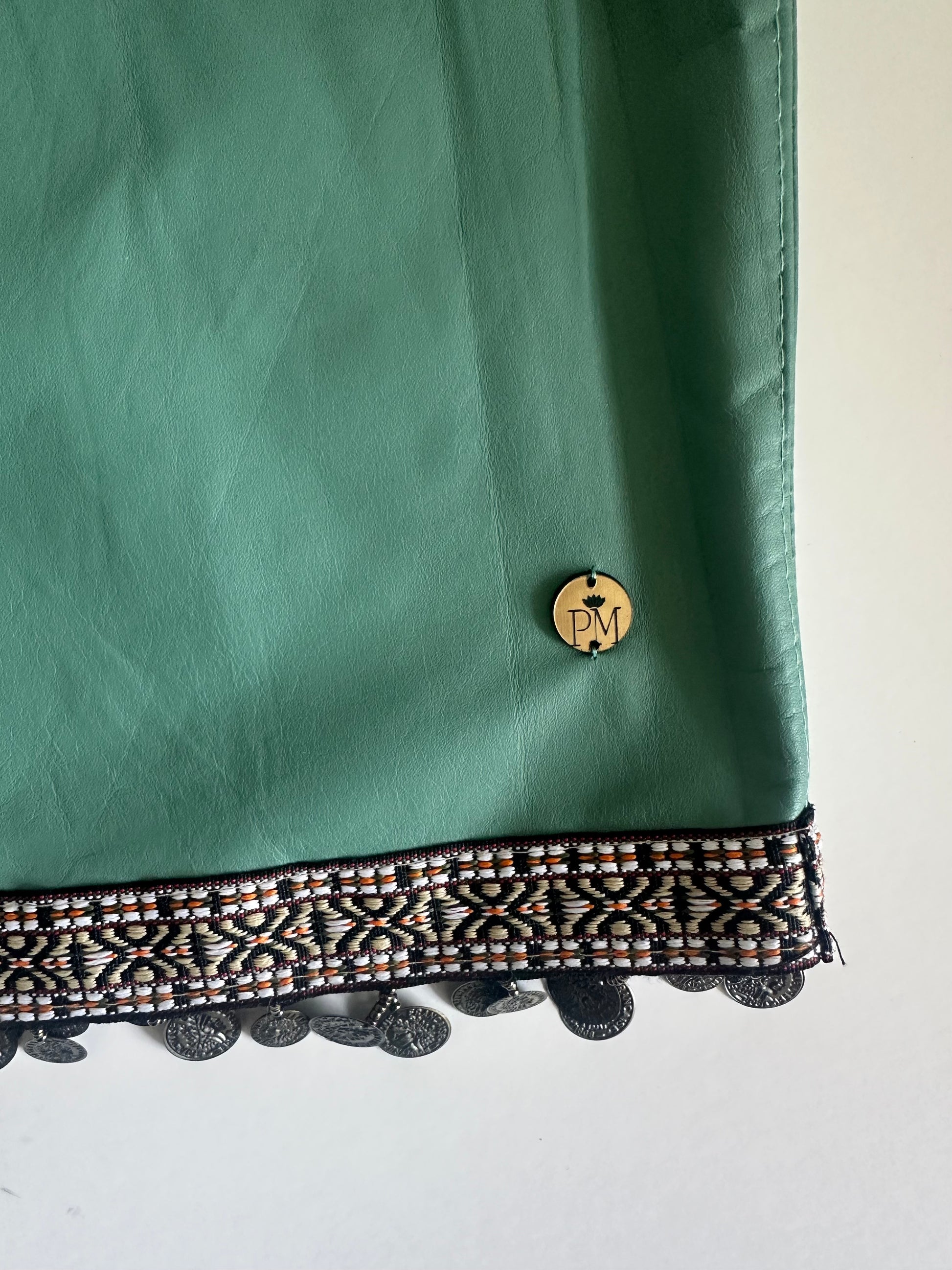 Este top Delfina hecho en cuero de oveja verde, con su detalle de monedas que cuelgan en la terminación del detalle étnico.