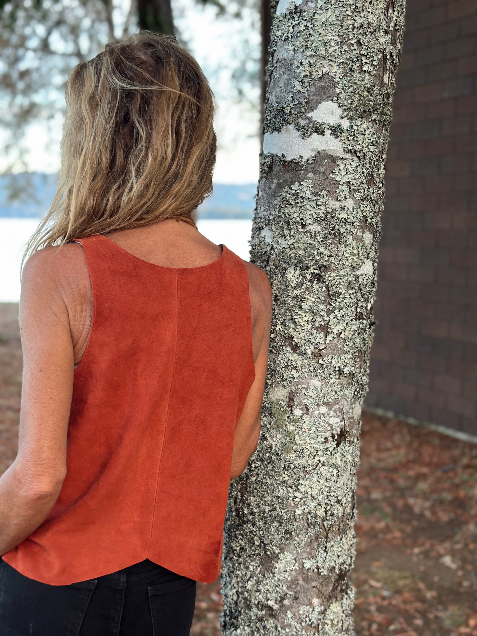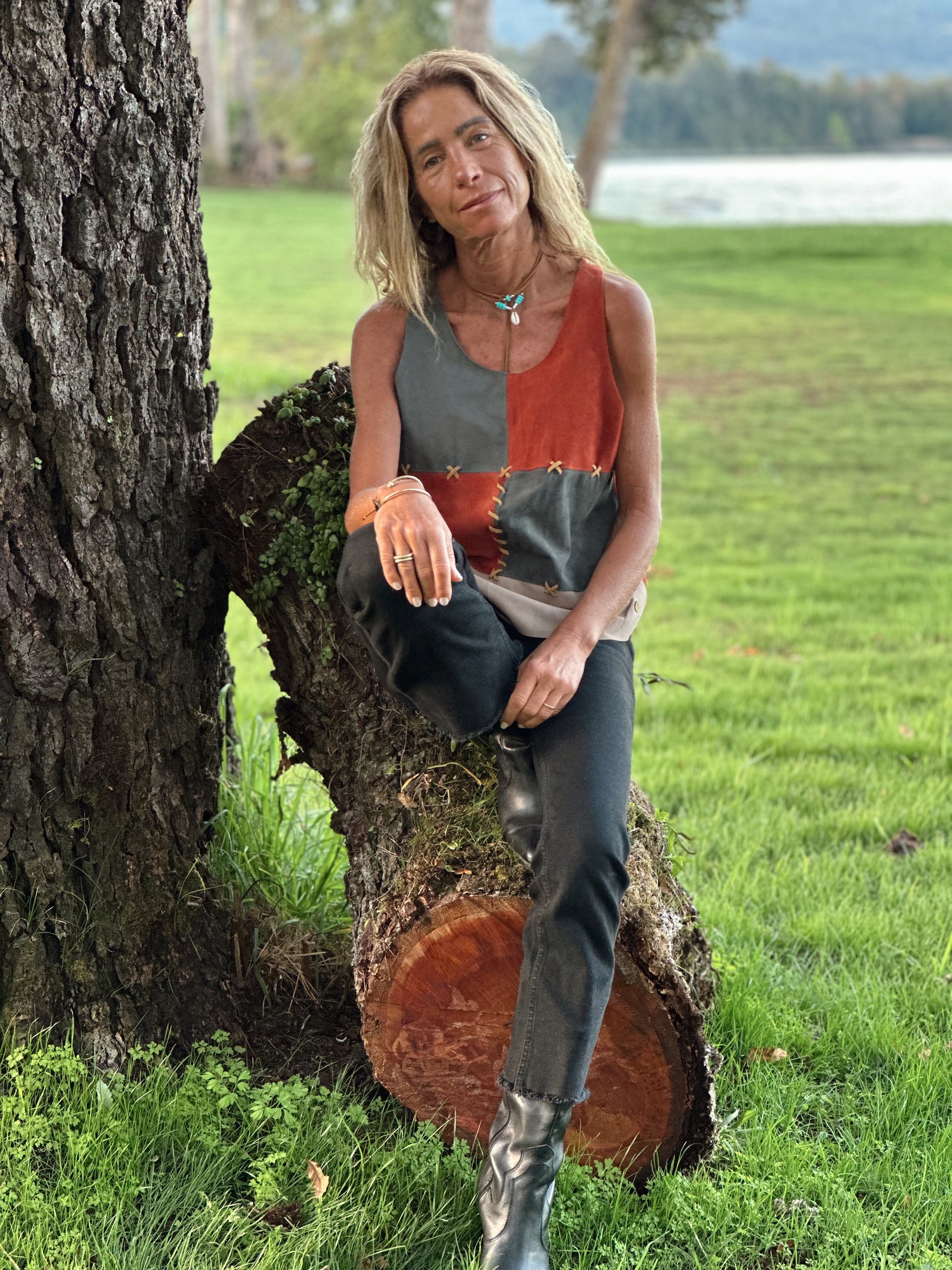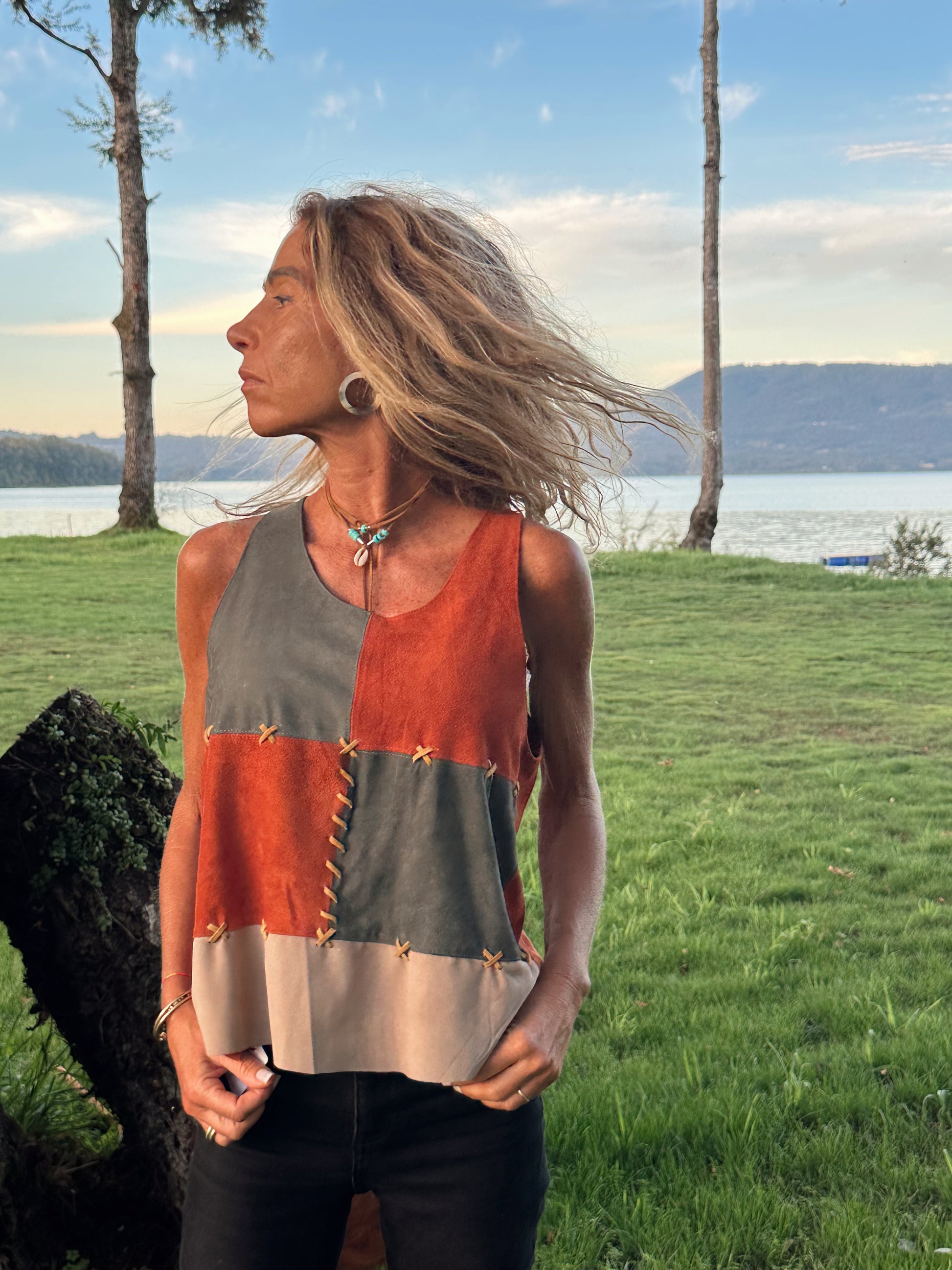 Este Top Delfina en gamuza anapada se atreve mezclando verde, rojo y gris, uniéndolos entre sí con puntadas en color mostaza.
