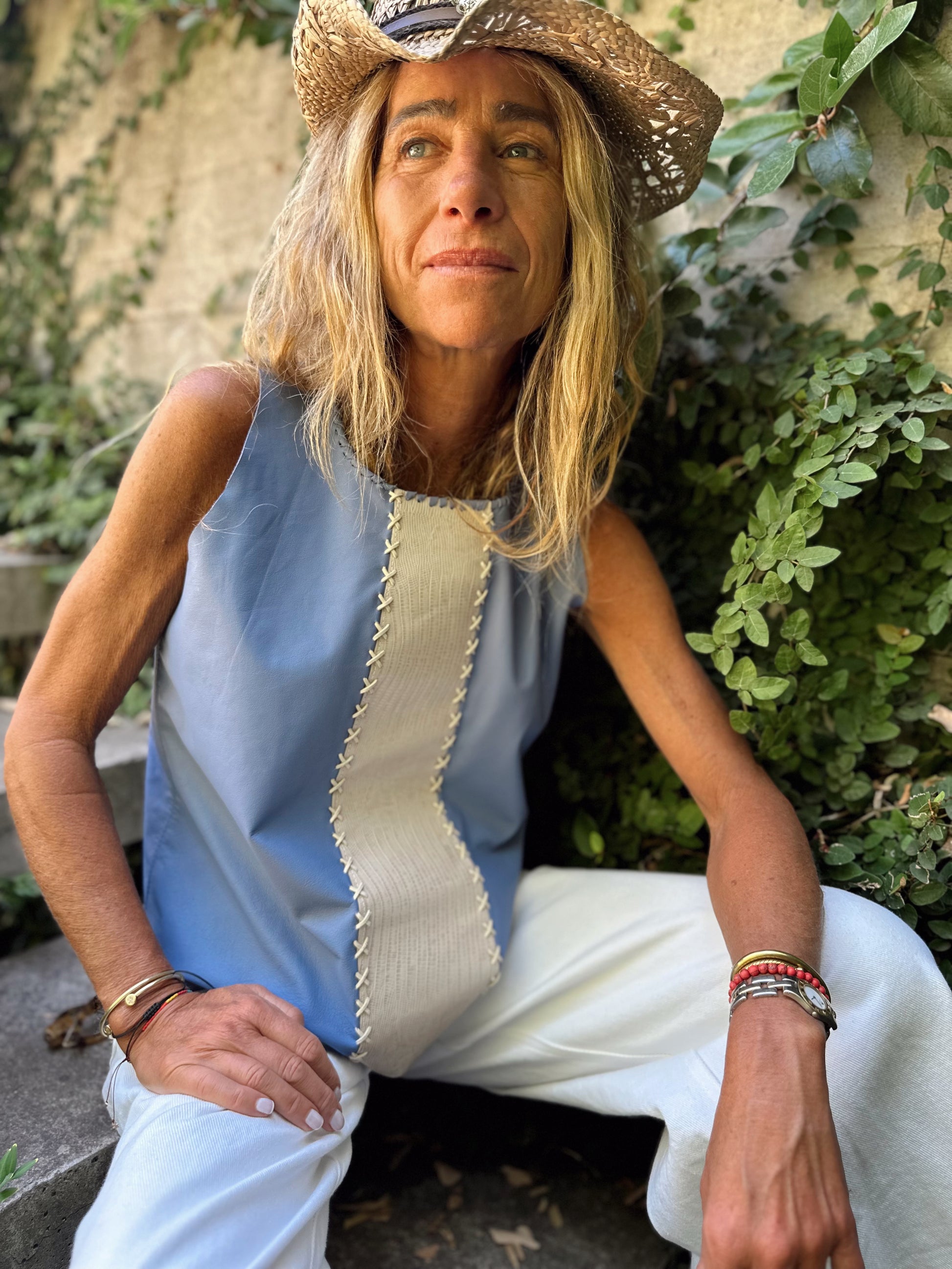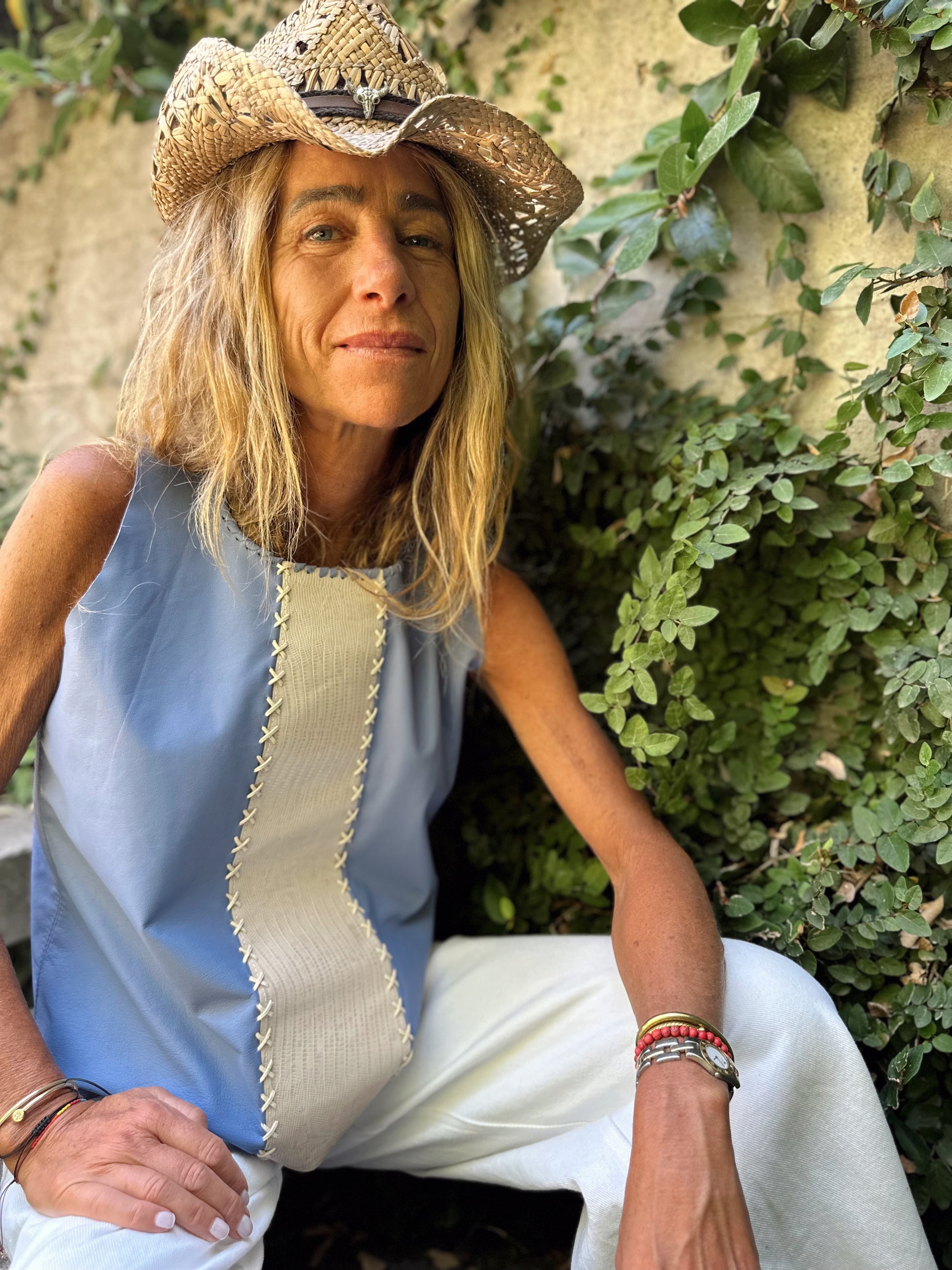 Este precioso top esta confeccionado en cuero de oveja de color celeste, con una elegante aplicación frontal en cuero impreso snake de color crudo.