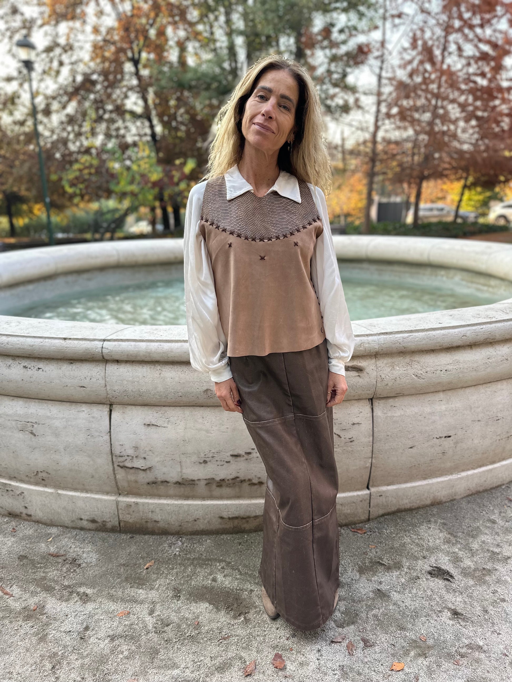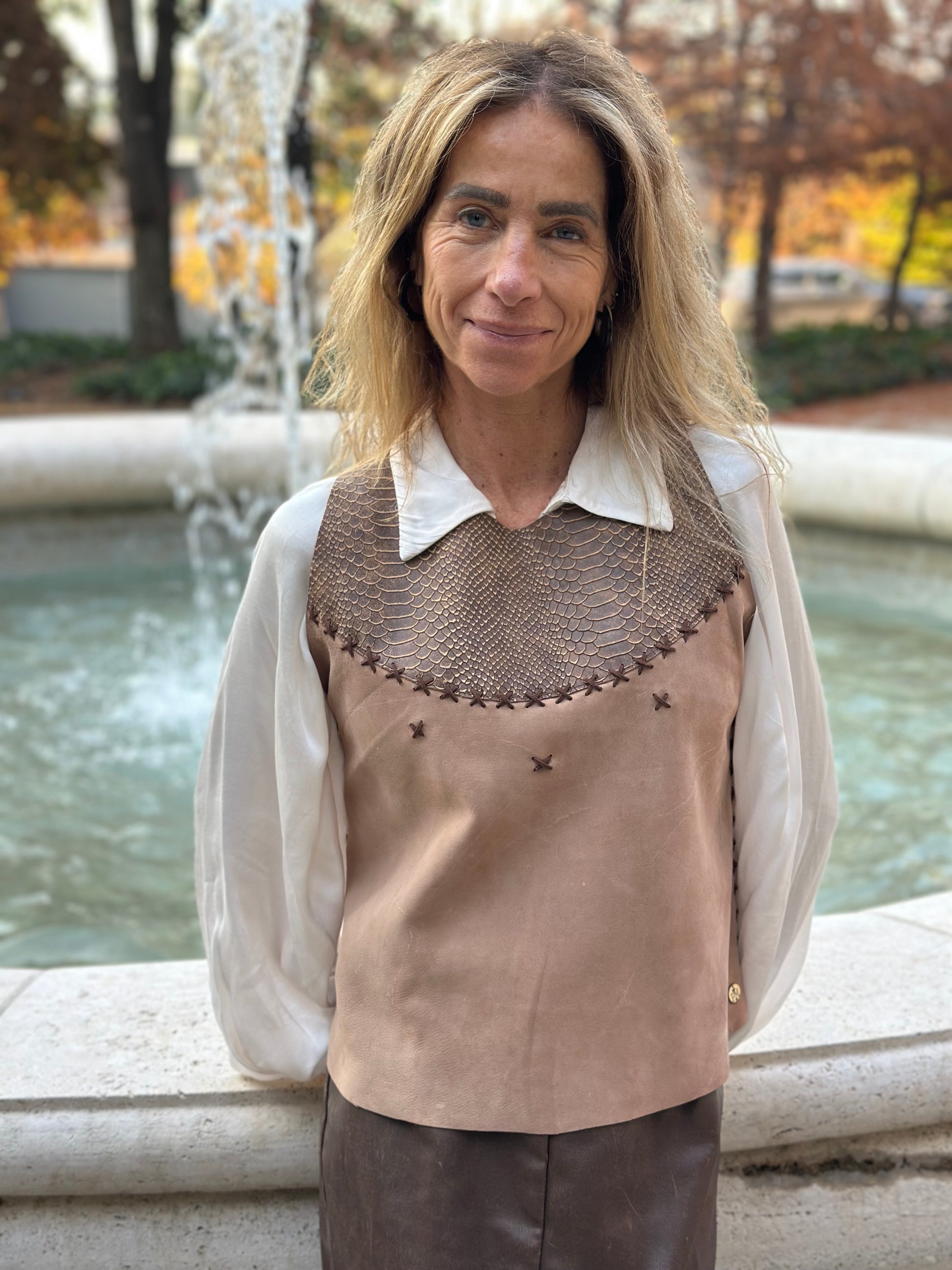 ¡Sorprende con este top en gamuza y cuero croco! Su diseño elegante y combinación de colores te hará lucir increíble, ya sea que lo uses solo o con algo debajo. ¡Atrévete a destacar con este top único en su estilo!