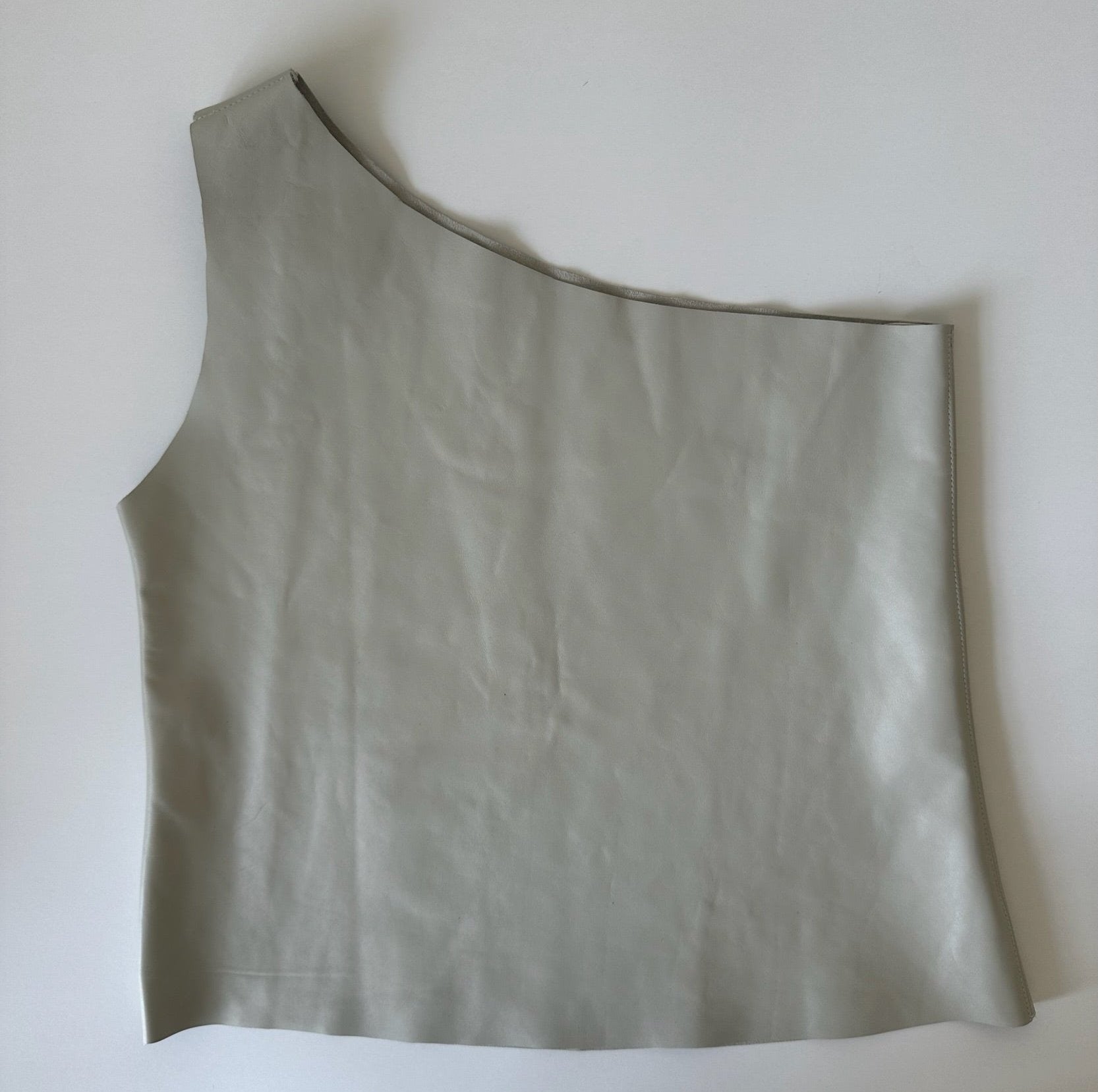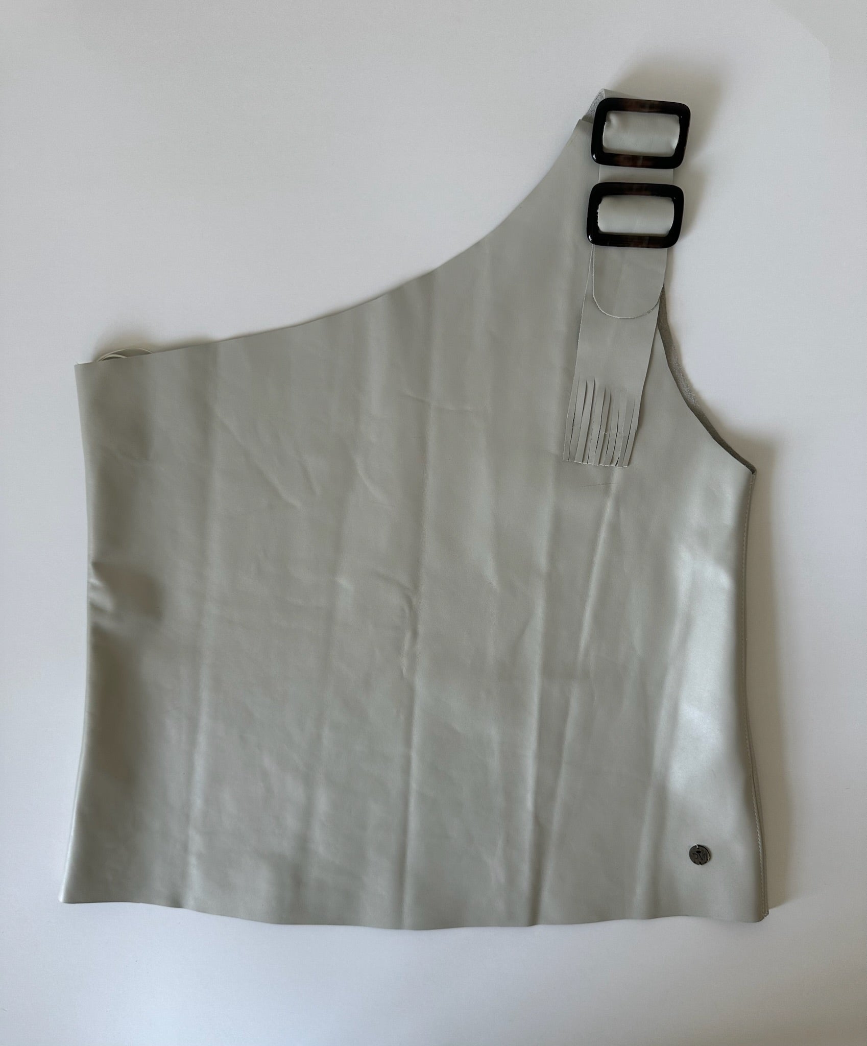 Increíble top en cuero, de una manga. Su detalle único, las hebillas que caen sobre el hombro.