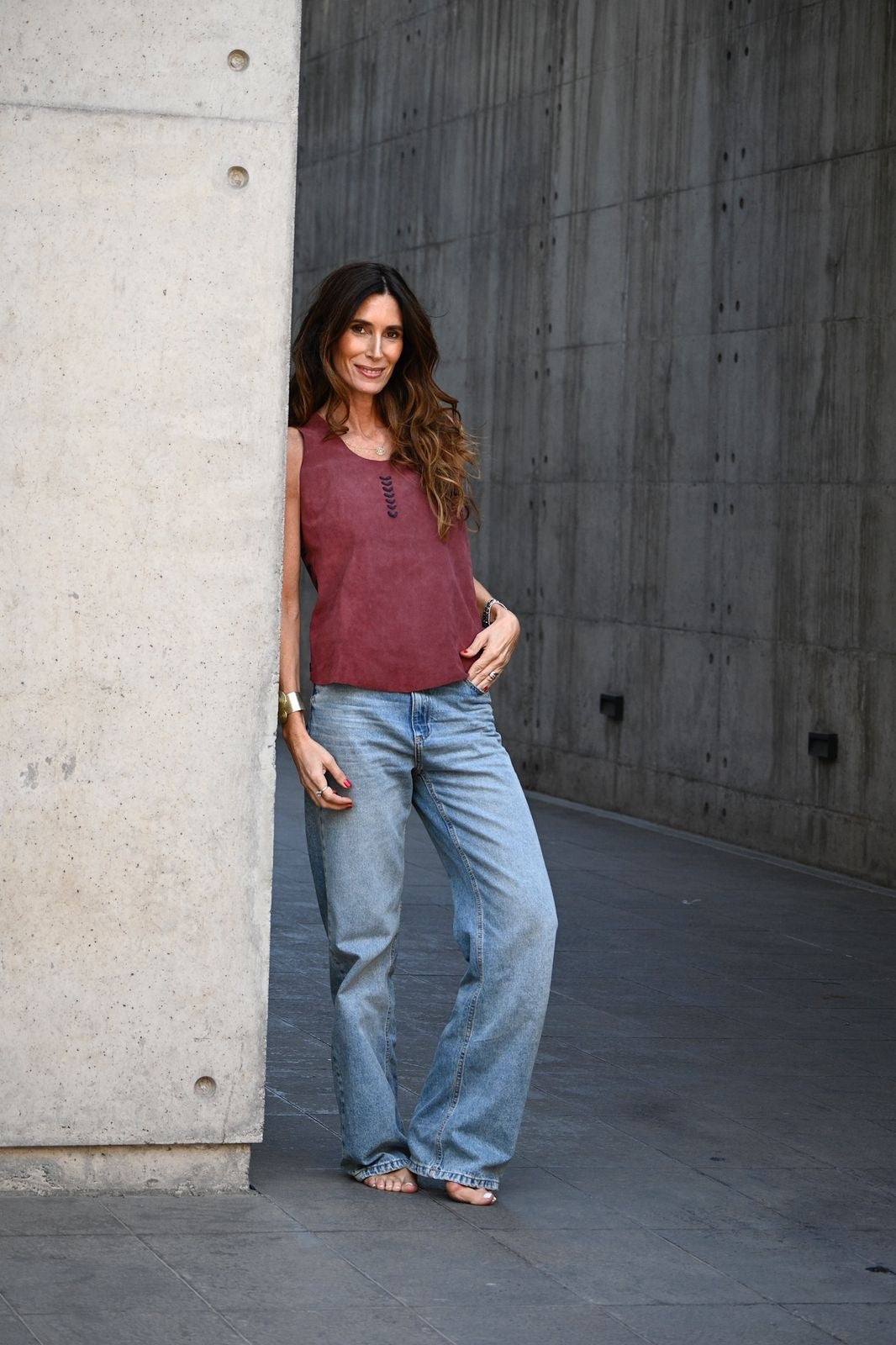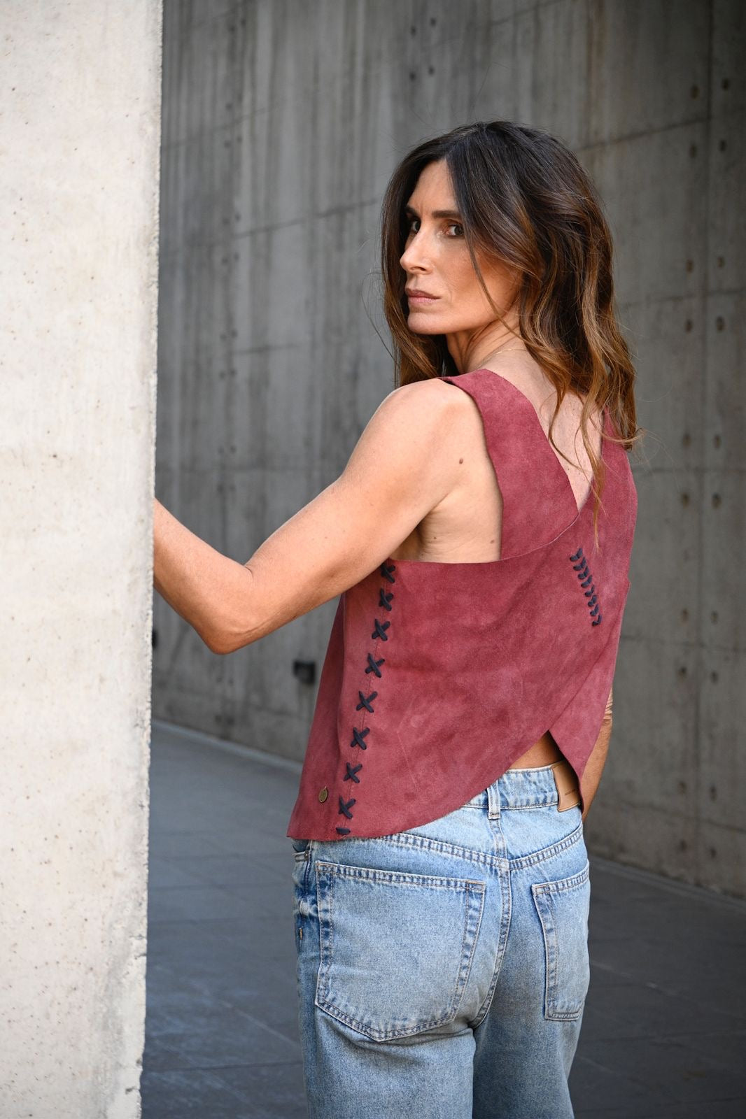 Este Top Martina, confeccionado en gamuza tono magenta, embarrilado en gamuza azul, destaca por su textura suave. Su diseño combina fácilmente, ofreciendo una prenda sofisticada que aporta color y distinción. Ideal para quienes buscan un equilibrio entre elegancia y comodidad en su vestuario.