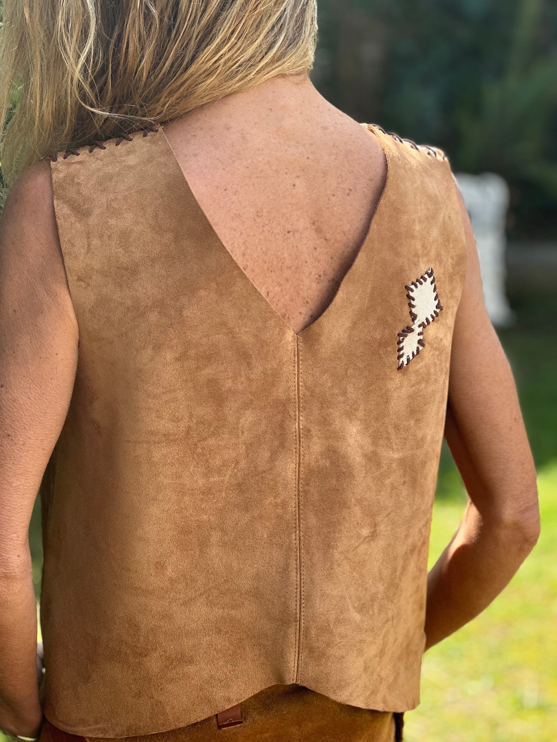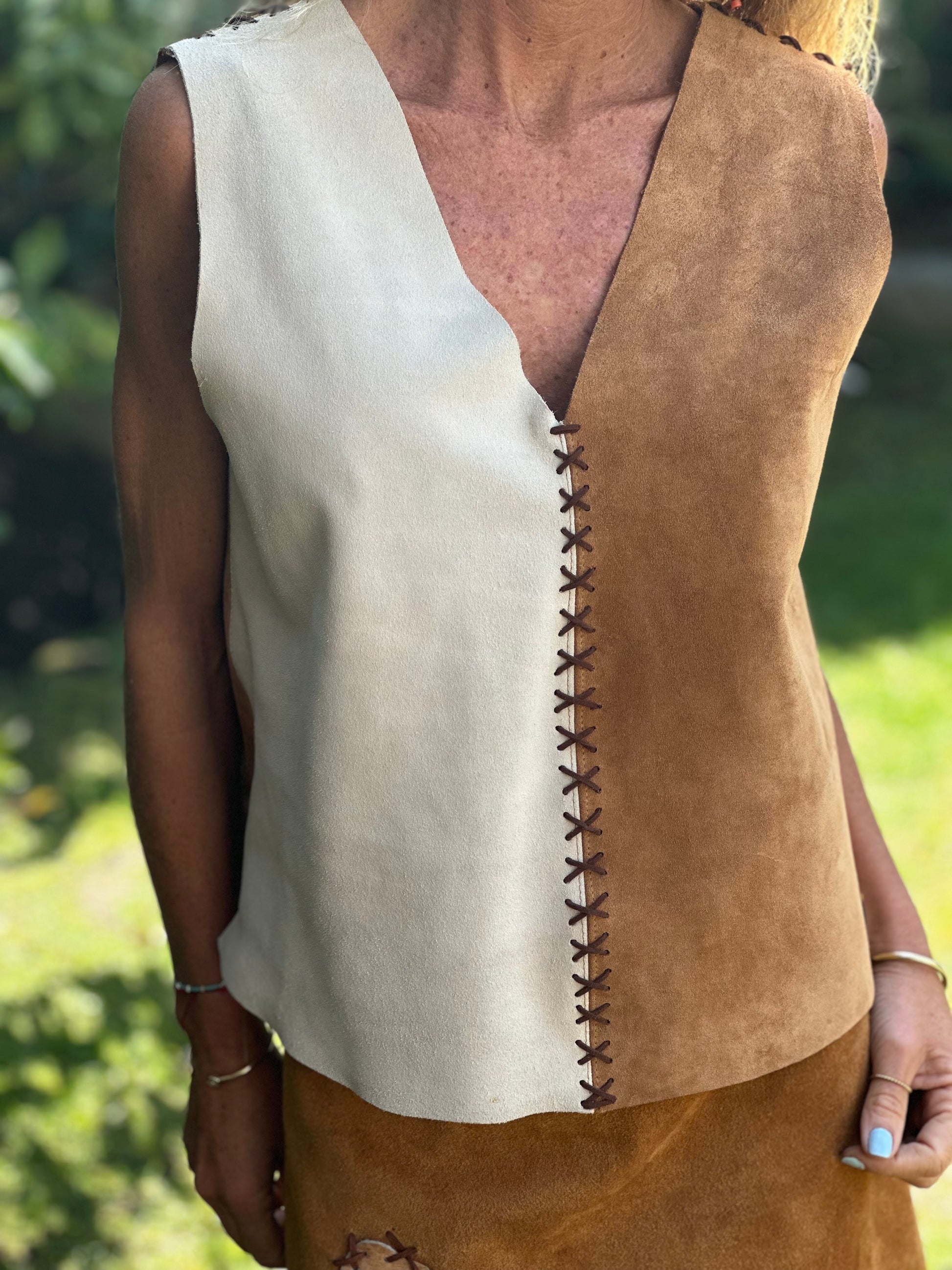 Una combinación de dos gamuzas, en colores pasteles. Tiene su unión con un delicado embarrilado en color café y en su parte trasera, también tiene detalles que le permiten usarlo por ambos lados.