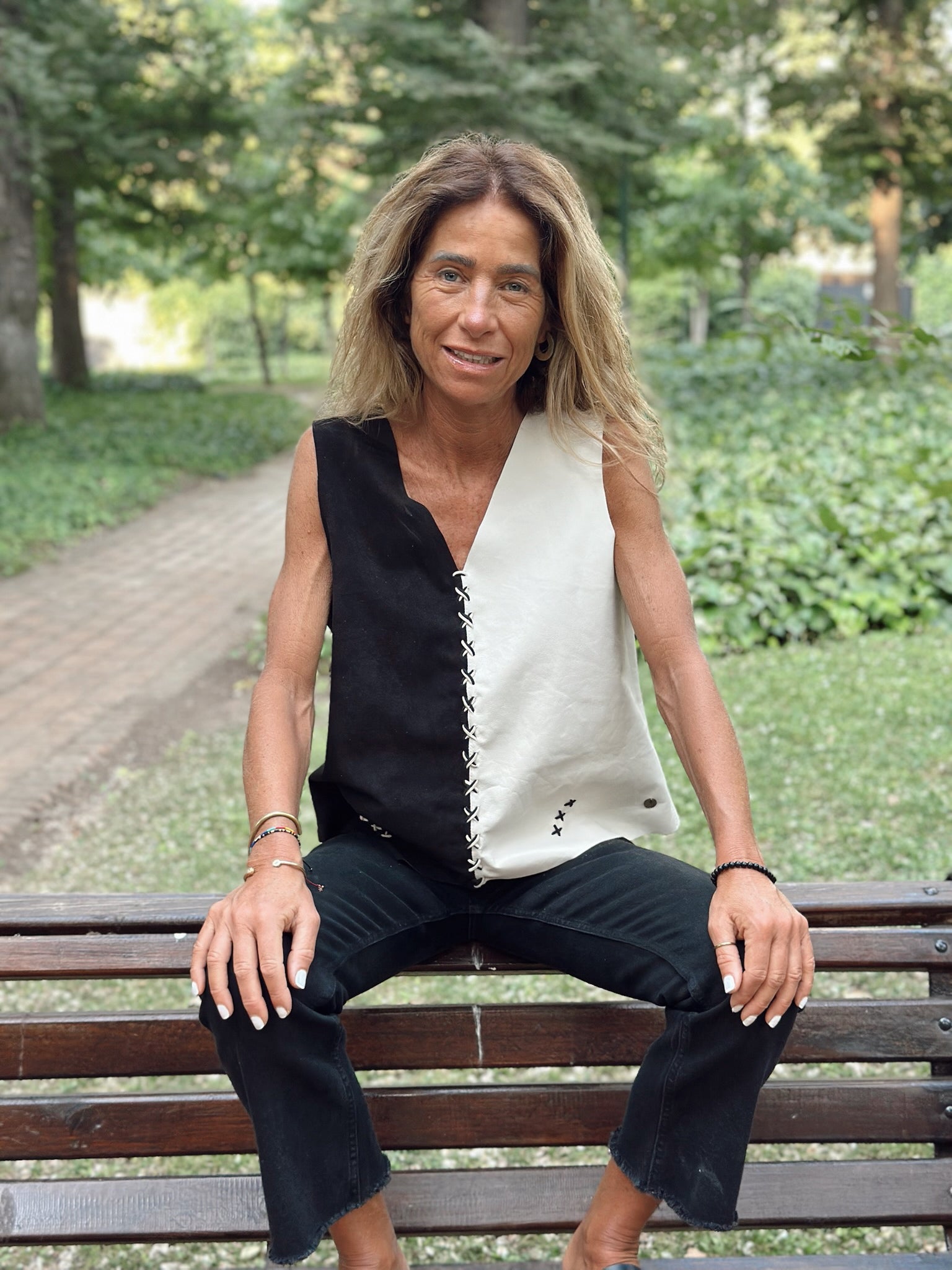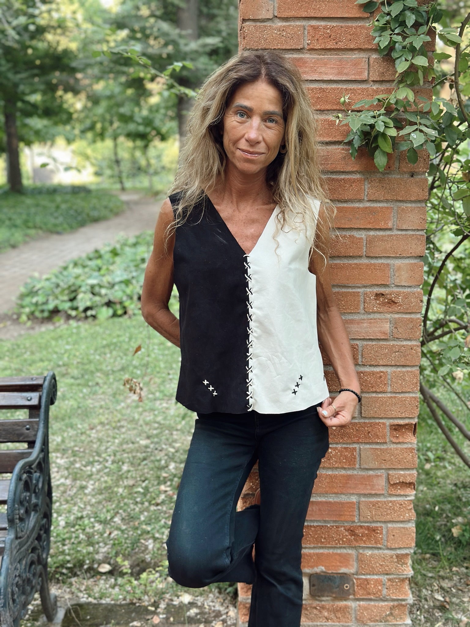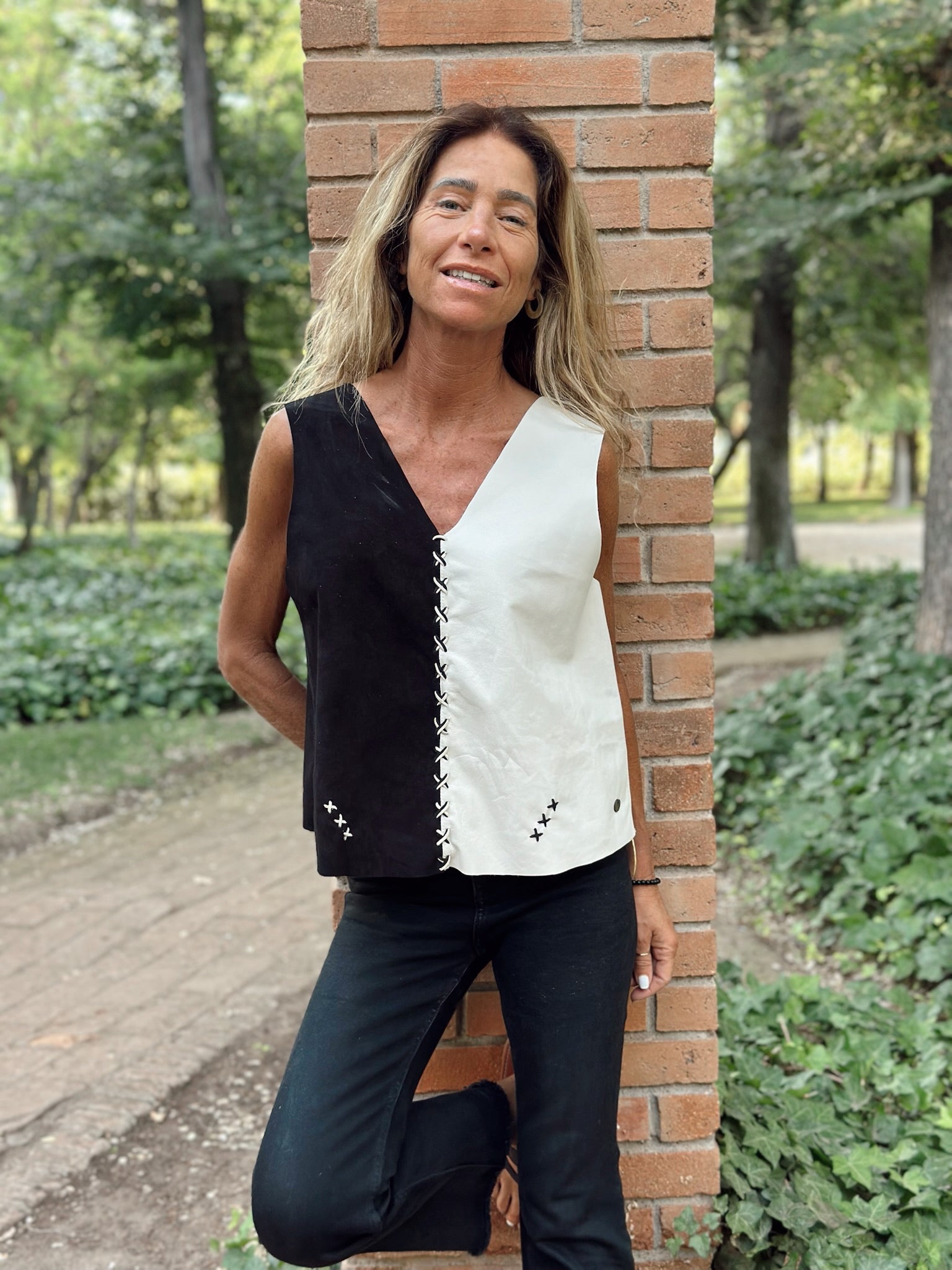 Una combinación de dos gamuzas, en colores negro y crema. Tiene su unión con un delicado embarrilado en los mismos colores en su parte de adelante.