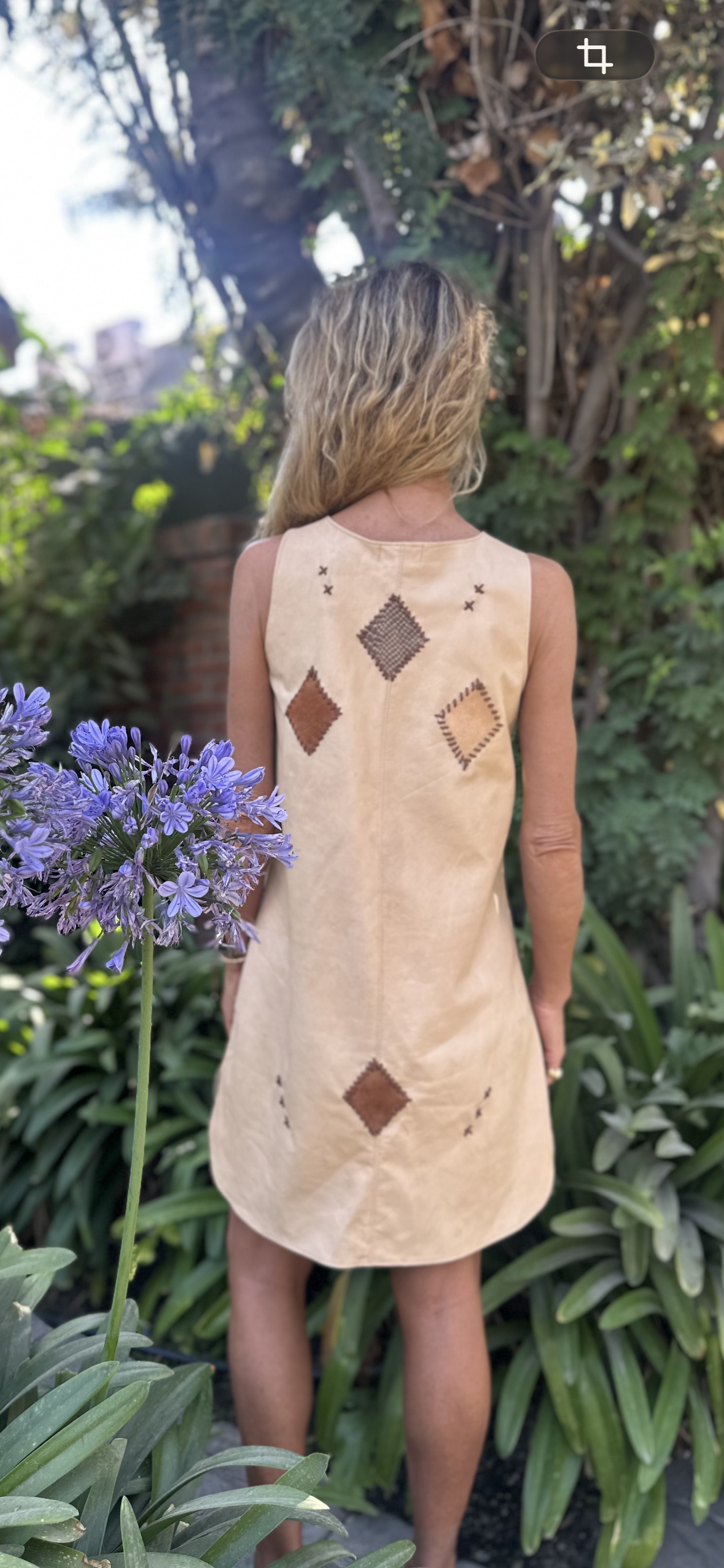 Este vestido Elisa en cuero color crema se puede poner por ambos lados porque tiene diseños adelante como en la parte de atrás. En el frente tiene unos rombos superpuestos de distintas texturas que hacen una mezcla increíble. En su espalda también tiene los mismos colores, pero con otros diseños y además bordados en gamuza color café claro.